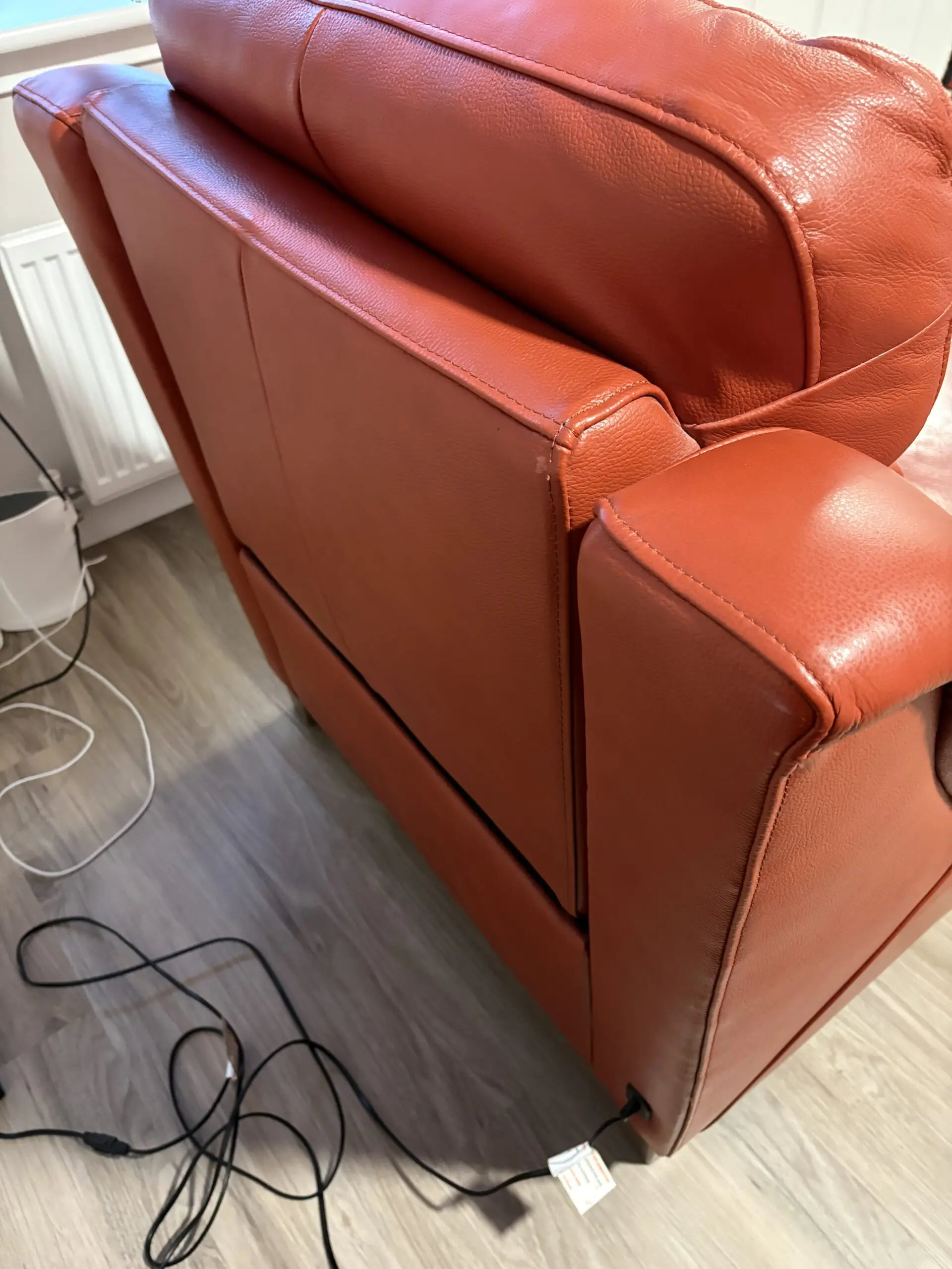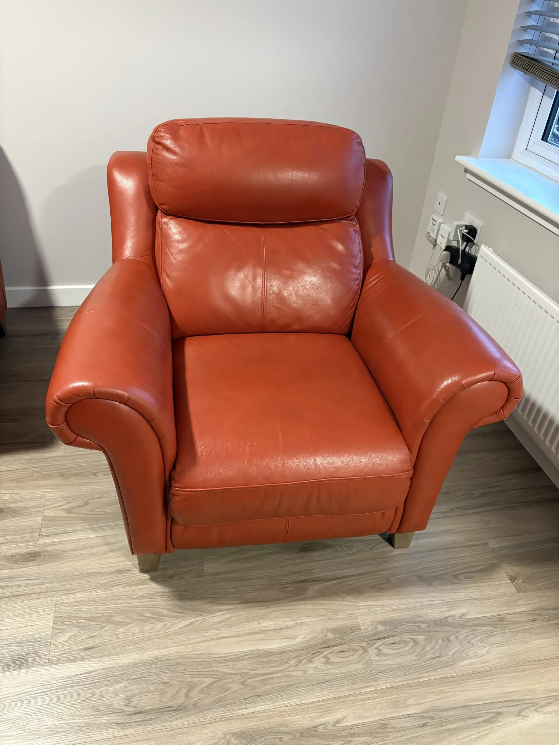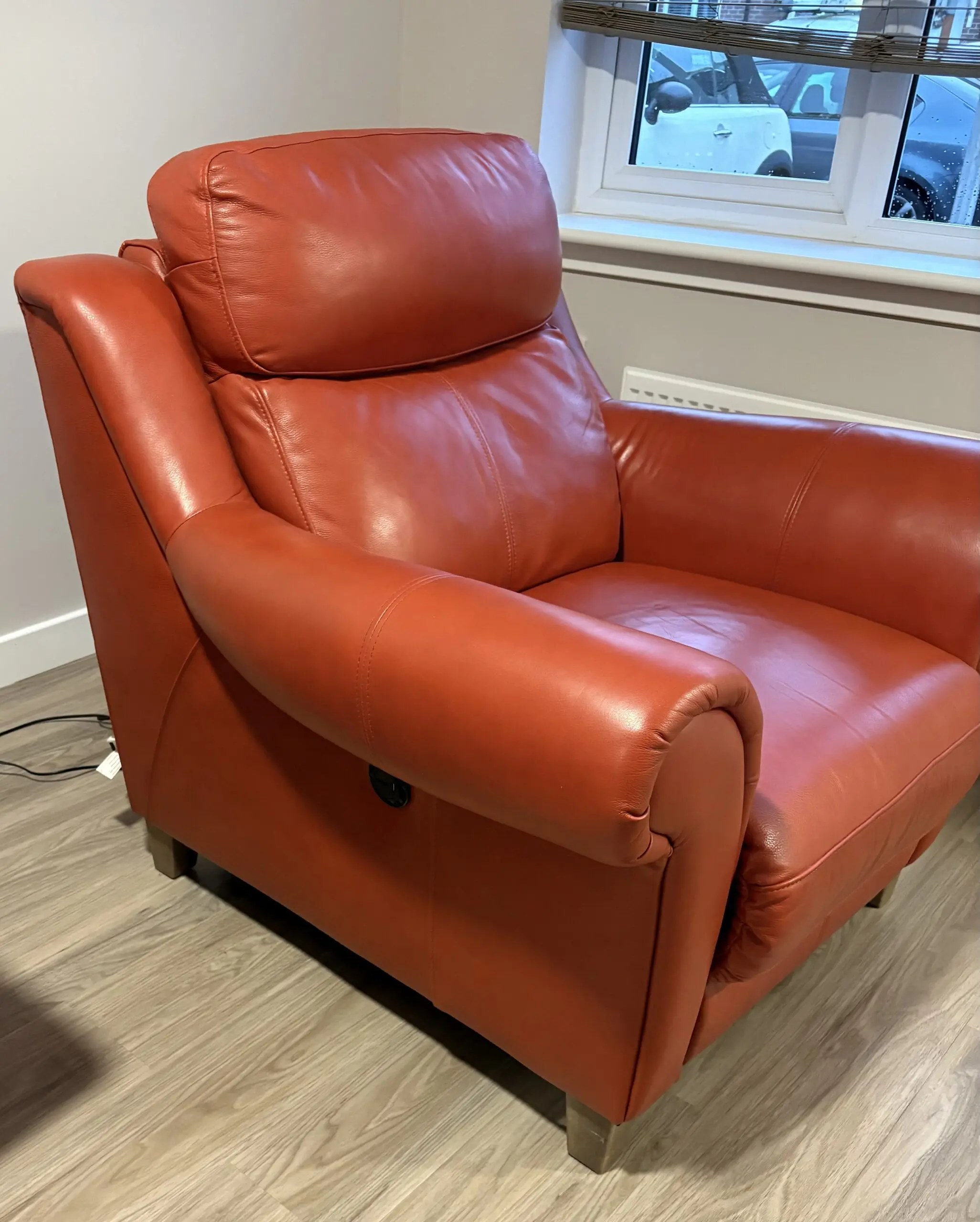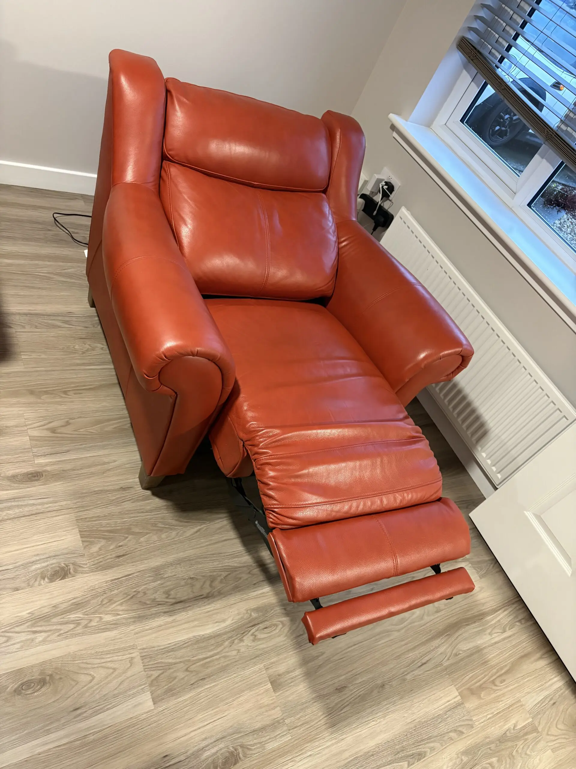 Sofology Holmes leather power recliner chairs in colour:flame (deep burnt orange). Both chairs rarely utilised and like new condition. Fully working power recliner function, very comfortable seating. The power recliner controls are at the side of the chair under the arm rest area. There is a usb port inbuilt into the power recliner controls but the usb’s have not worked after 1 year of use. The chairs have wooden screwed in feet.