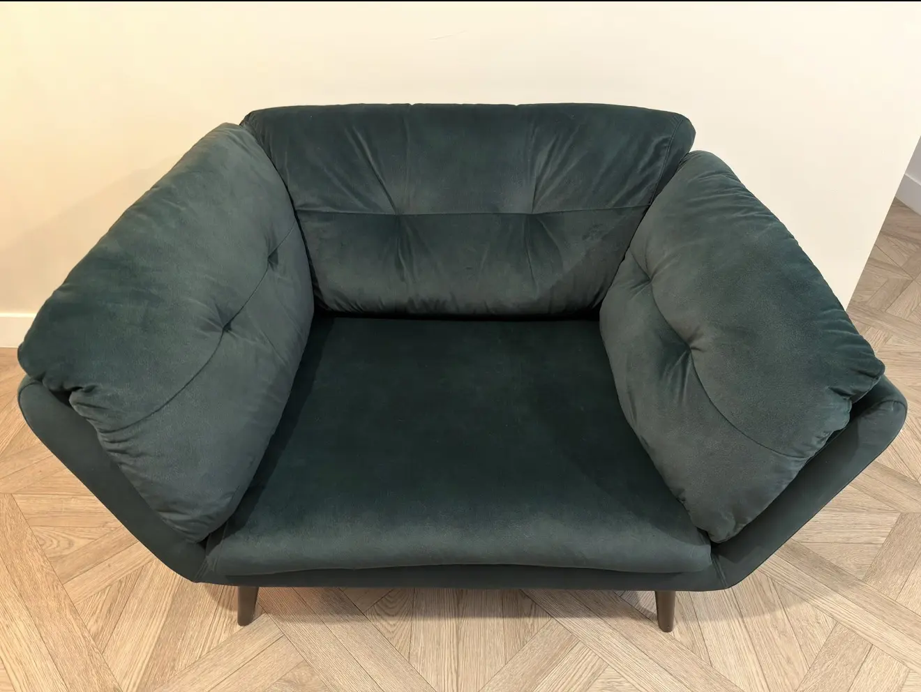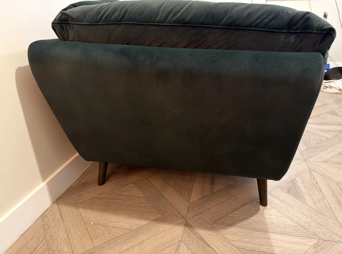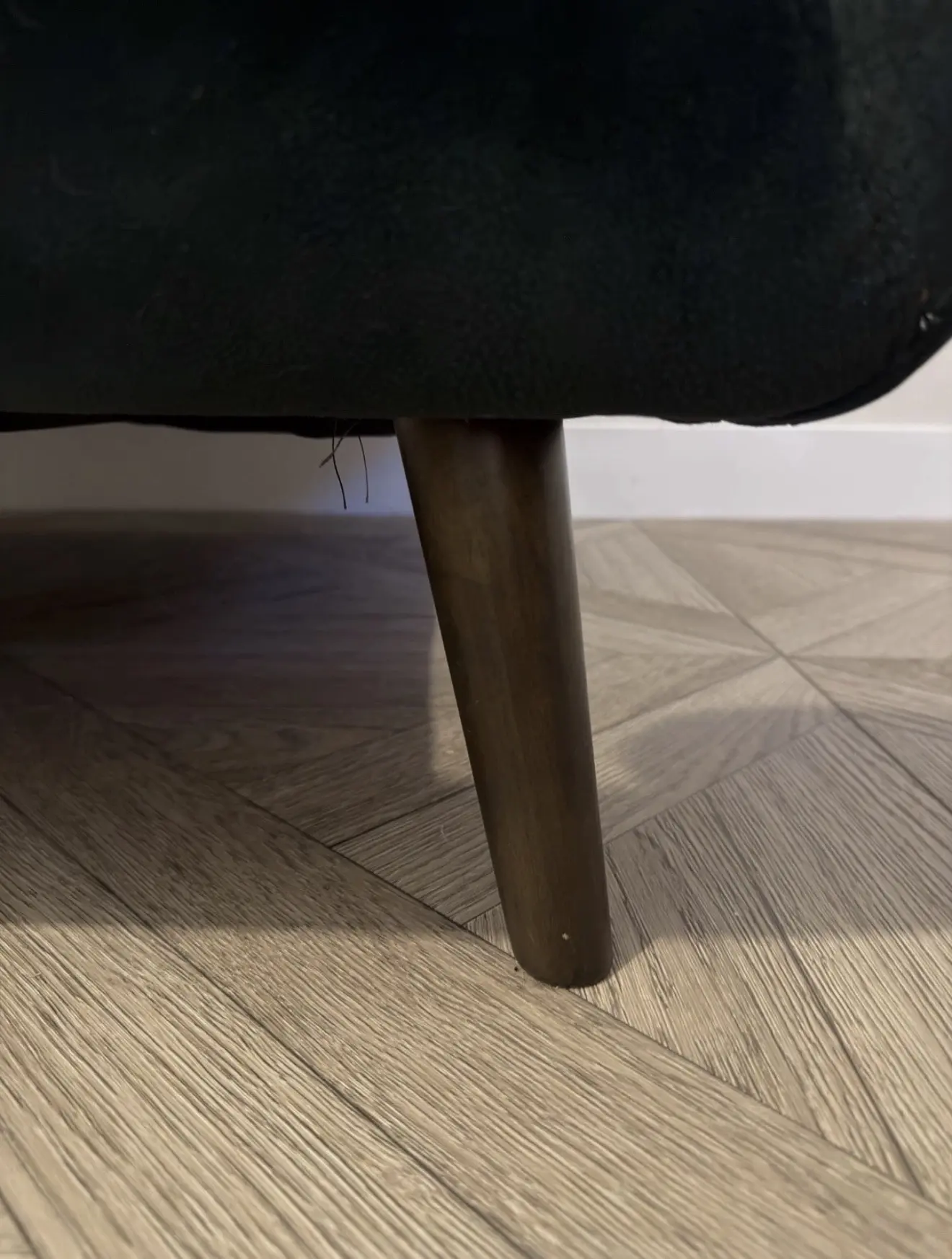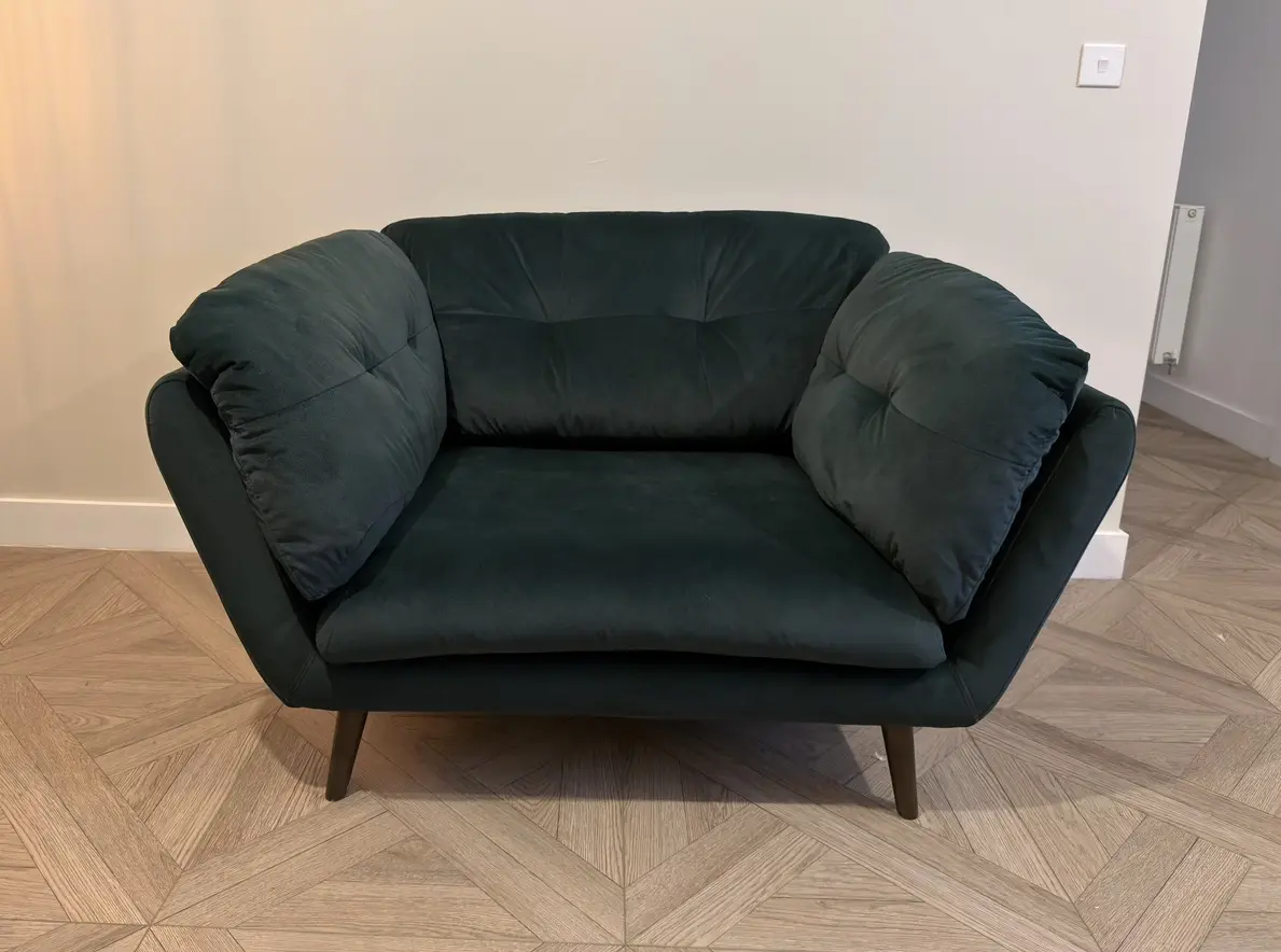 Lifestyle Mottled Fabric Dark Green with Dark Wood Feet.