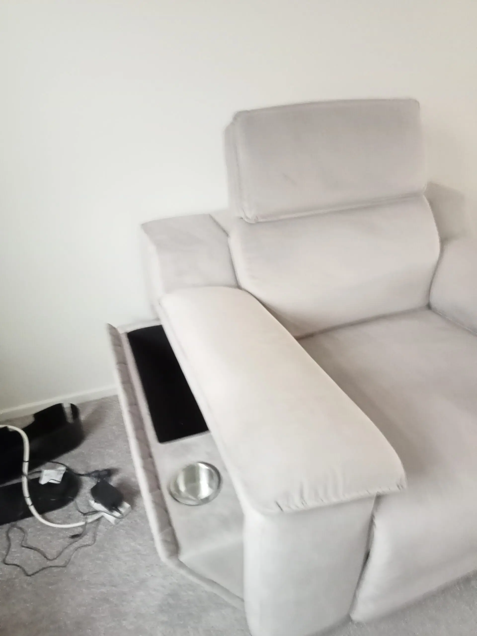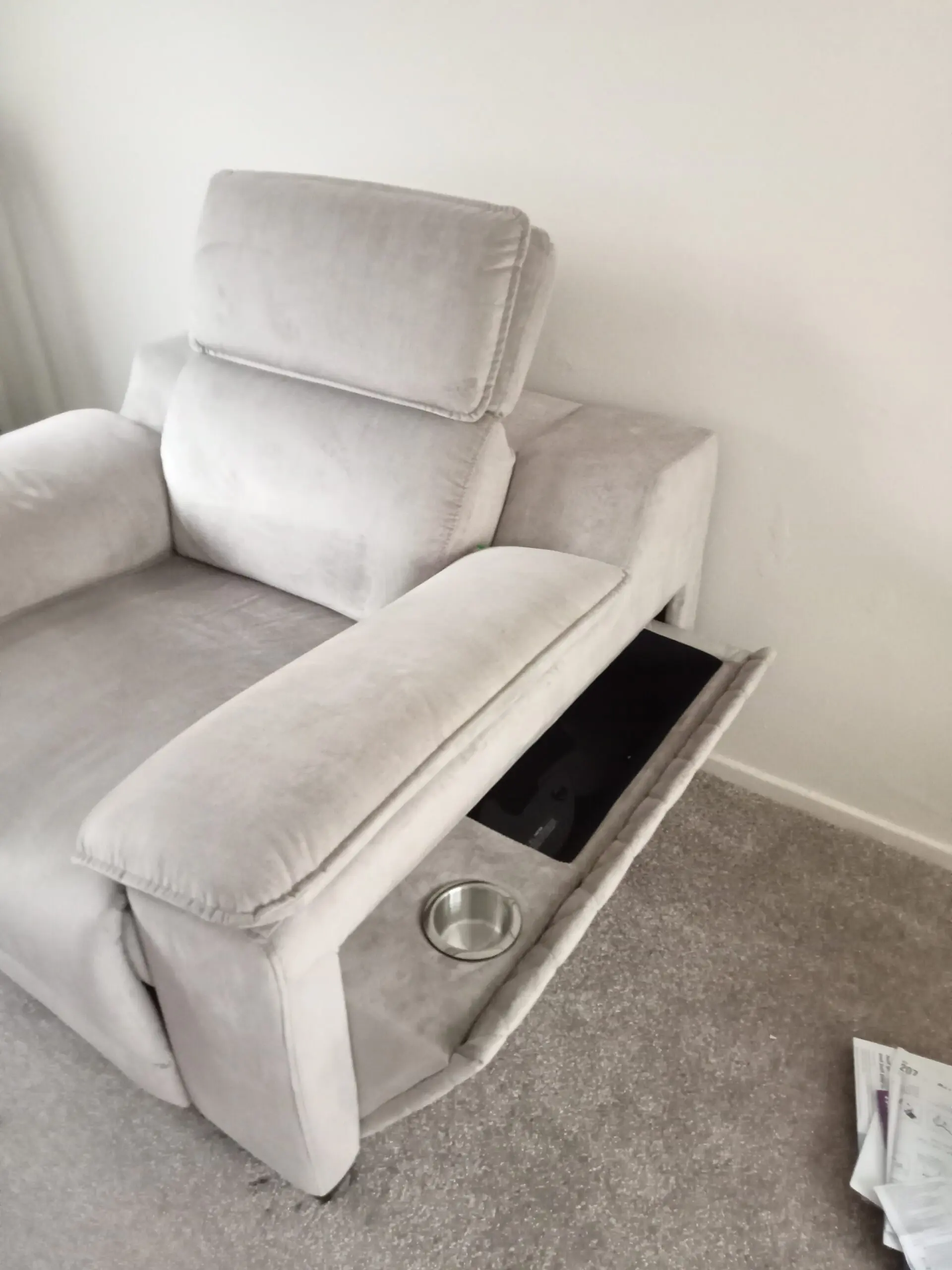 Lovely armchair with storage on both sides, also cup holders, dark wood feet.