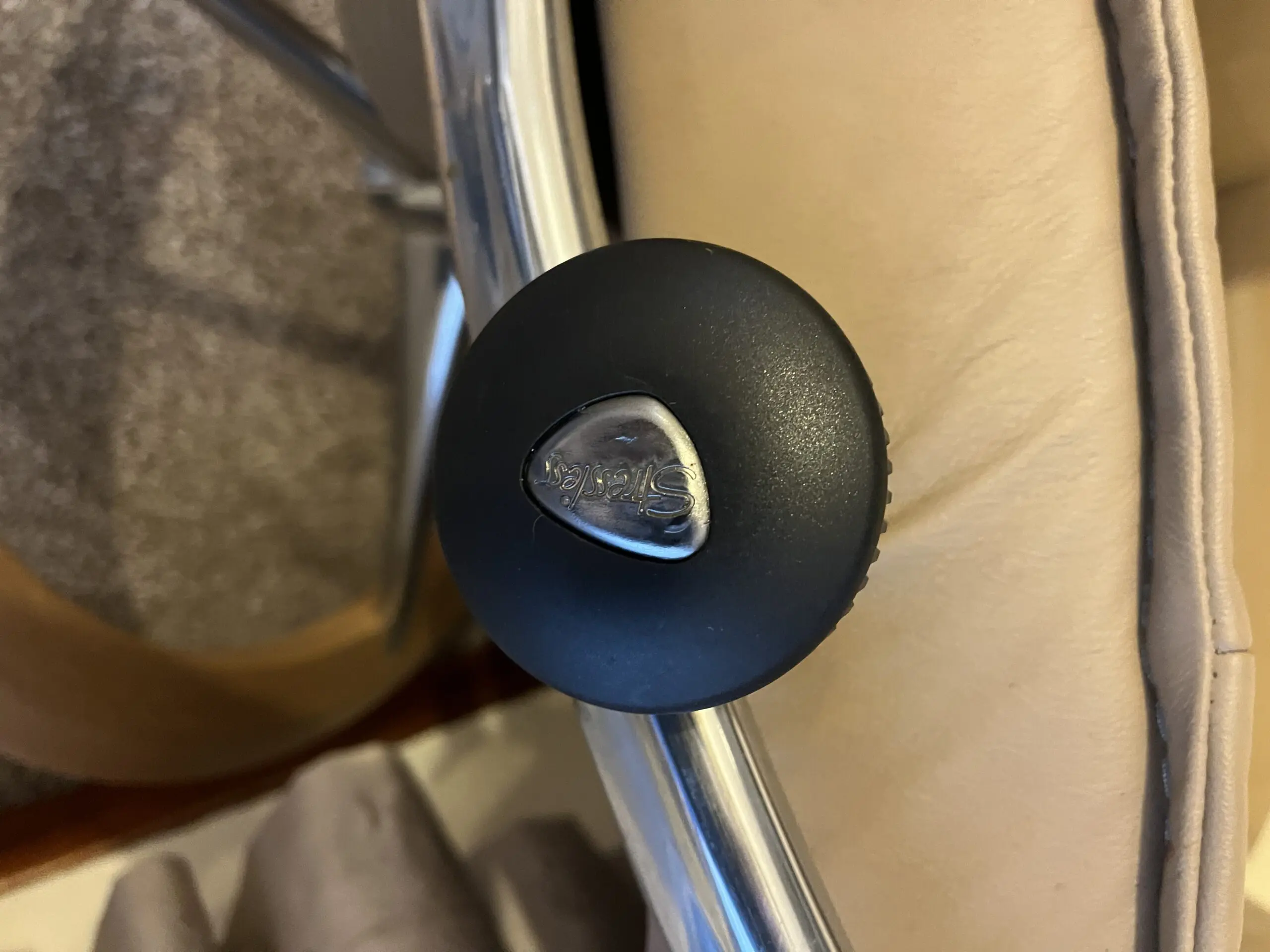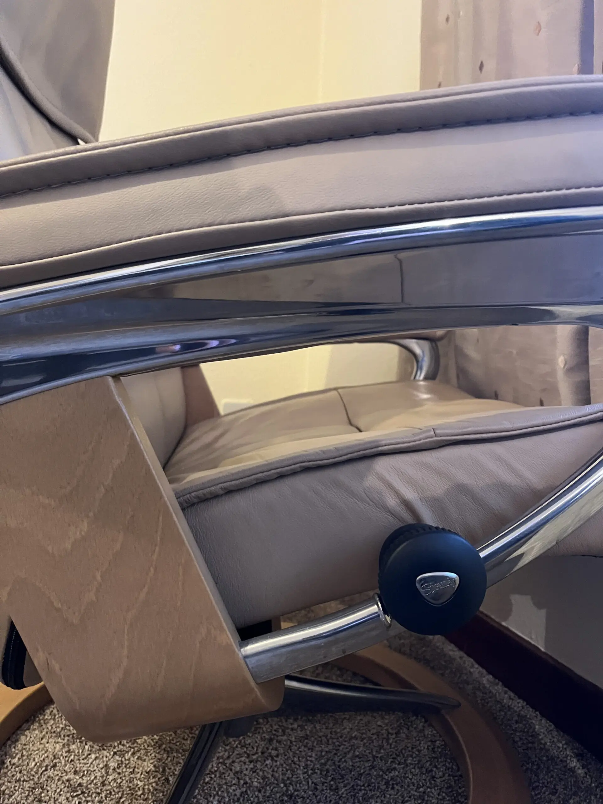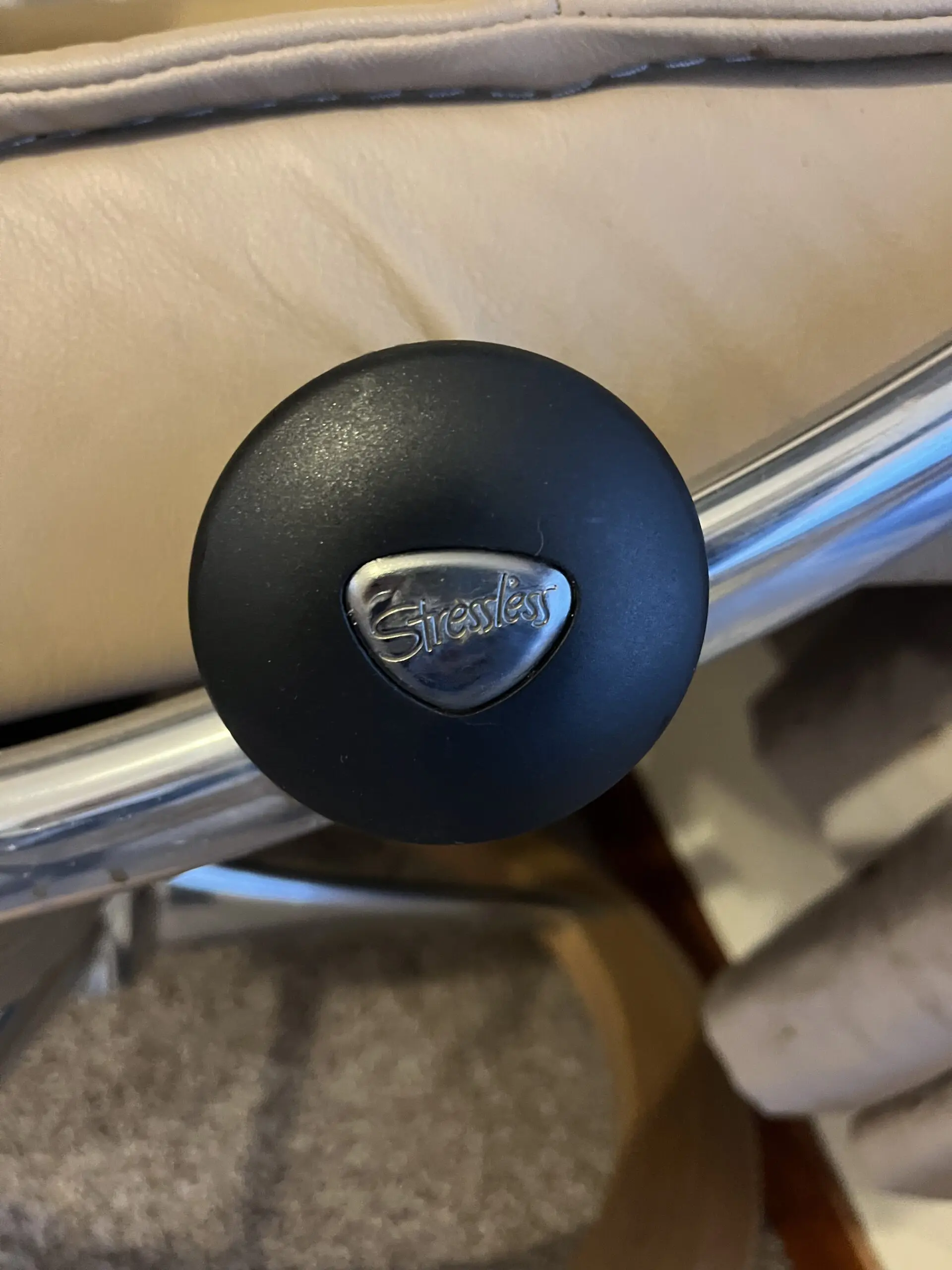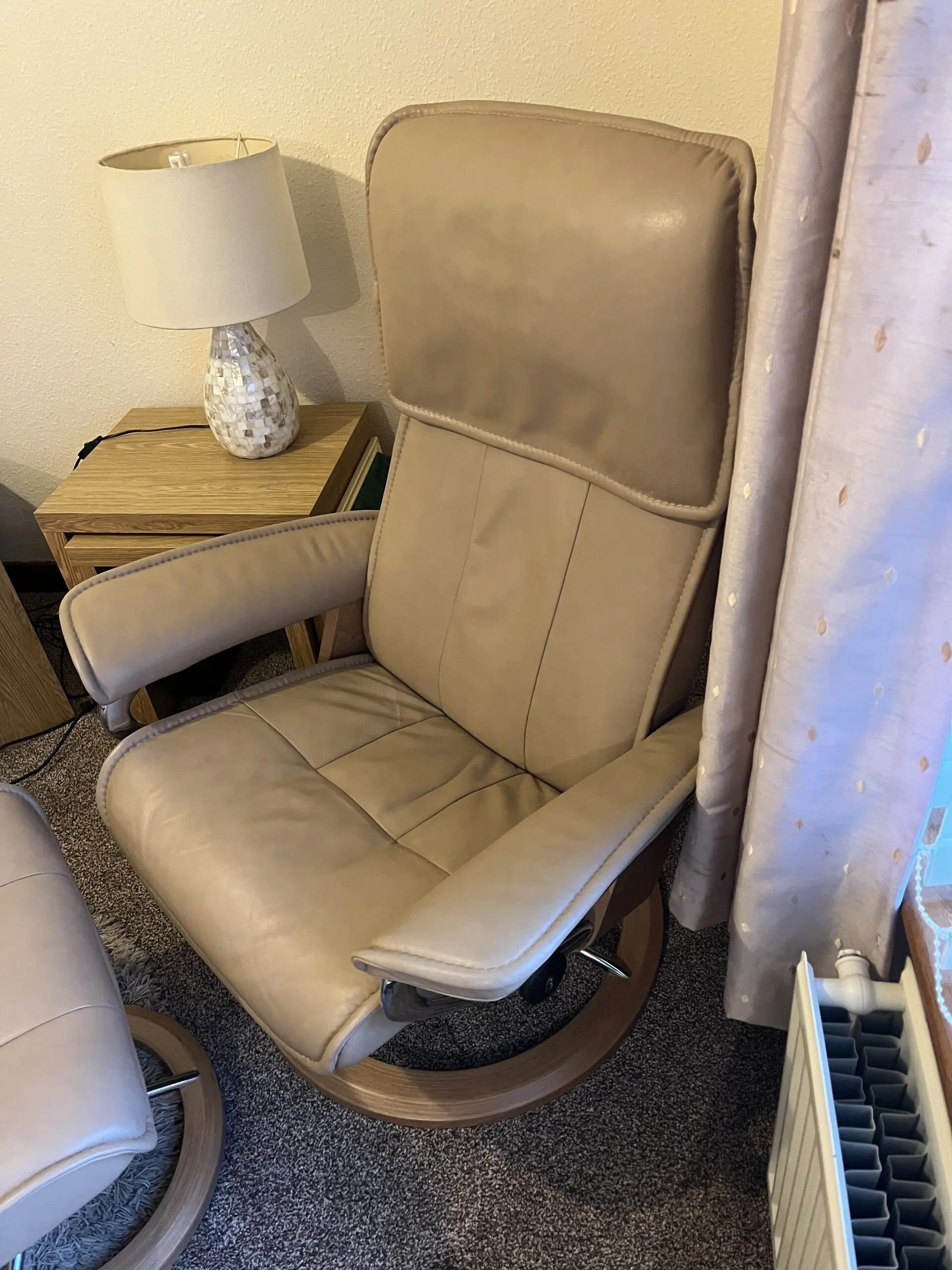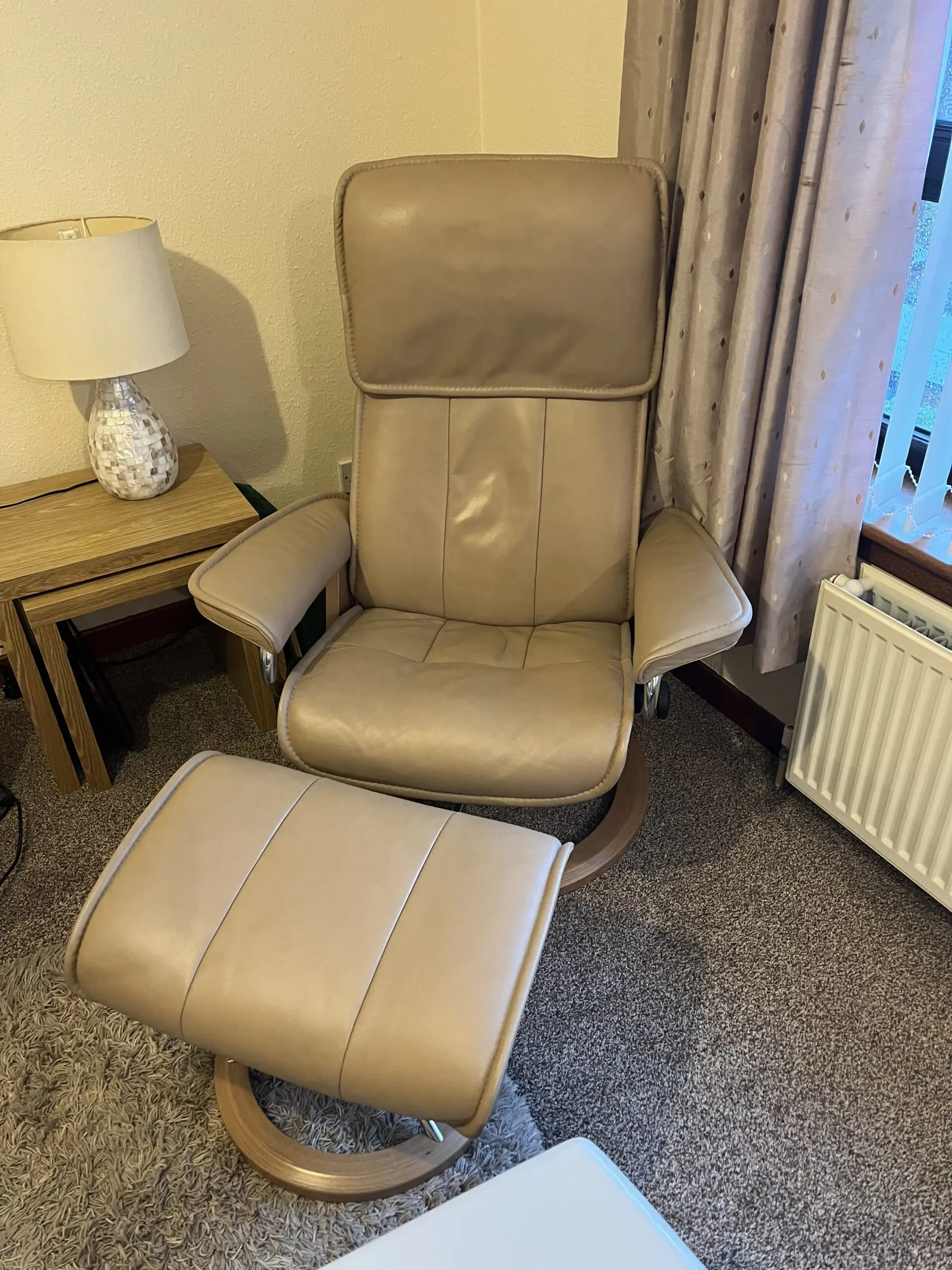 Beige/oatmeal Stressless Consol recliner chair with matching footstool.