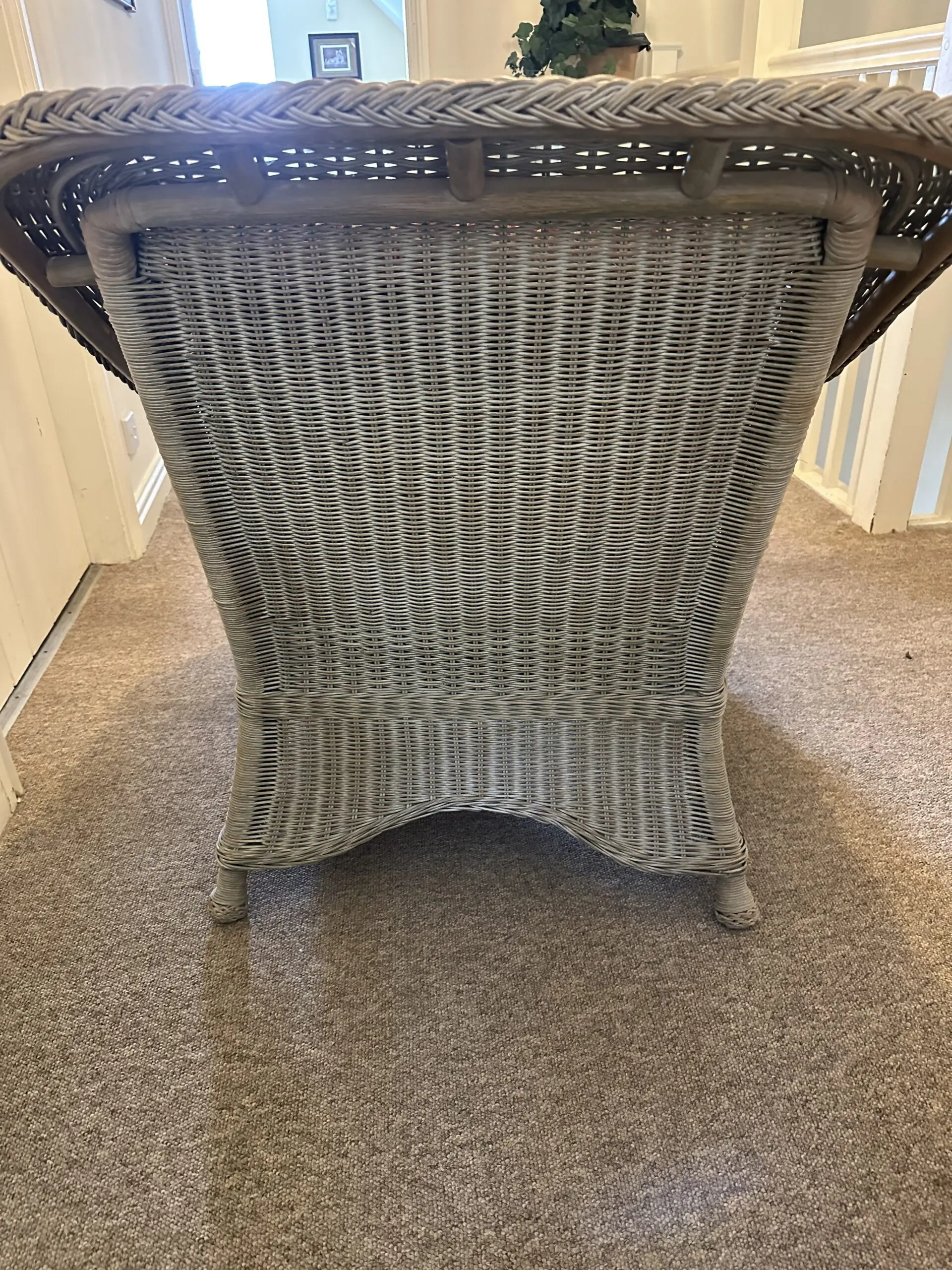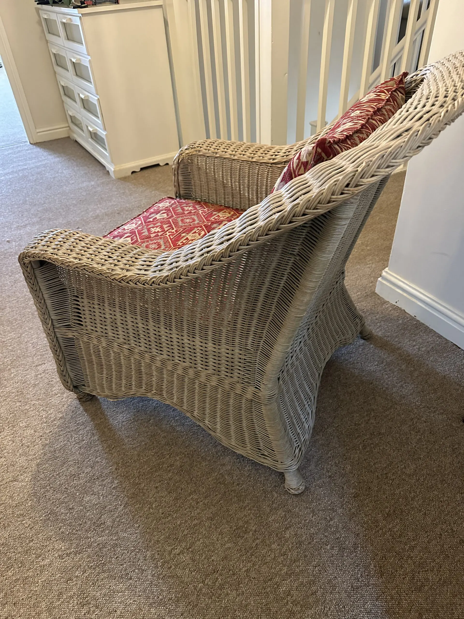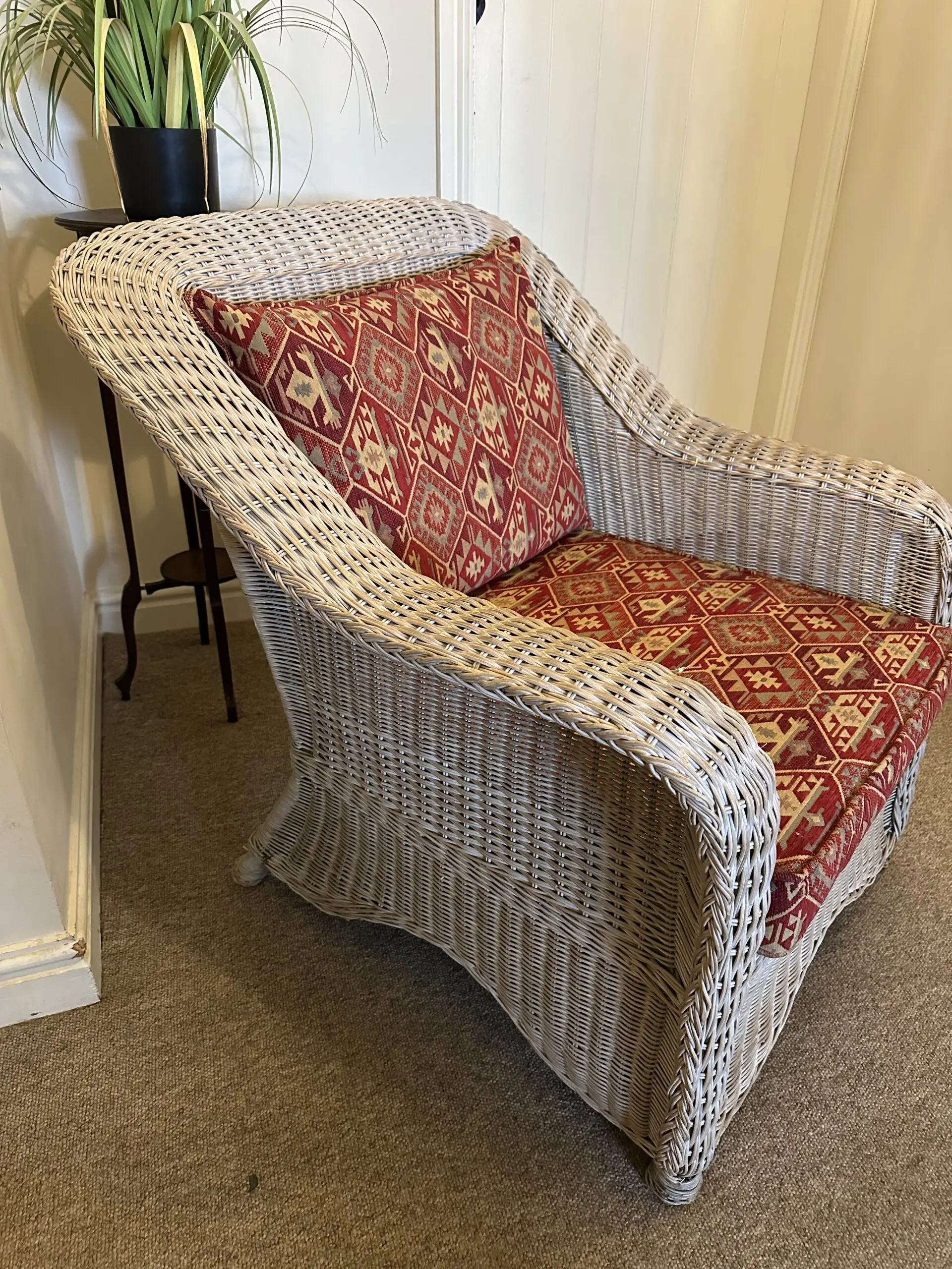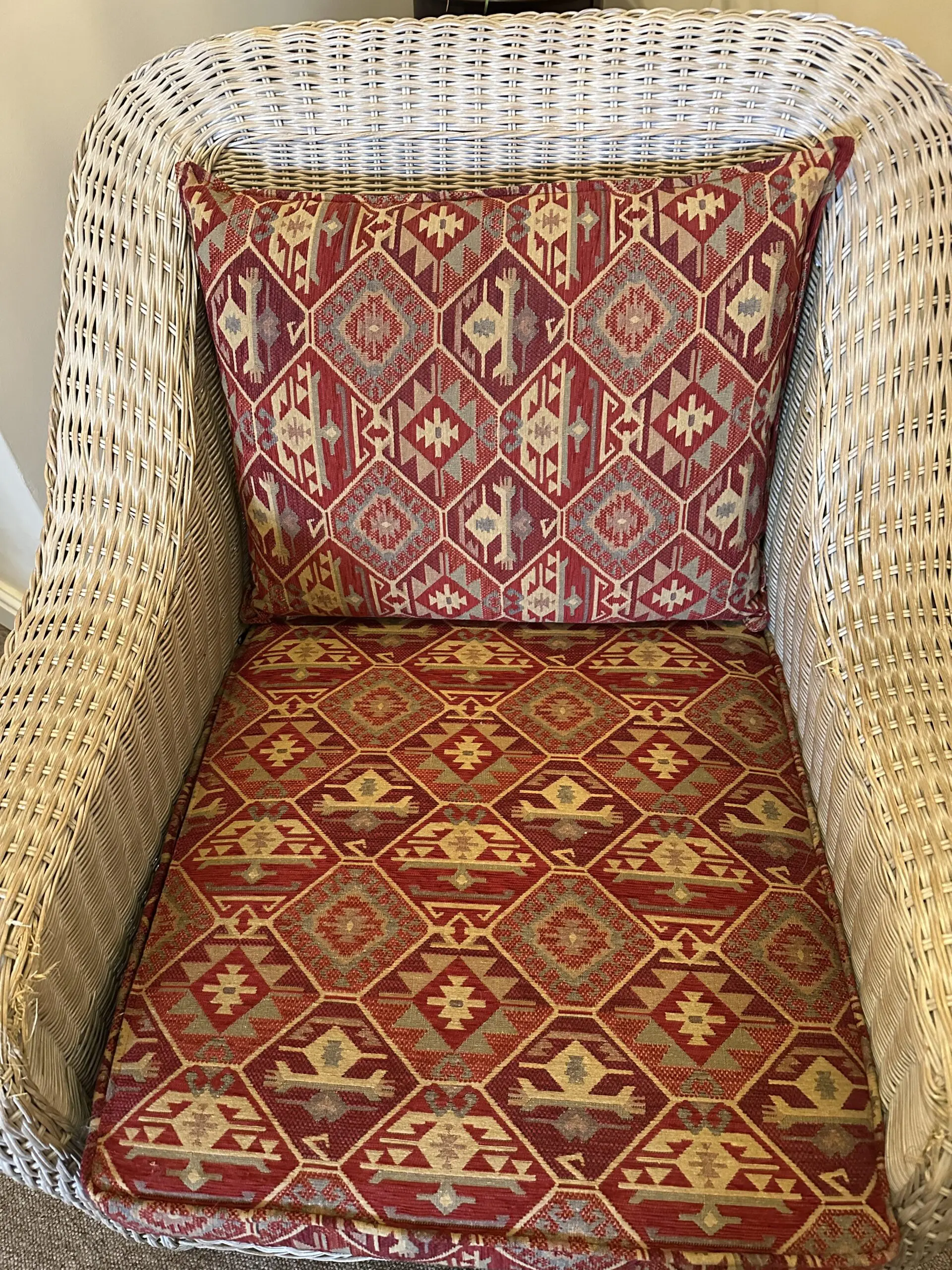 Incredibly comfortable, this broad and deep seat whitewashed rattan chair features supportive red and gold chenille fabric in an Aztec design.