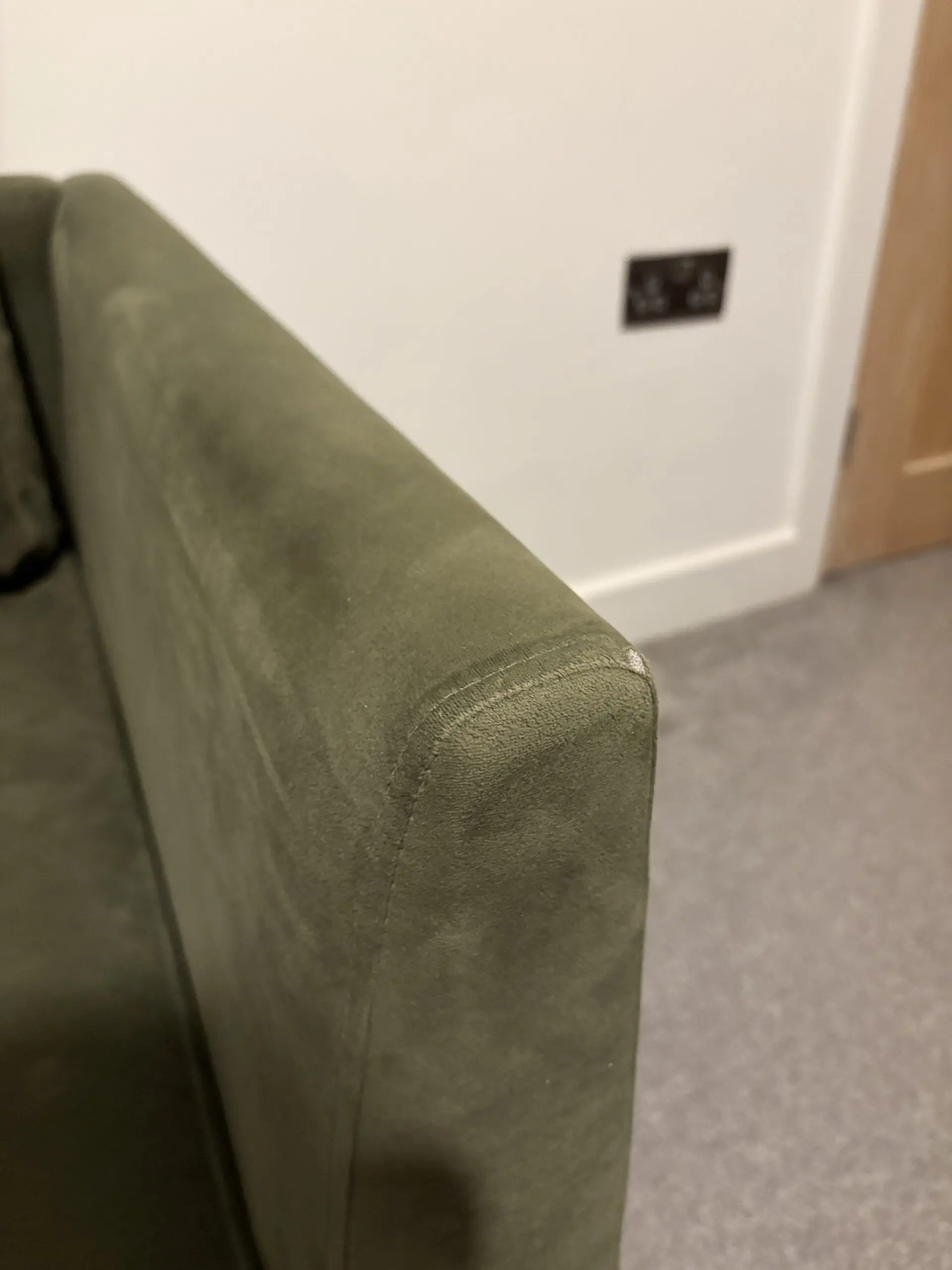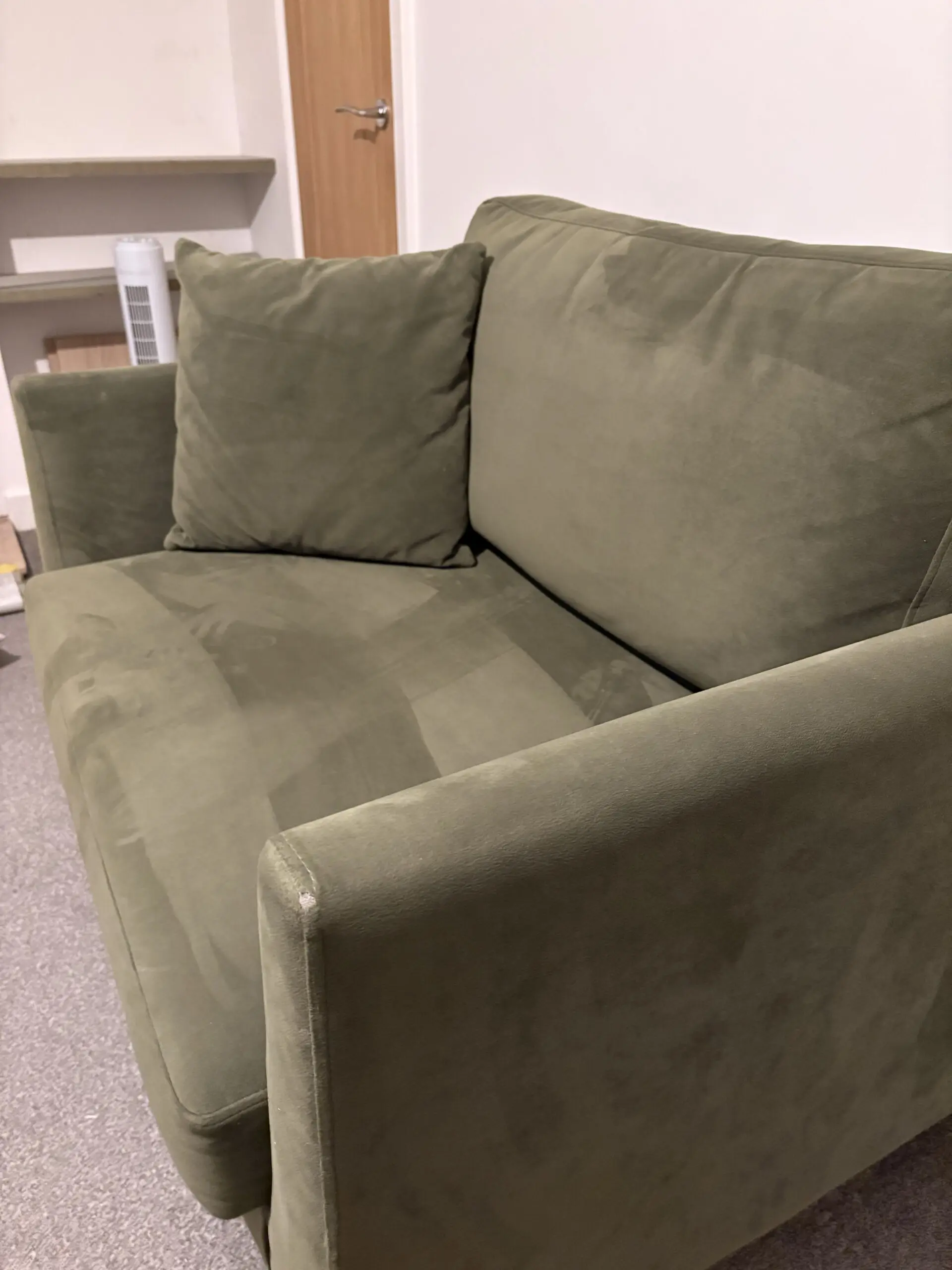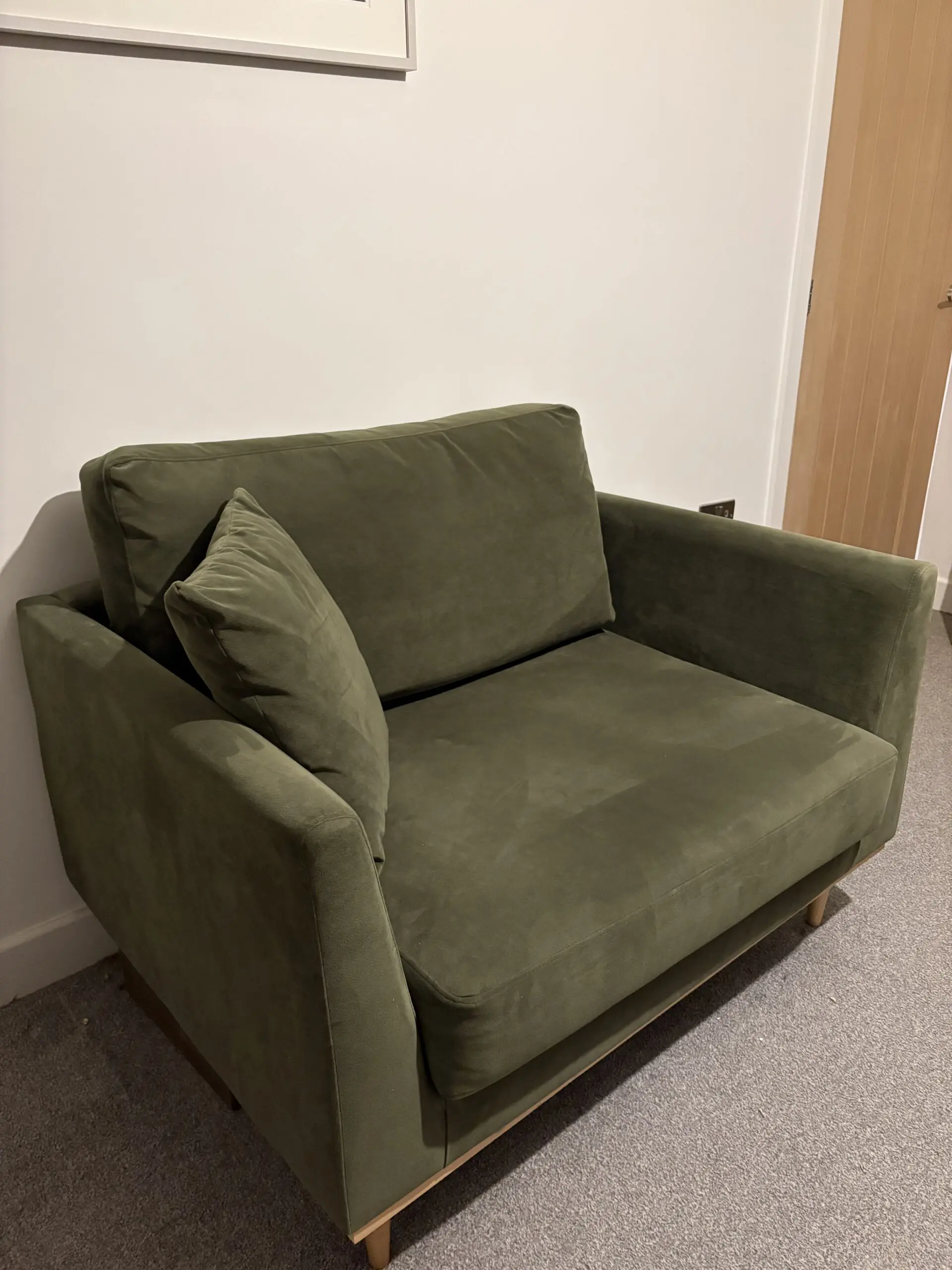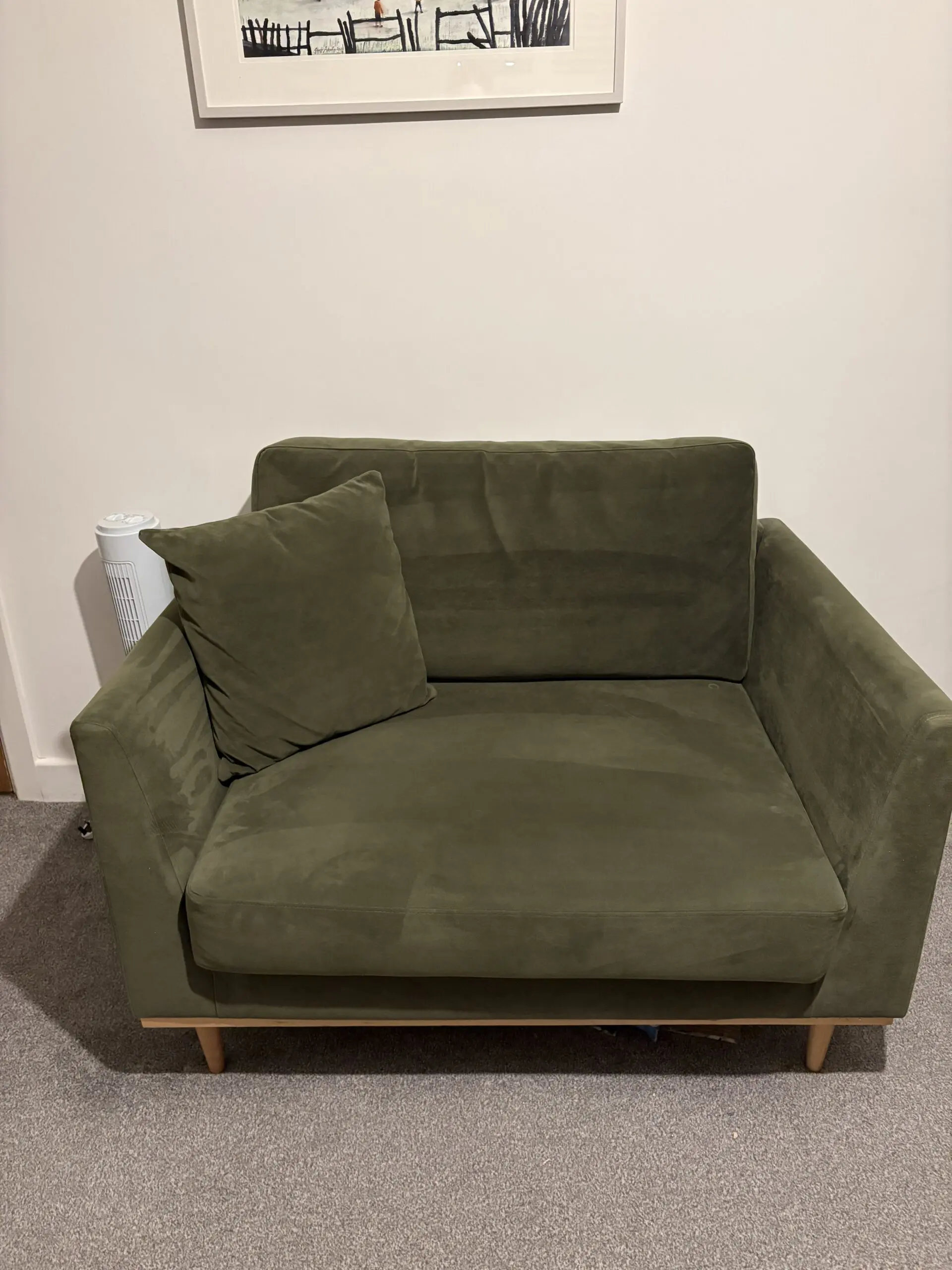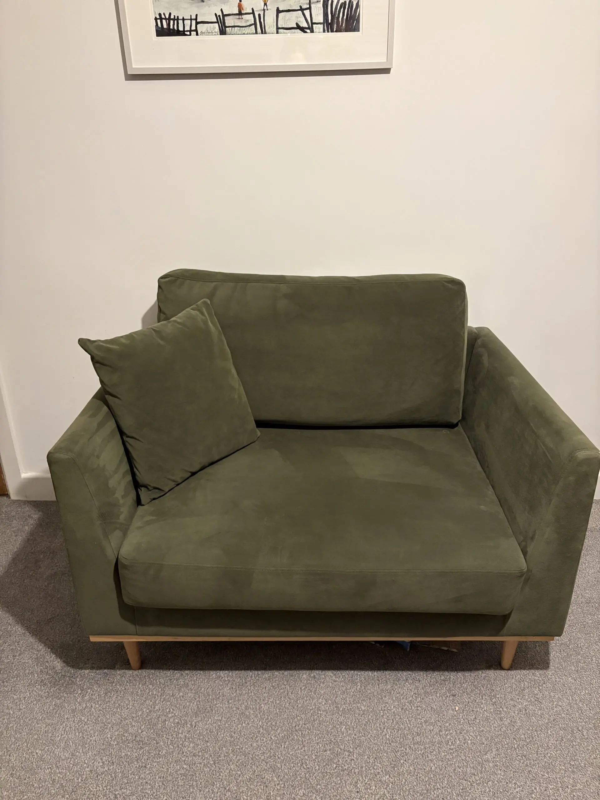 Beautiful Swoon loveseat in Olive Green. One small mark on end of left arm, not noticeable (see pictures for detail) otherwise in near new condition.