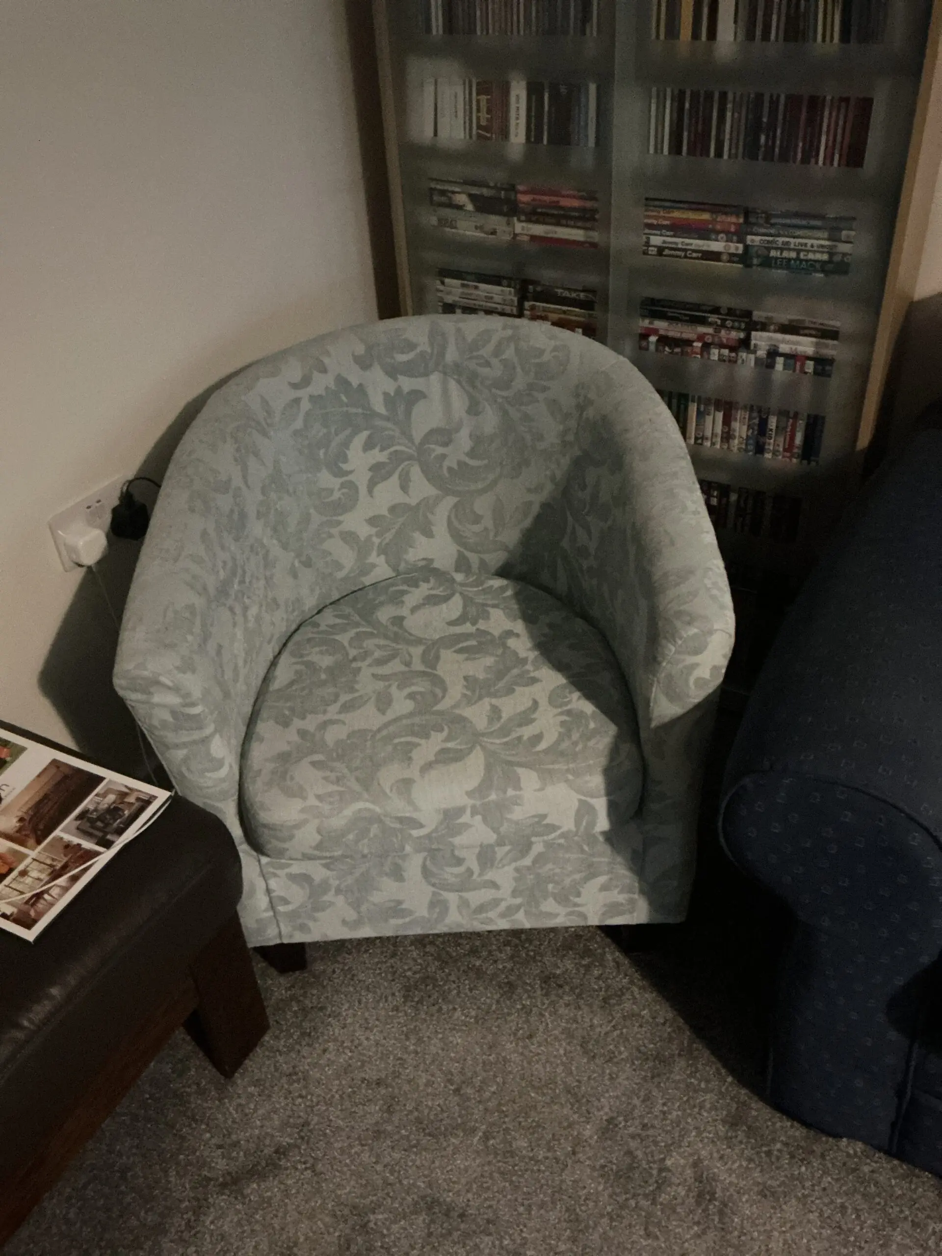 Tub chair in blue with a floral design. Very clean with no staining to fabric.
