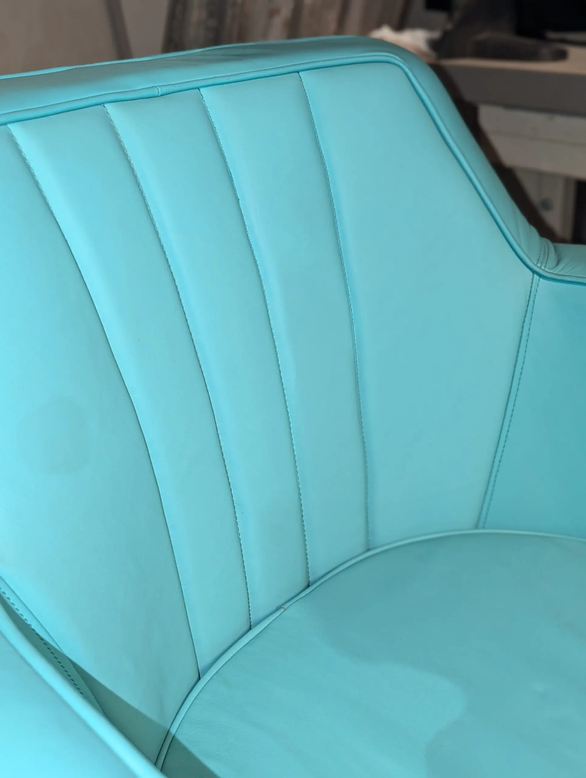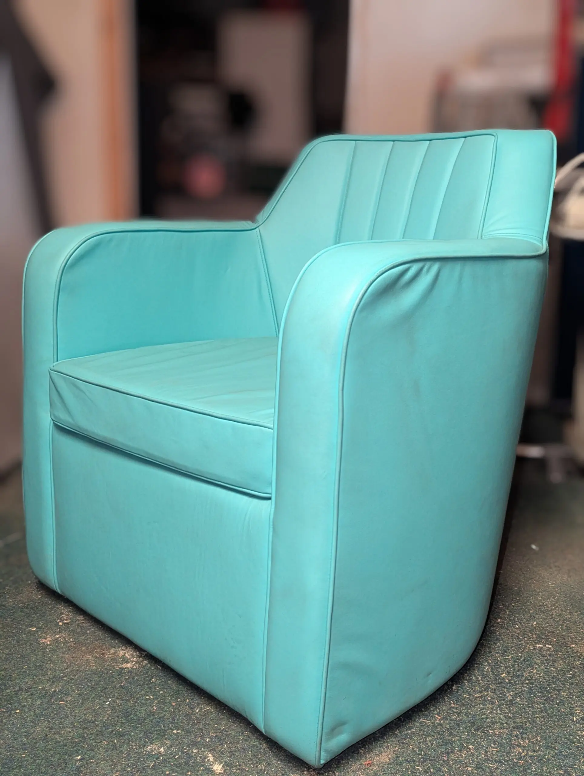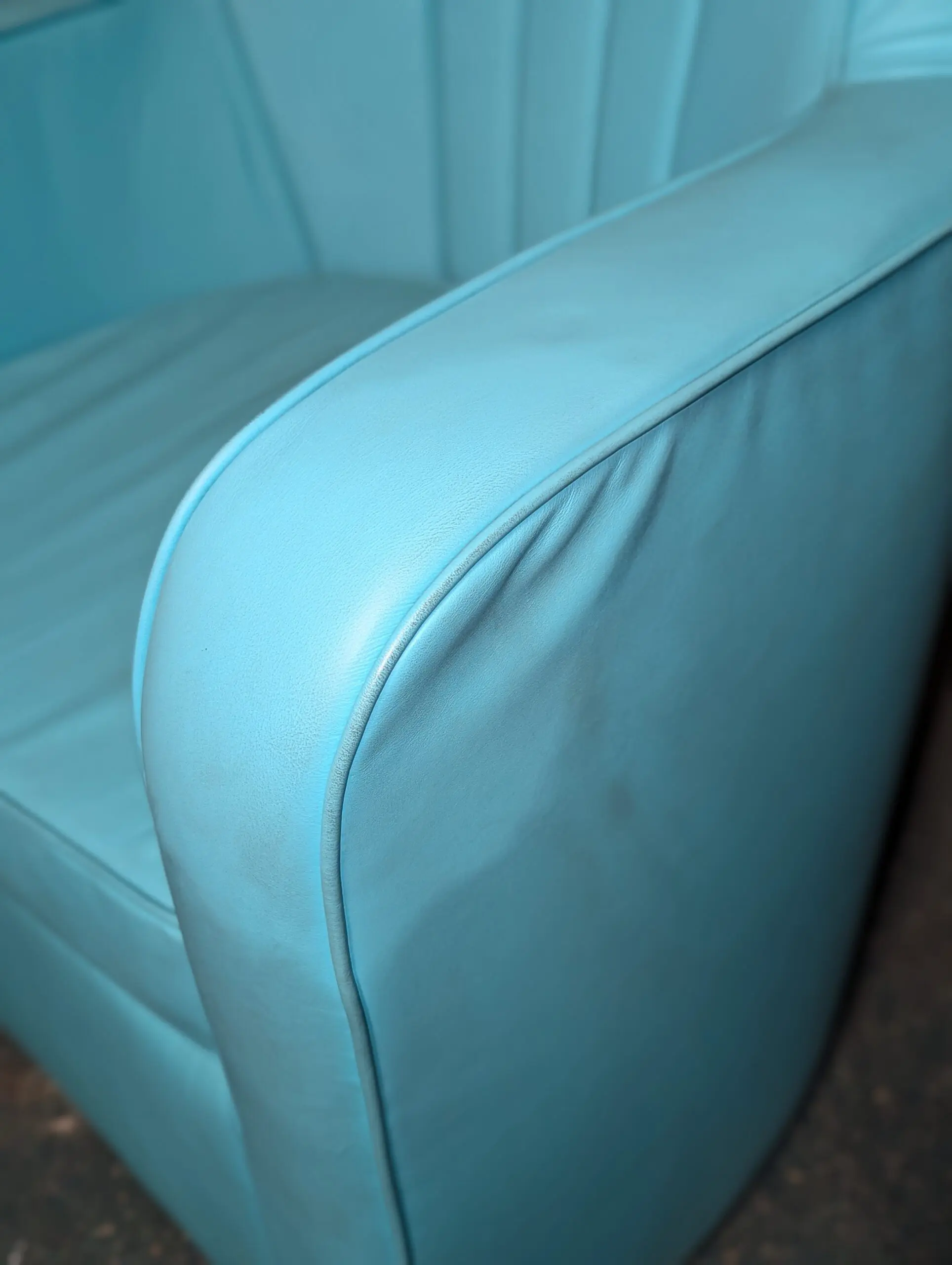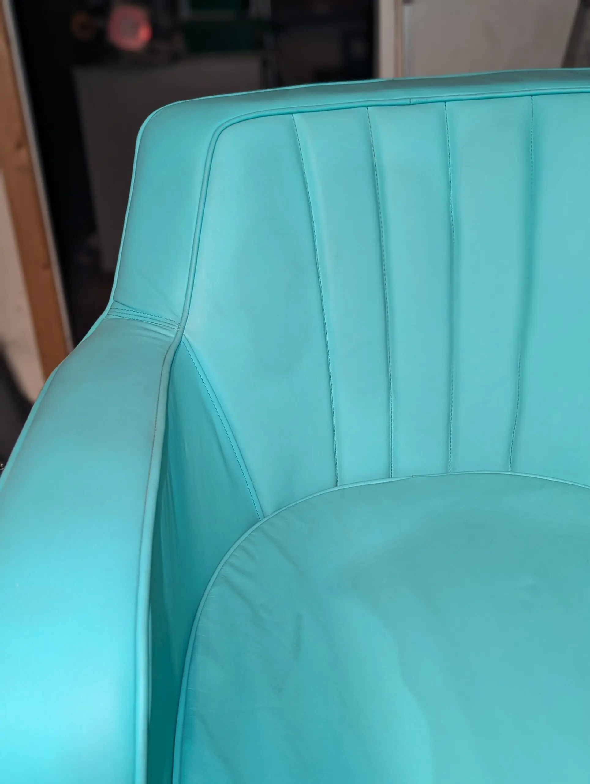 Striking turquoise accent armchair in a high-quality leather, featuring a curved silhouette with refined vertical stitch detailing and a generously padded seat for lasting comfort.