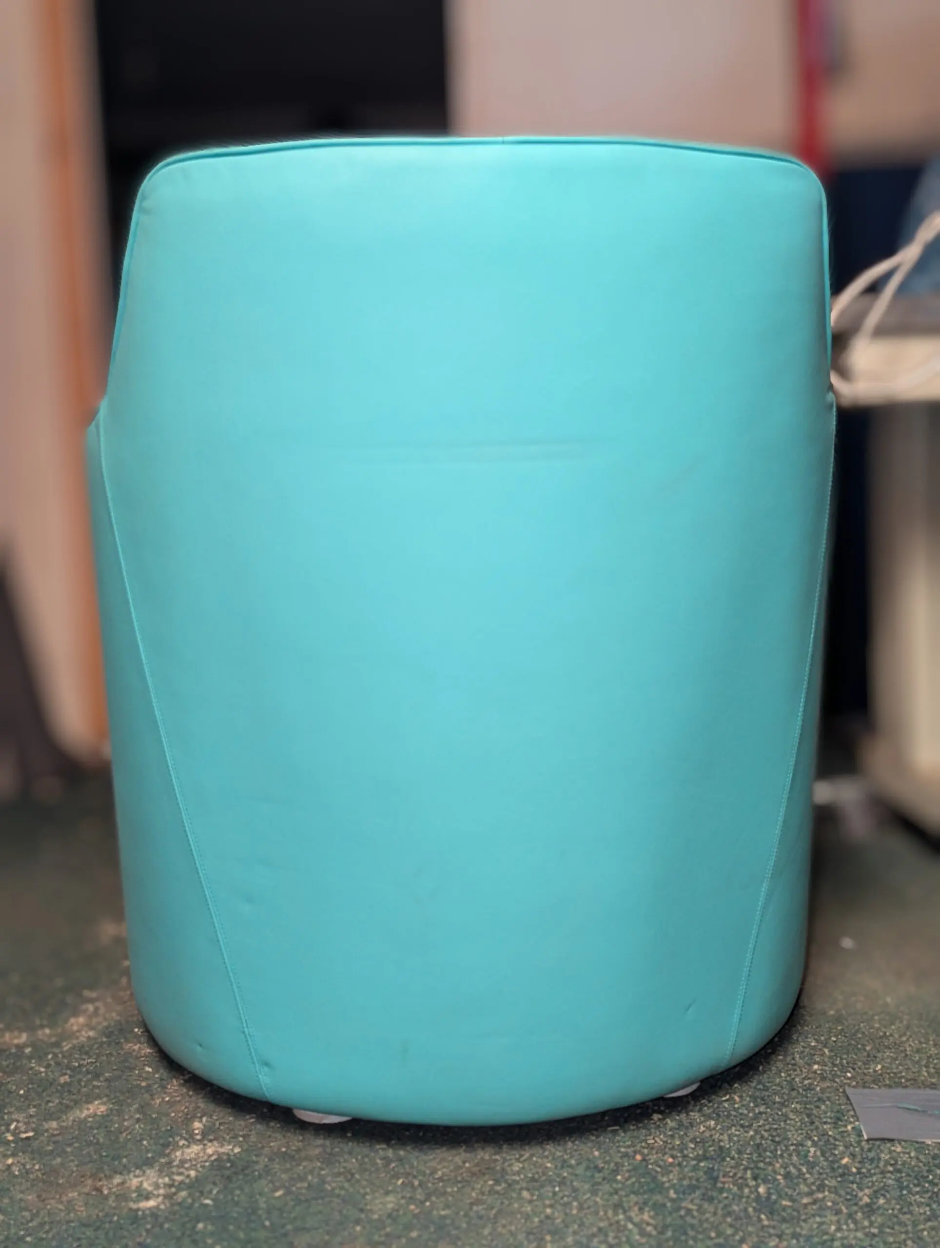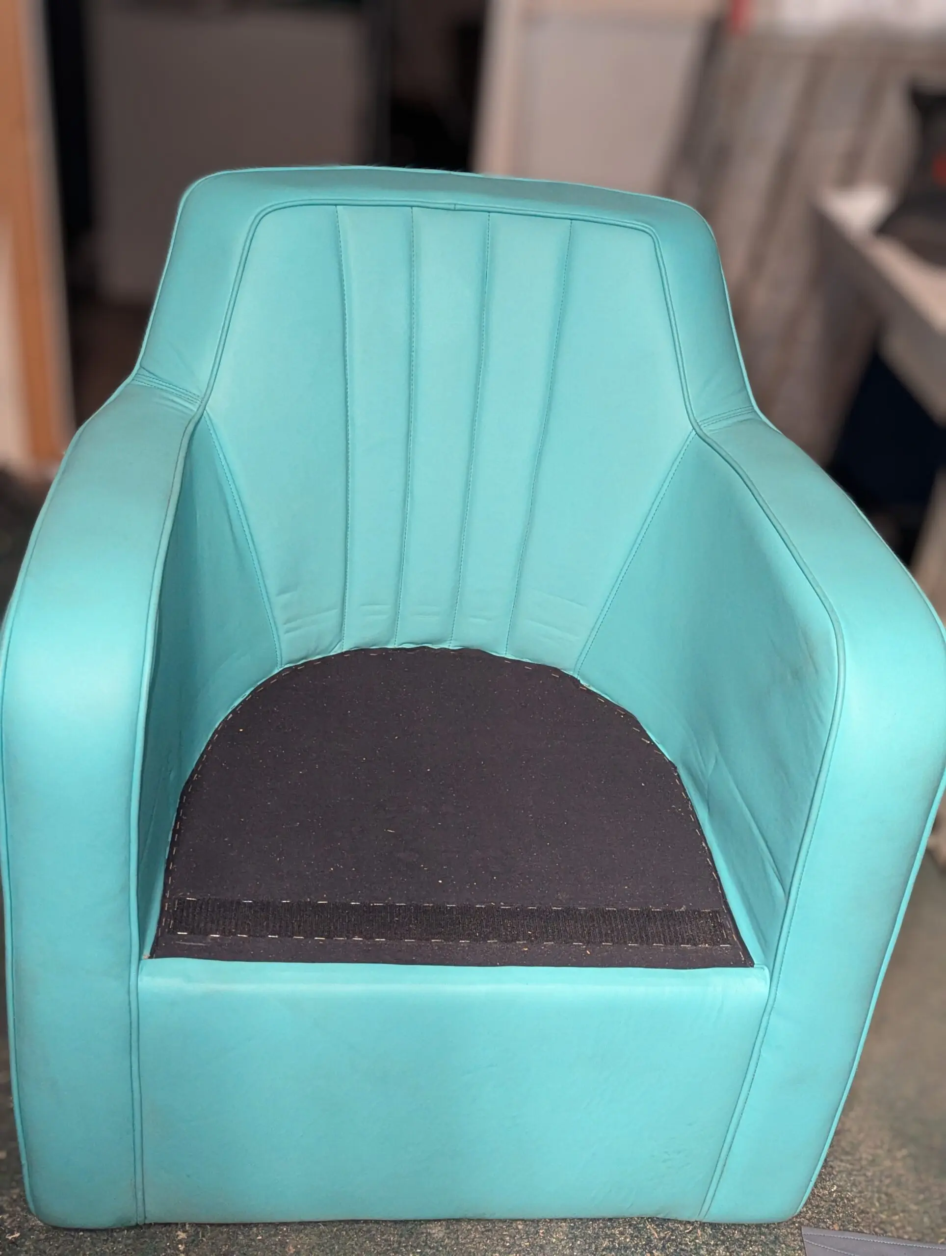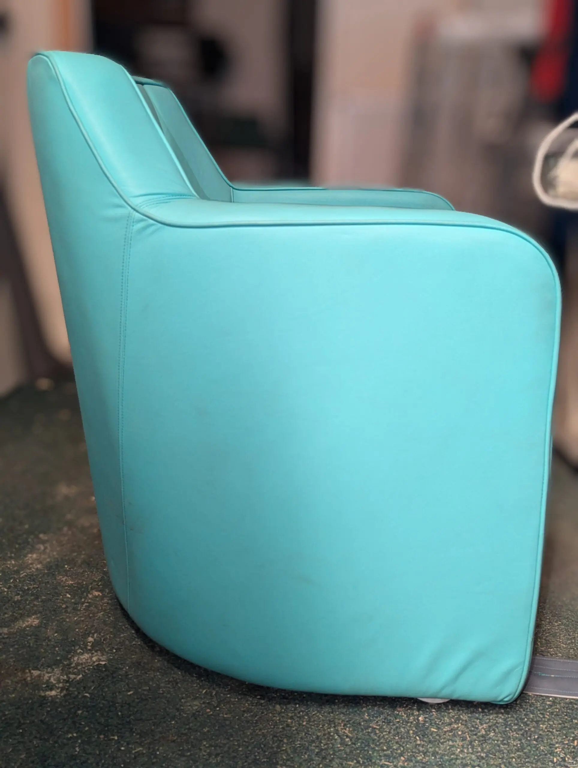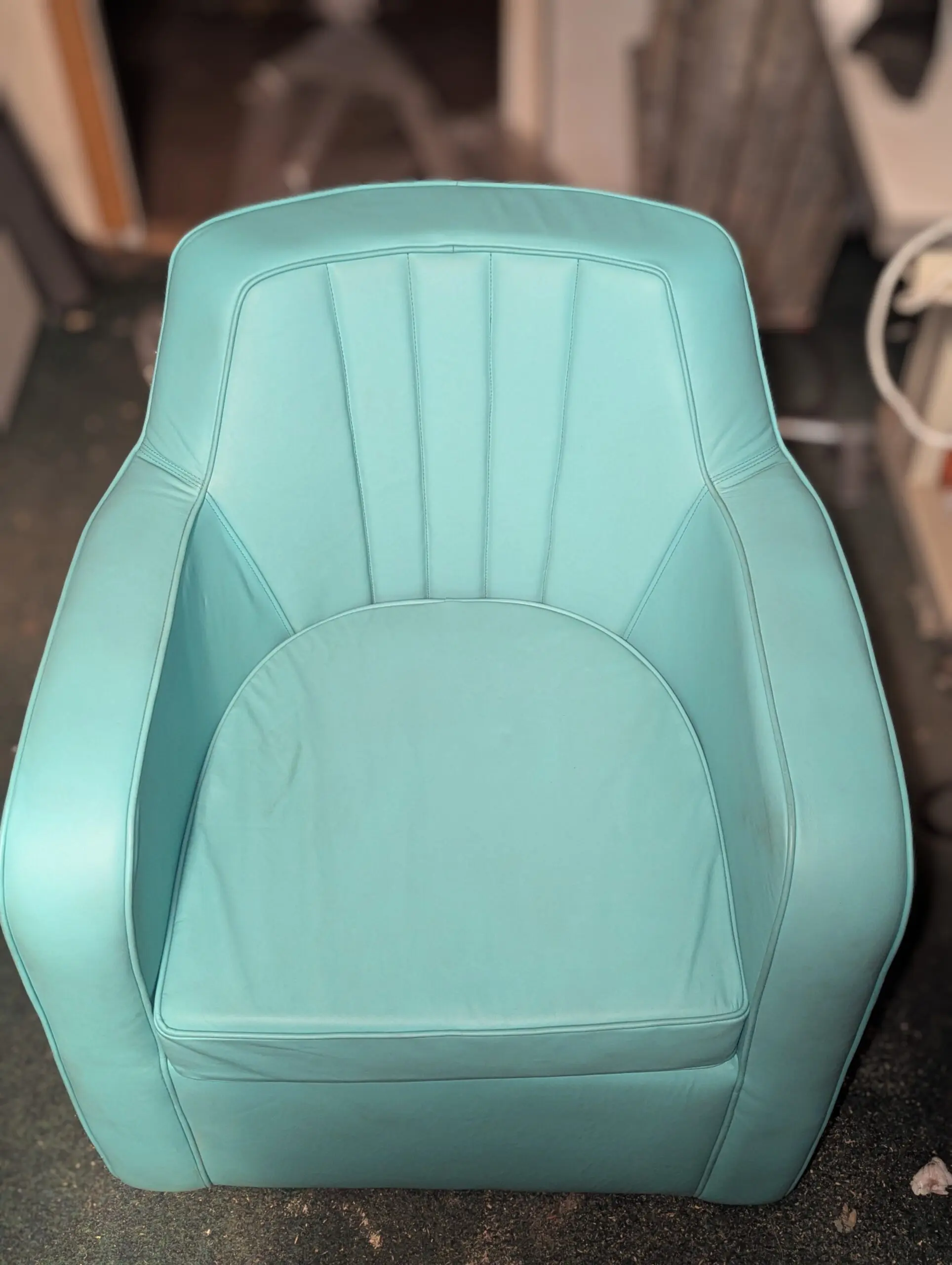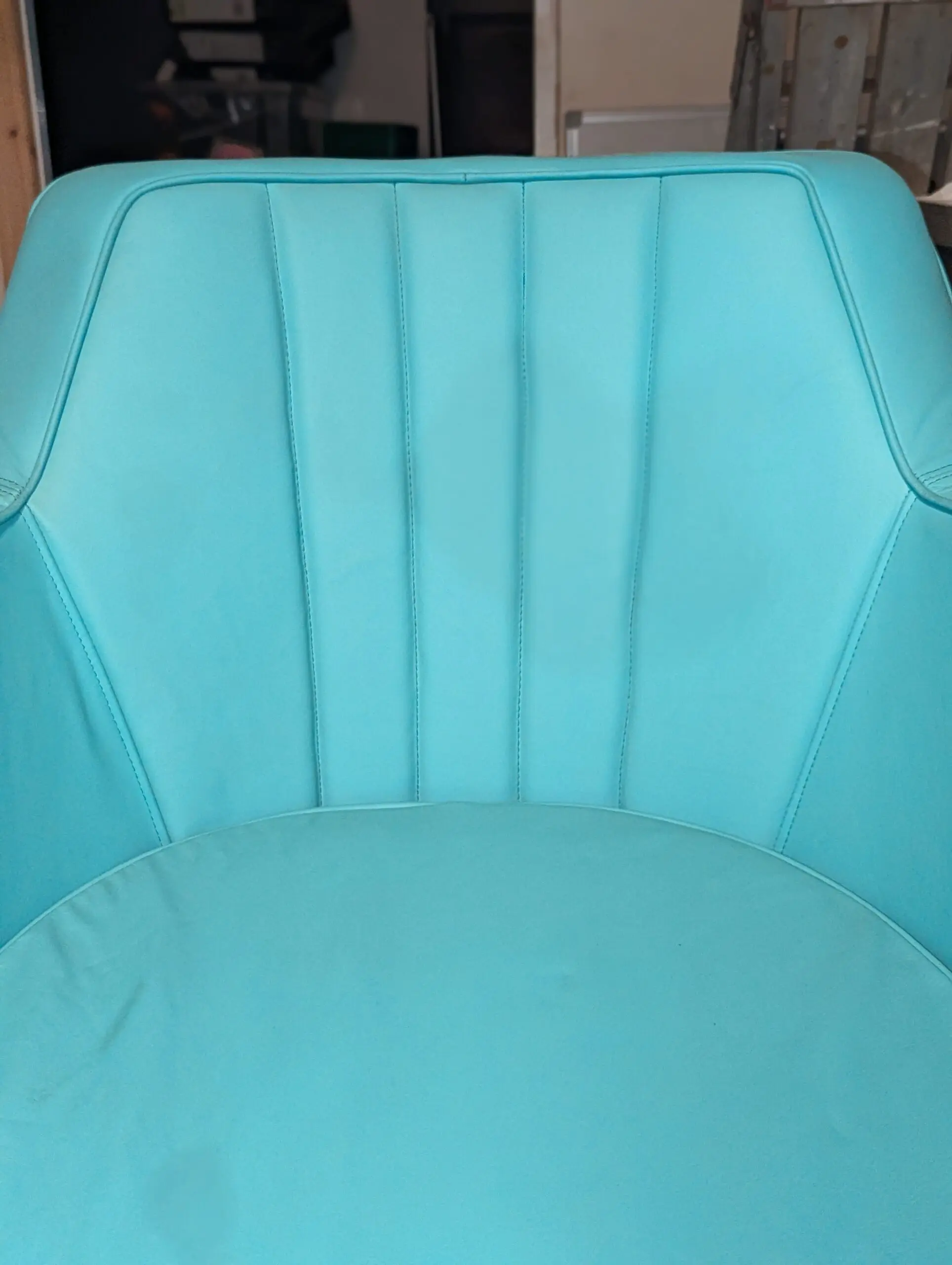 Striking turquoise accent armchair in a high-quality leather, featuring a curved silhouette with refined vertical stitch detailing and a generously padded seat for lasting comfort.