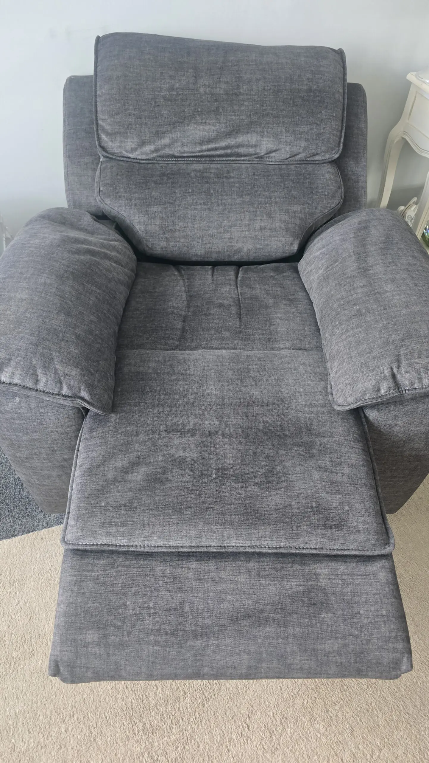 Two years old, recliner chair with 1 usb portal. Back comes off both for transportation. Clean, smoke free home. Bought from furniture village 2 years ago.