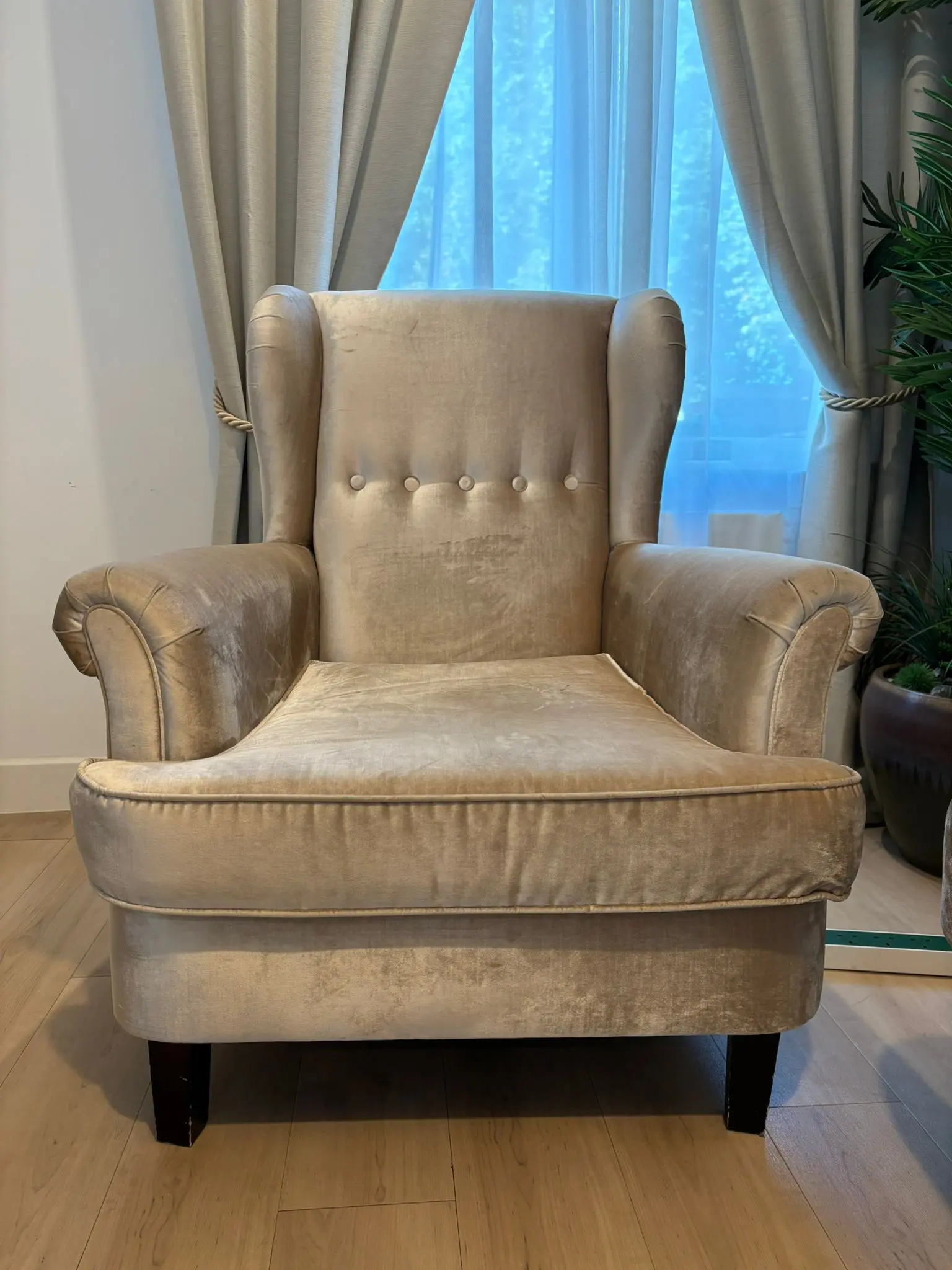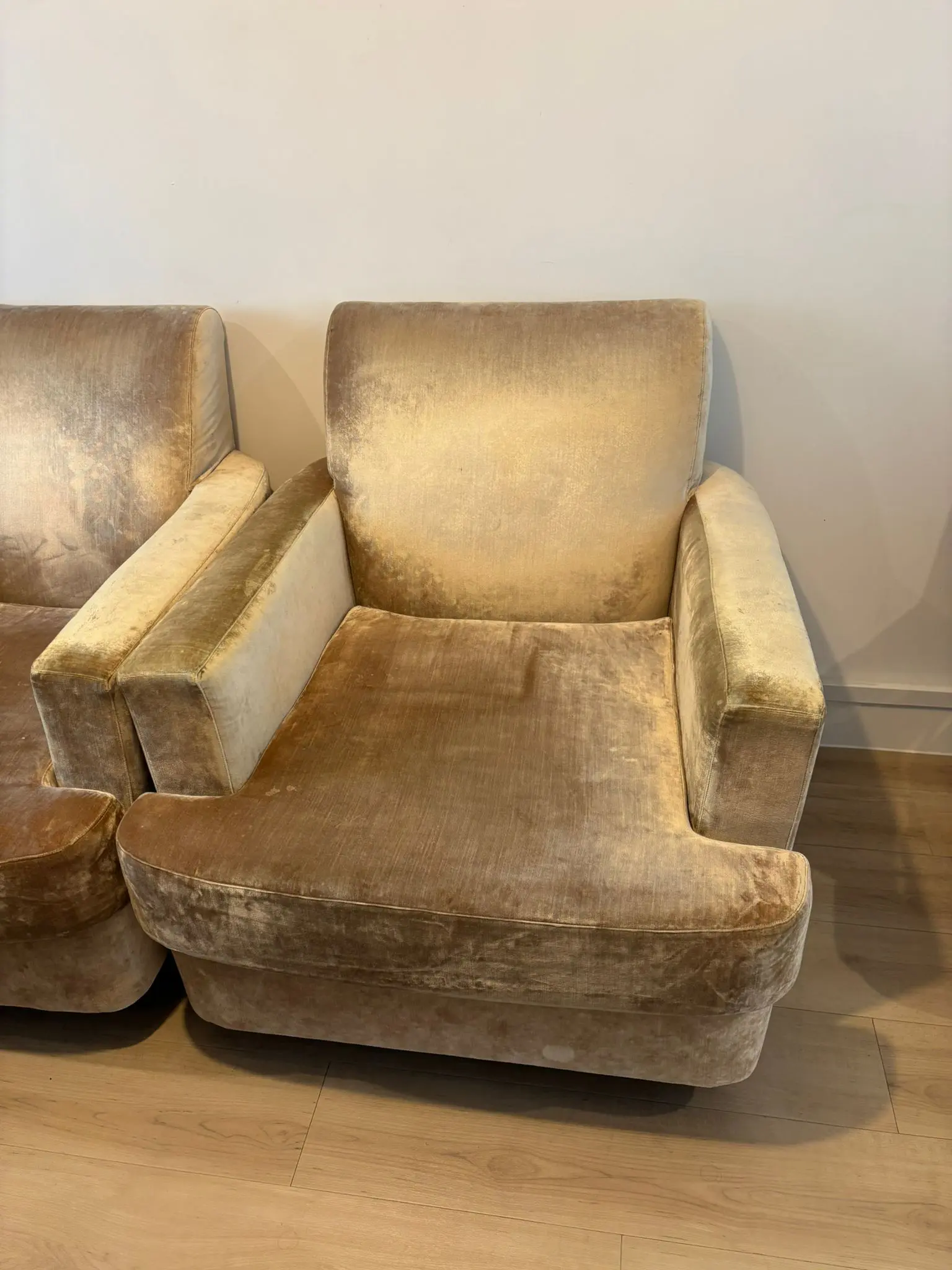 Both pieces are upholstered in a soft champagne gold velvet fabric “high quality and expensive”. The set has a timeless, elegant look that works well in both modern and traditional interiors.