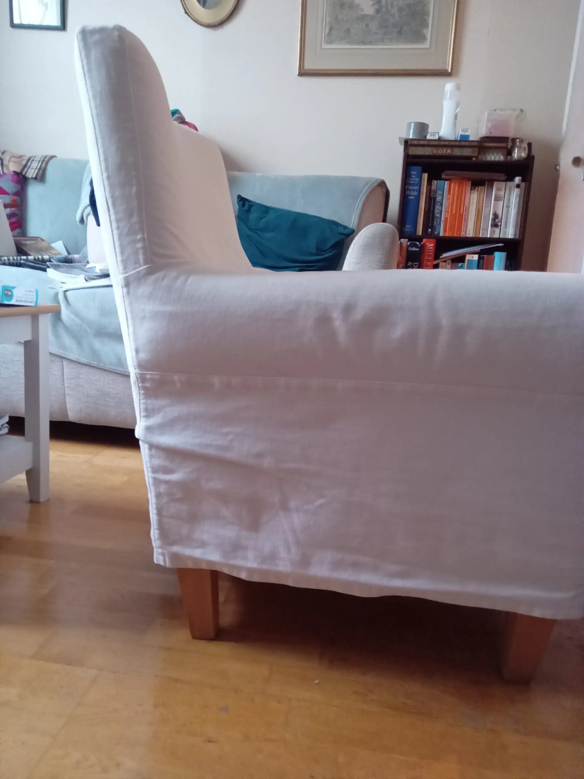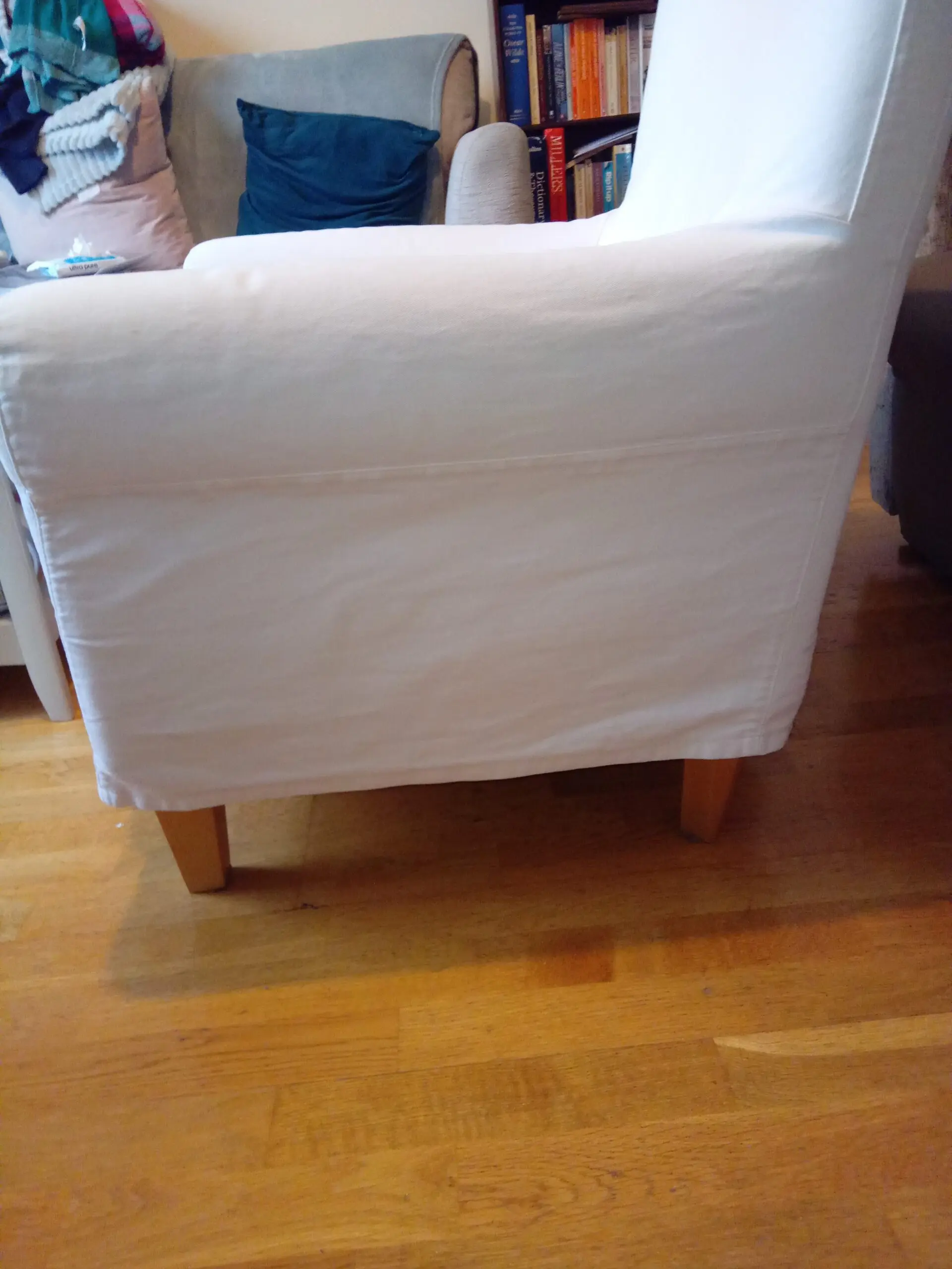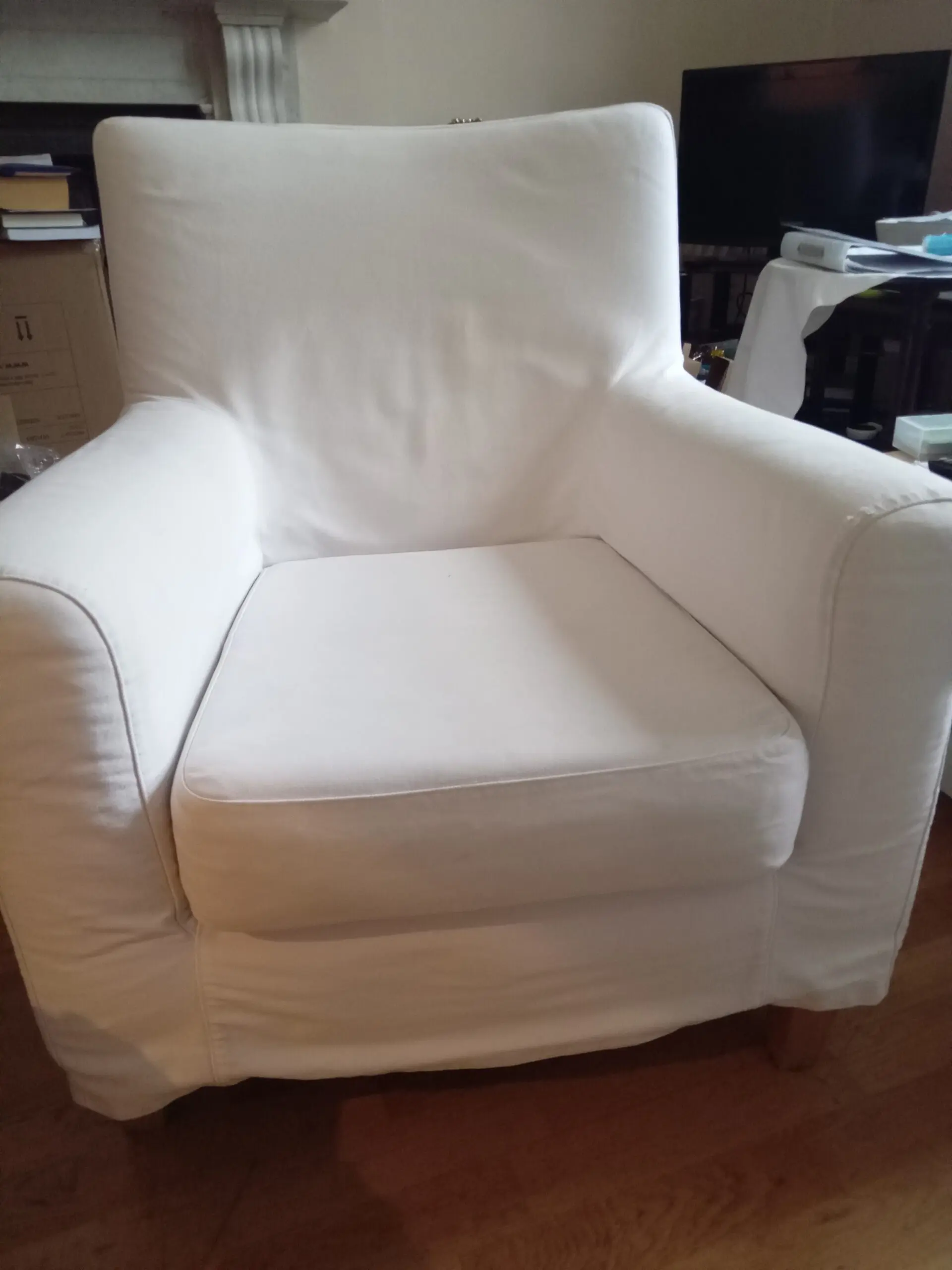 This white armchair is very confortable and in good condition. It has a removable cover and wooden legs.