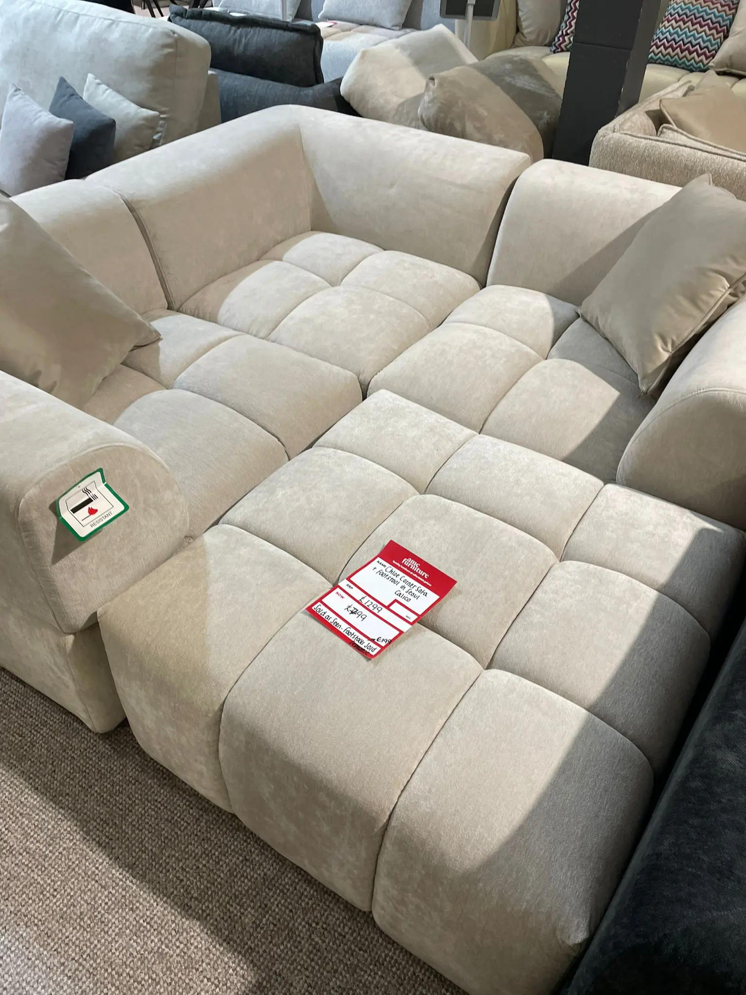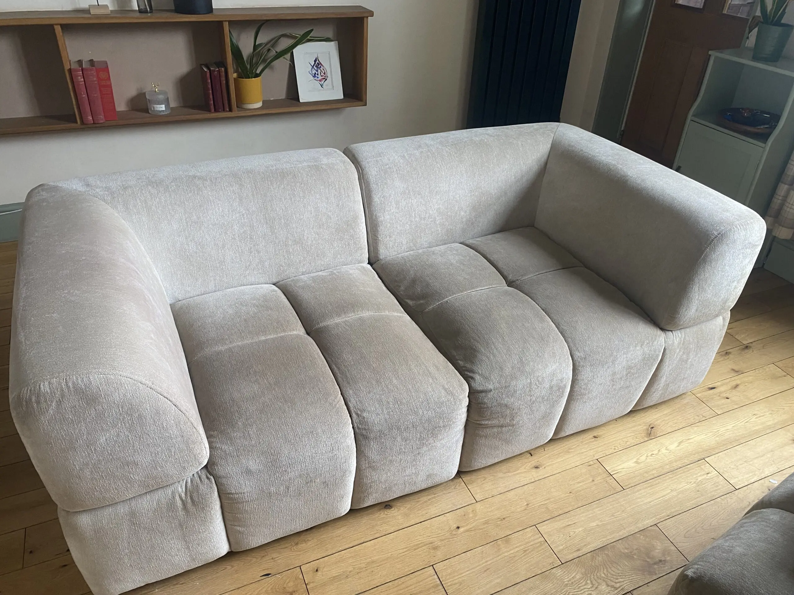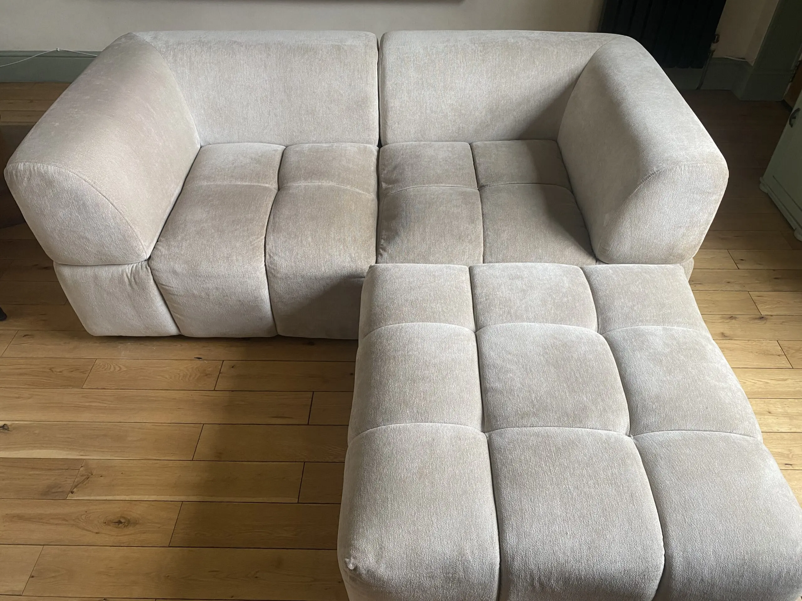 1 year old modern and incredibly versatile sofa in a soft neutral fabric. This modular design can be arranged to fit your room perfectly — use it as a 3-seater corner sofa with chaise or easily reconfigure it into a spacious 2-seater with pouffe.