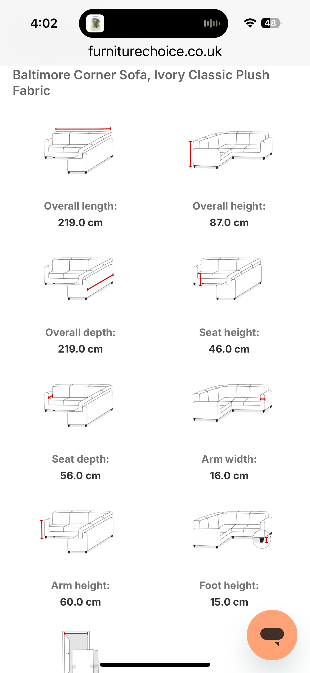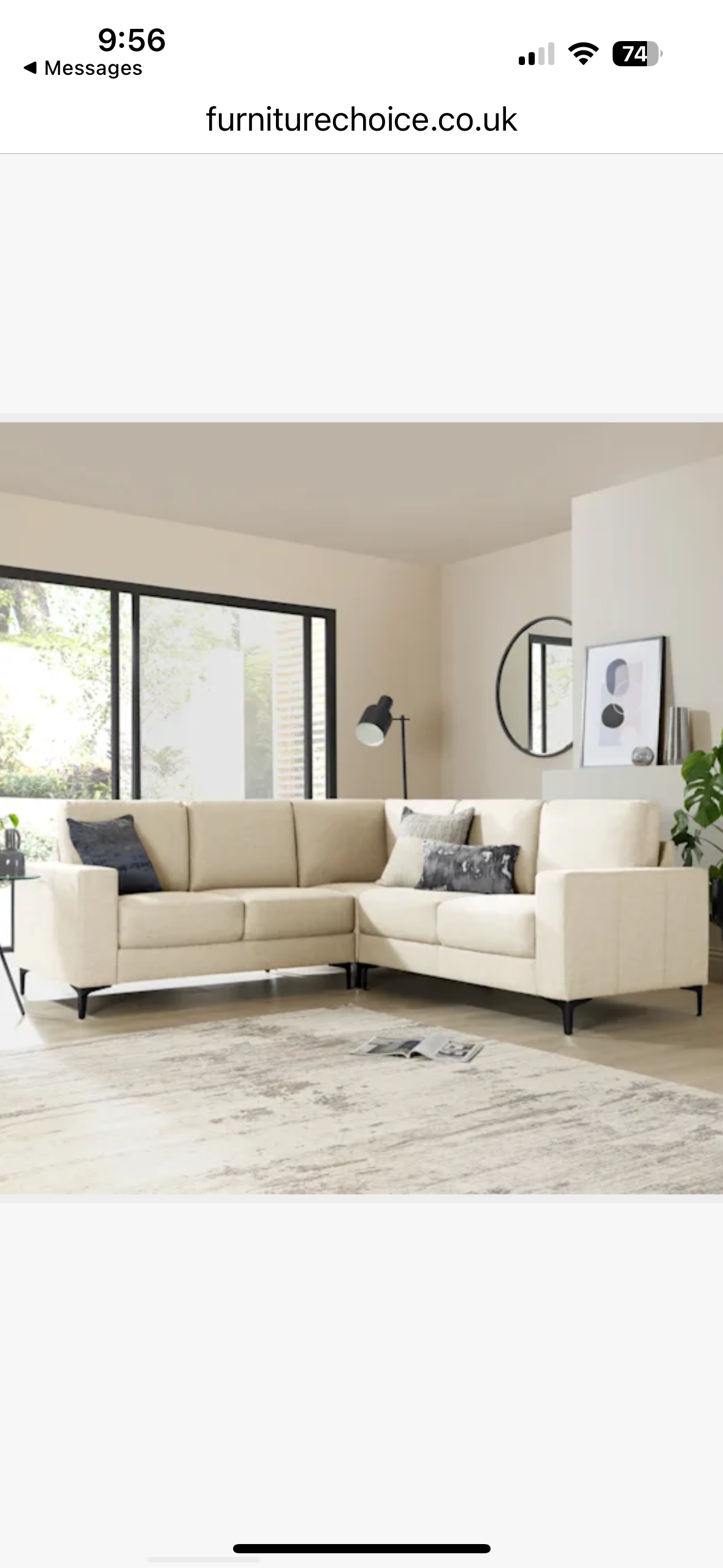 The Baltimore Corner Sofa from Furniture Choice, a family owned British business. It is contemporary in style, cream in color and in pristine condition. Paid £999 and asking £600. The dimensions are 219 X 219 X 87cm