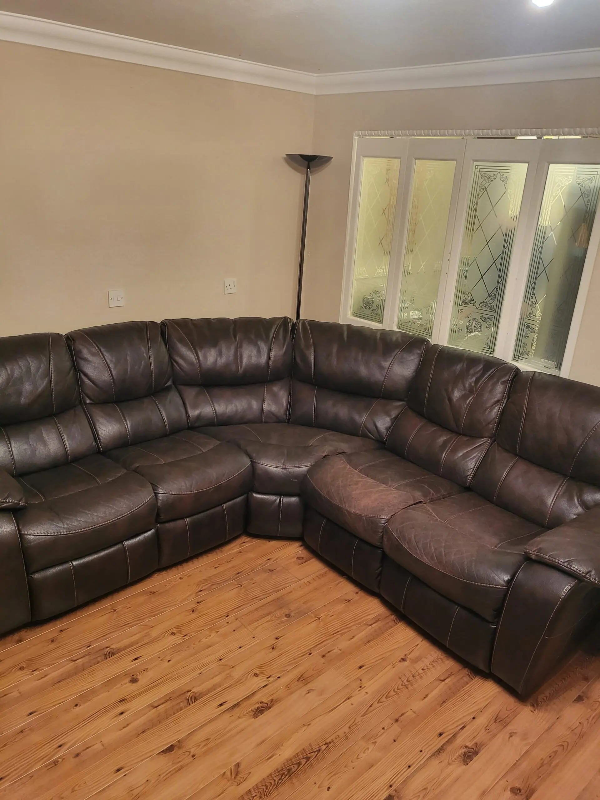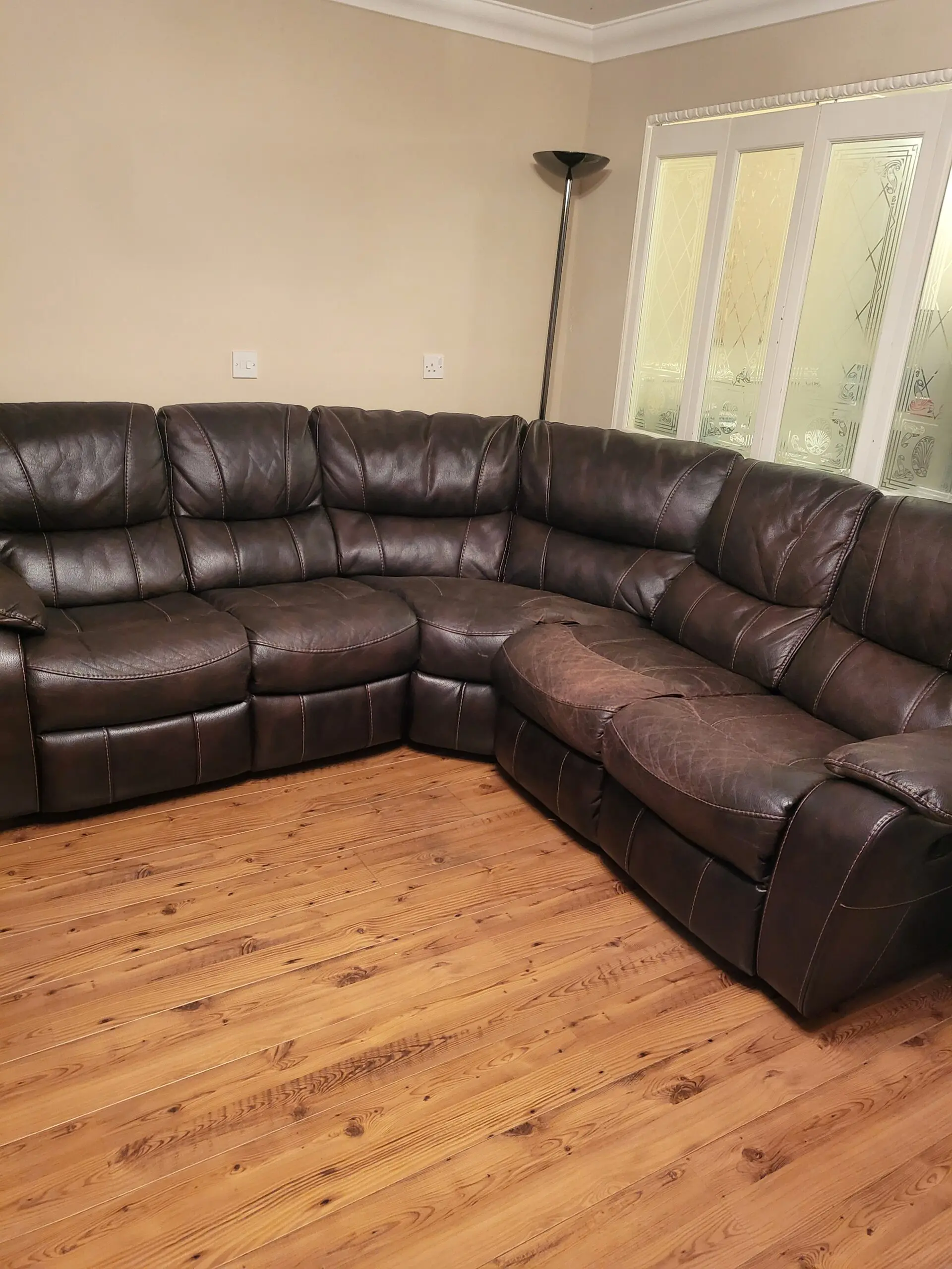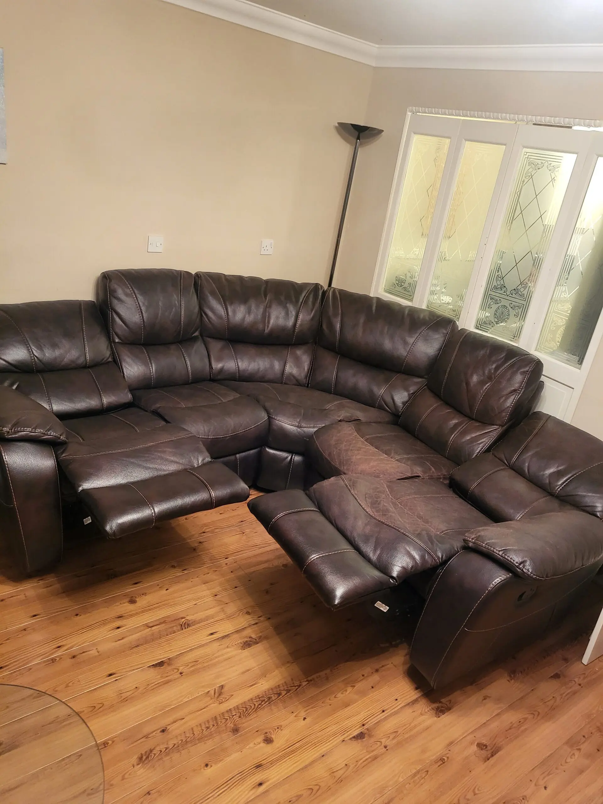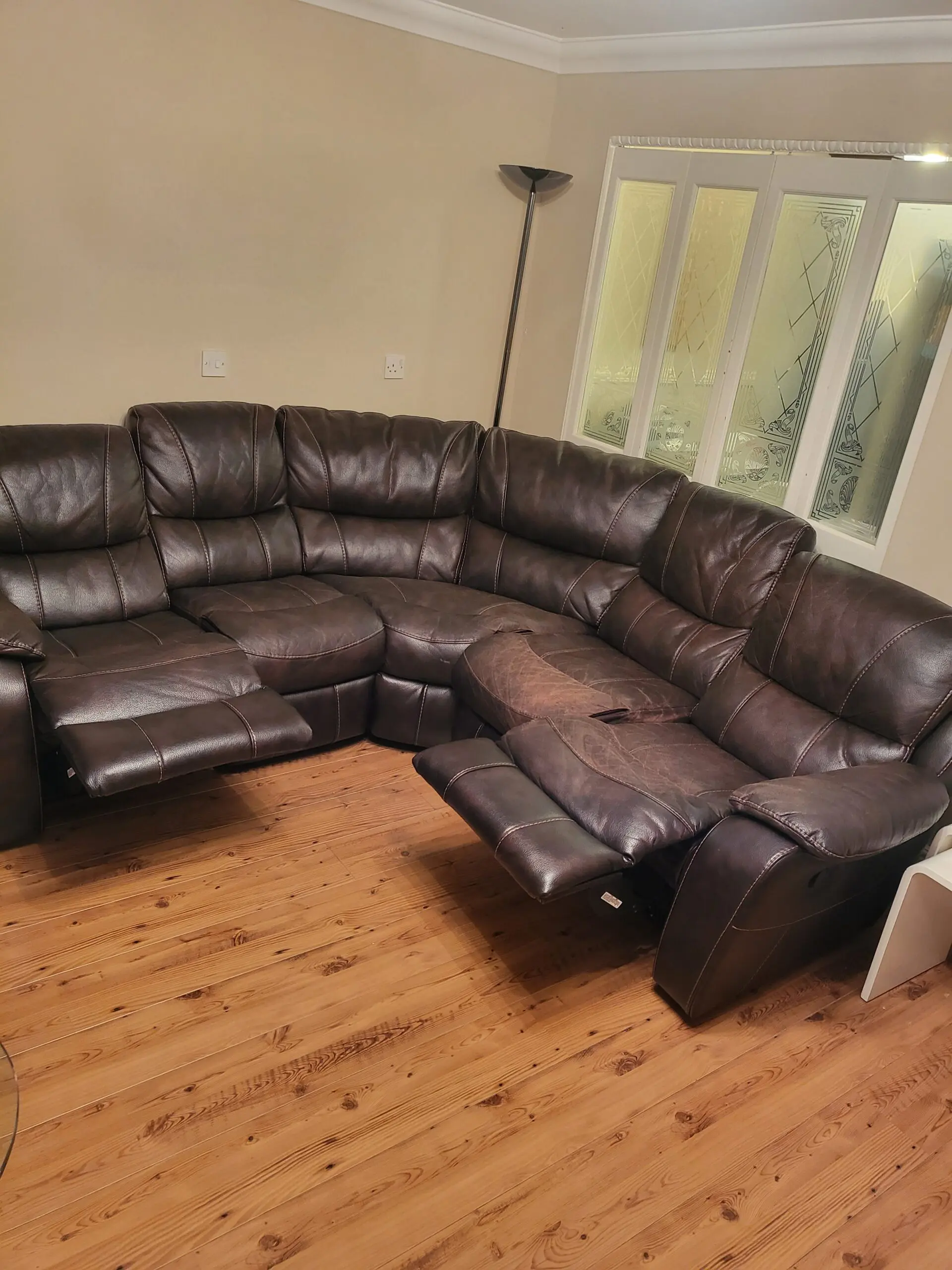 Curved corner sofa, fully reclined end two chairs, soft leather.