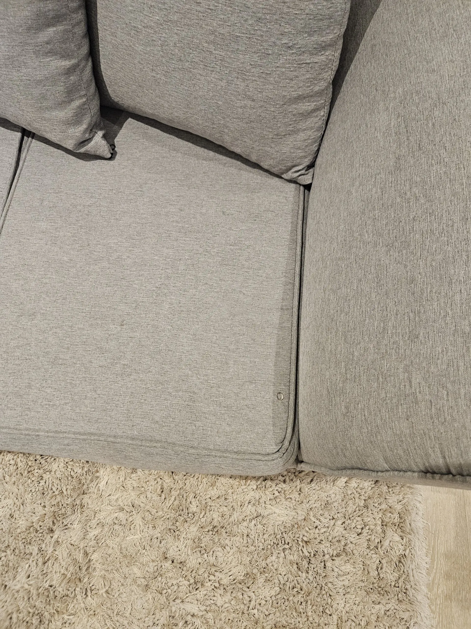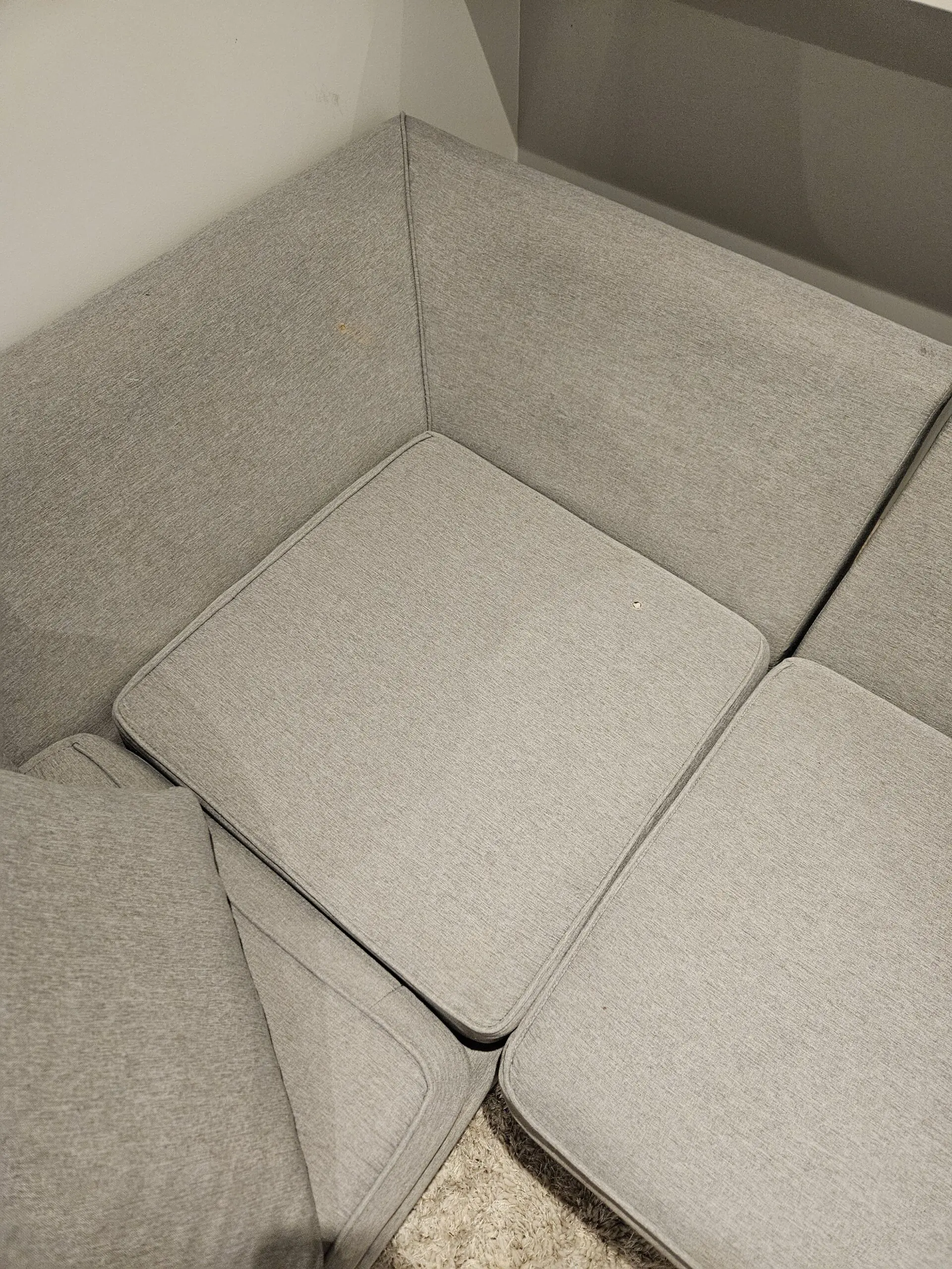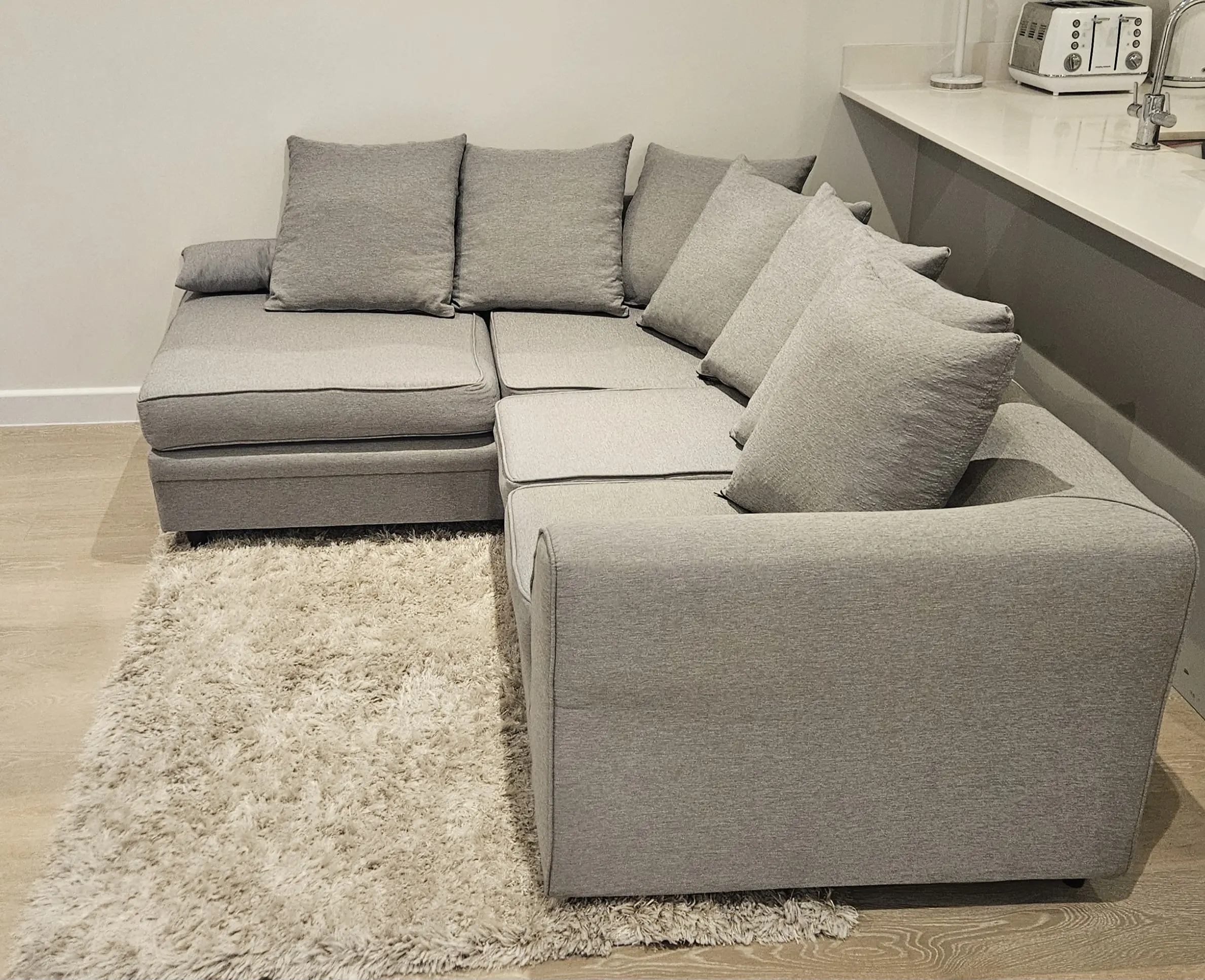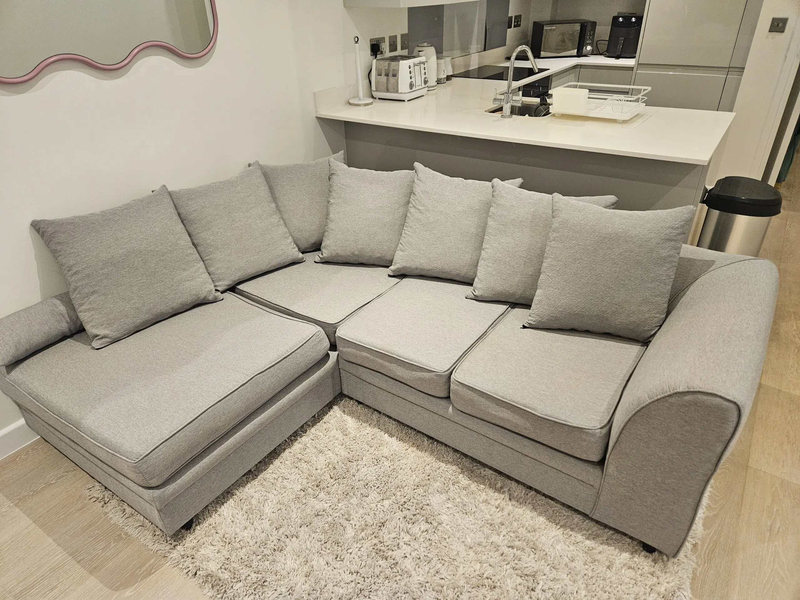A longstanding best-seller at Abakus Direct! The Darcy! A beautiful thee-seater left-facing corner sofa in light grey. Scatter cushions and extra wide angular arms give you all the cushioning your back and arms need, while the extra deep foam filled seats sit atop a plinth base with clean straight lines. Unfortunately there are two small cigarette burns from one singular incident, otherwise it was in a non-smoking house for 2.5 years so no smell or stains. It’s really comfy, only selling now as I need something bigger.