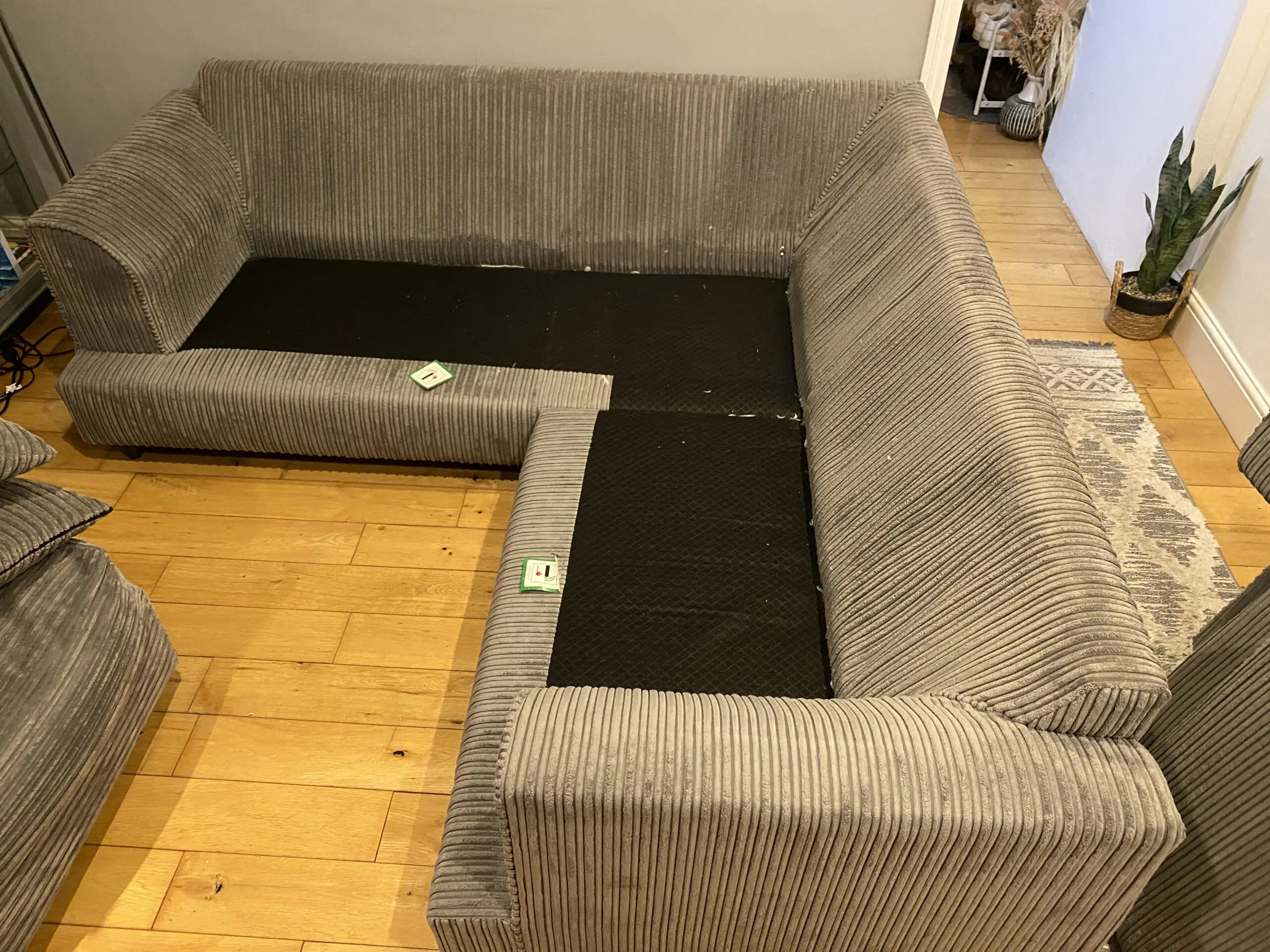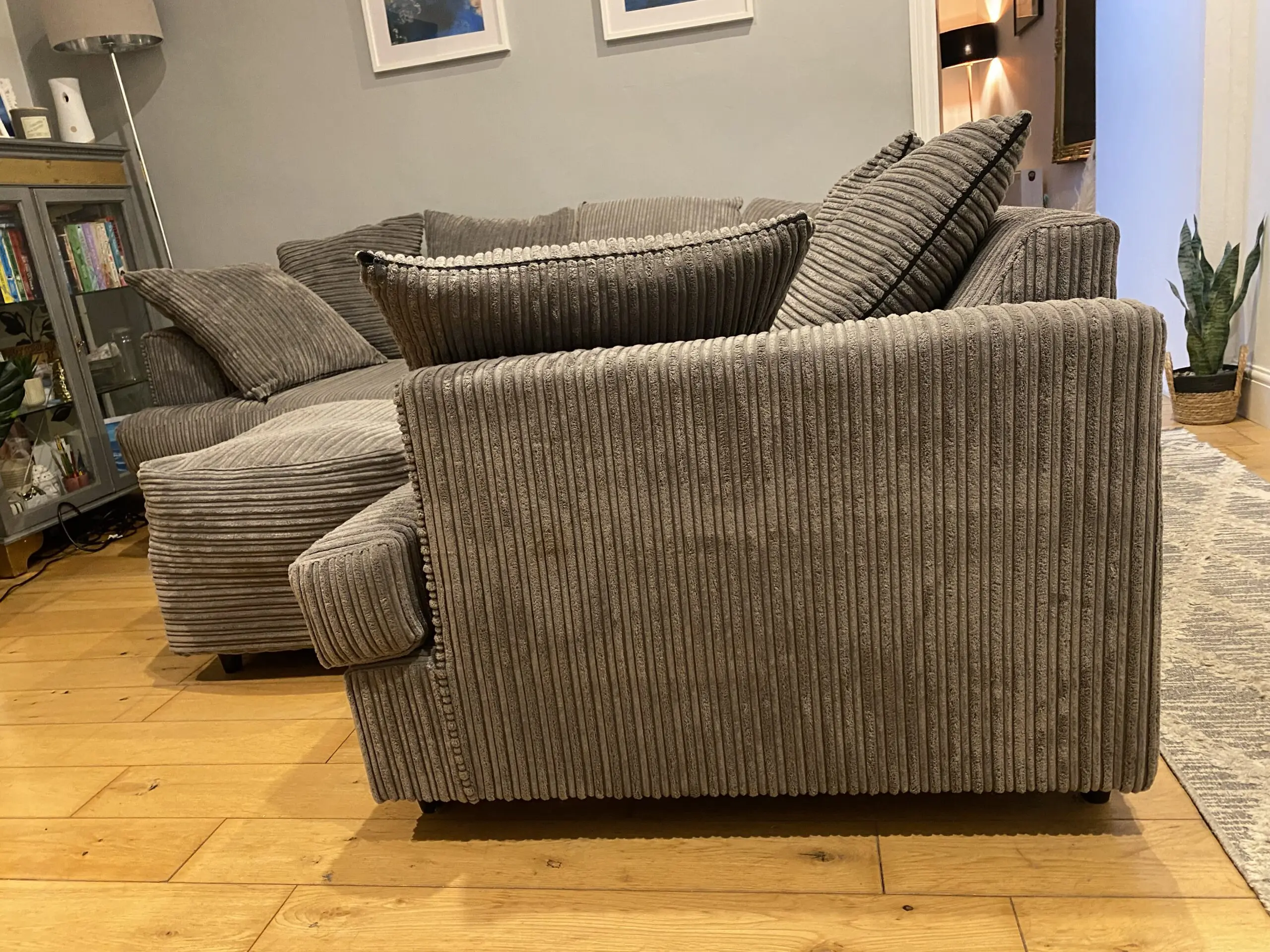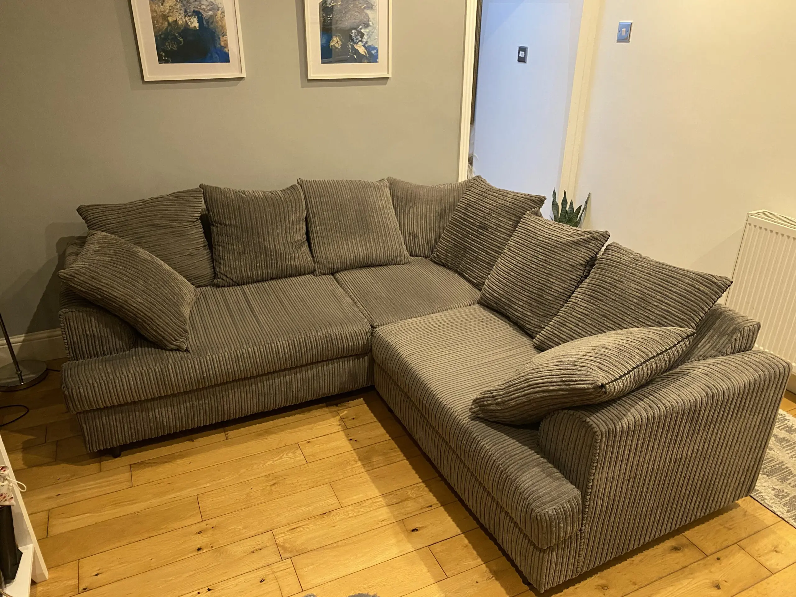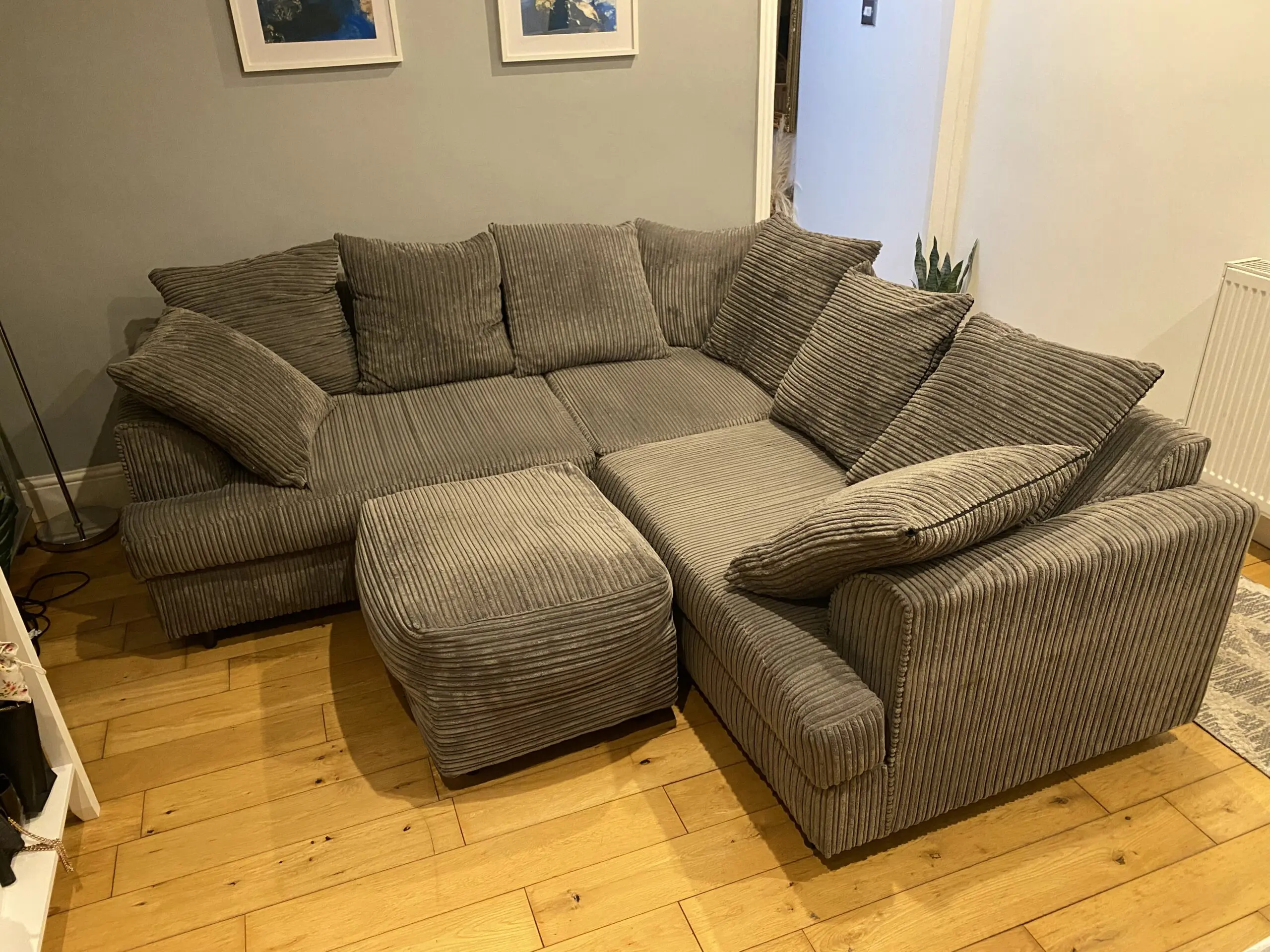 Grey cord corner sofa with matching cushions and footstool included. Looking to sell as we are selling the property and no longer need our furniture.