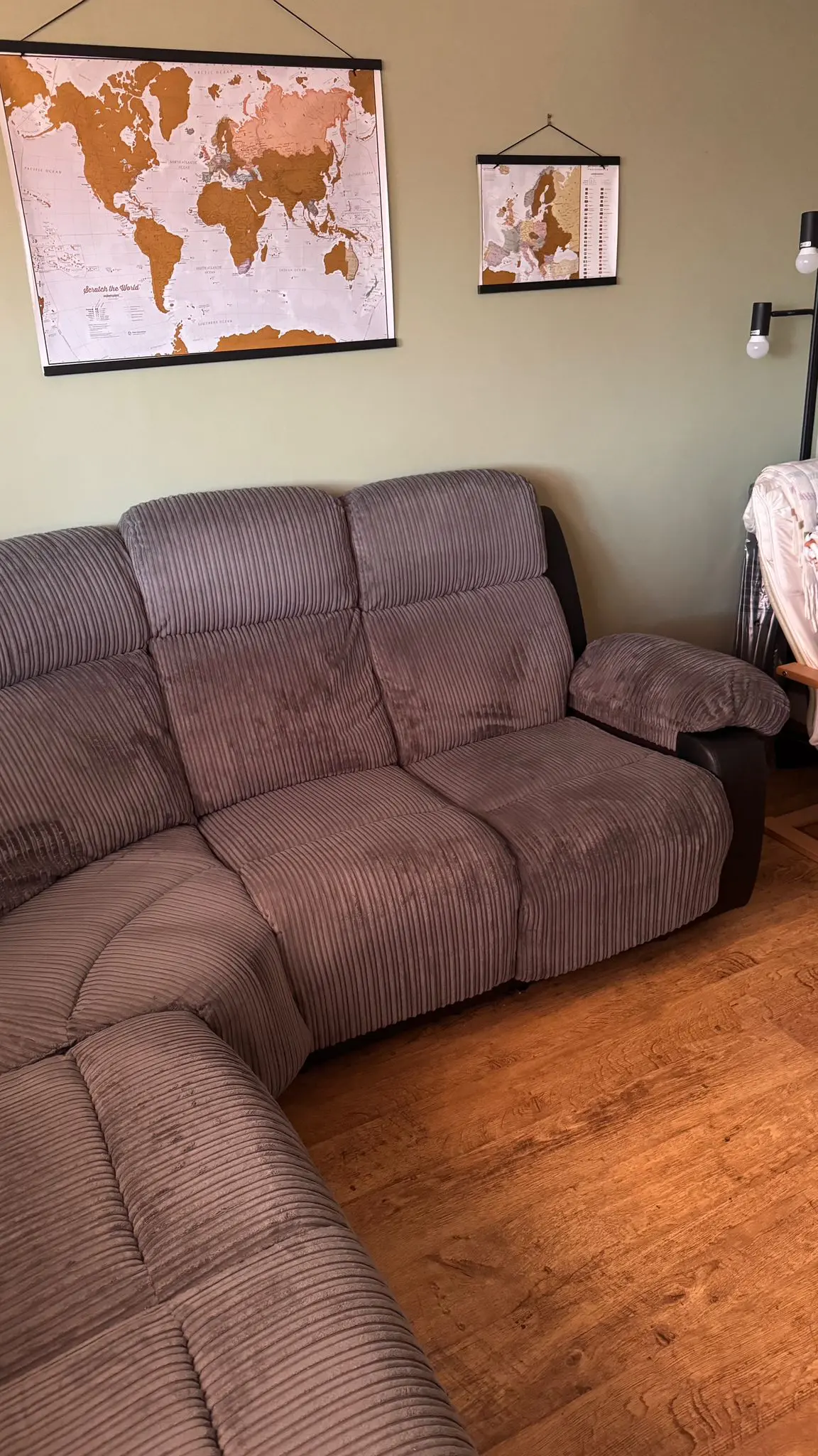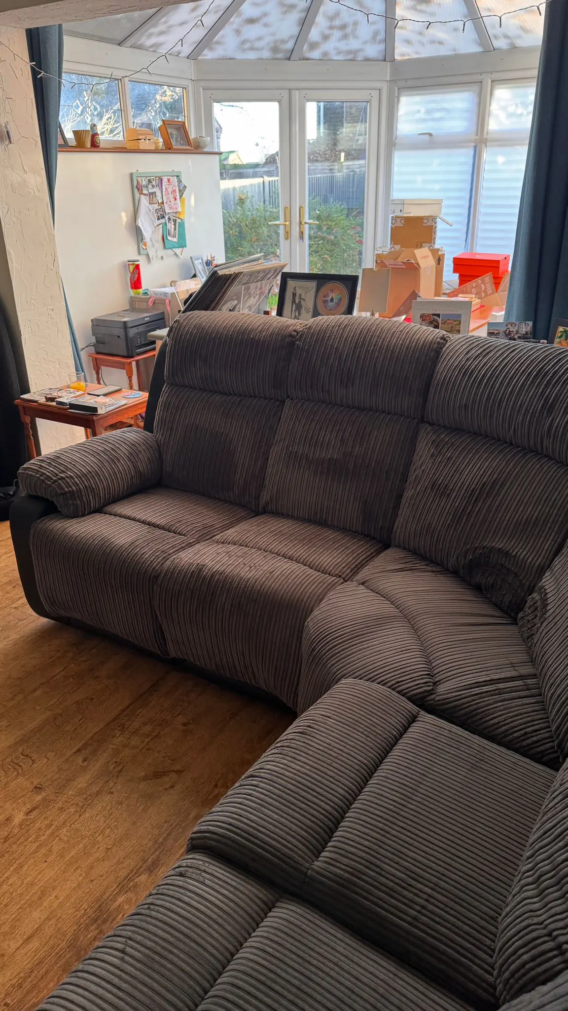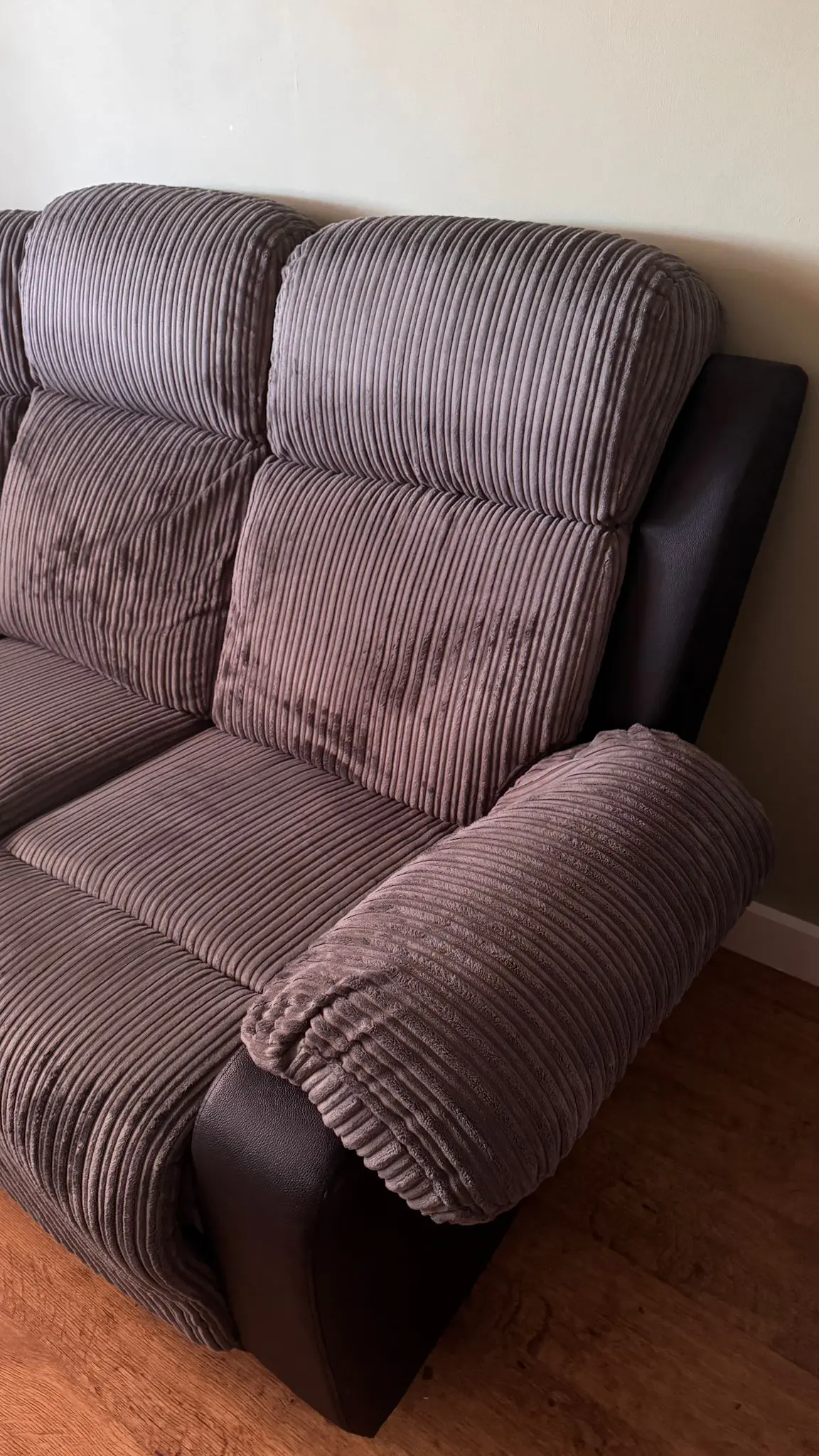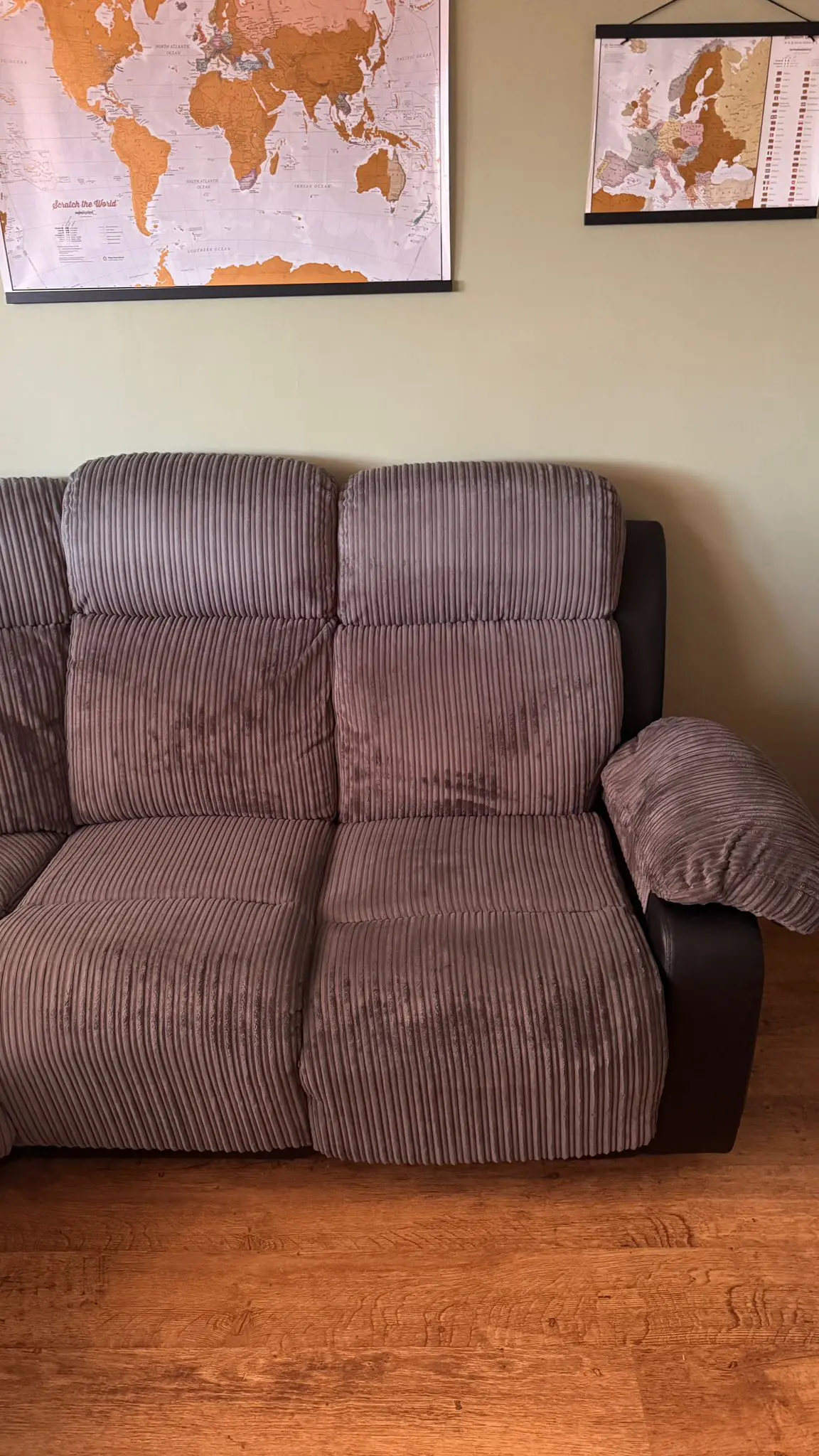 About 2-3 years old. From a pet and smoke free home. Easily sits 5 people. Reclines on each end so has 2 reclining seats. This sofa is super comfortable. I’m only selling as I am moving abroad.