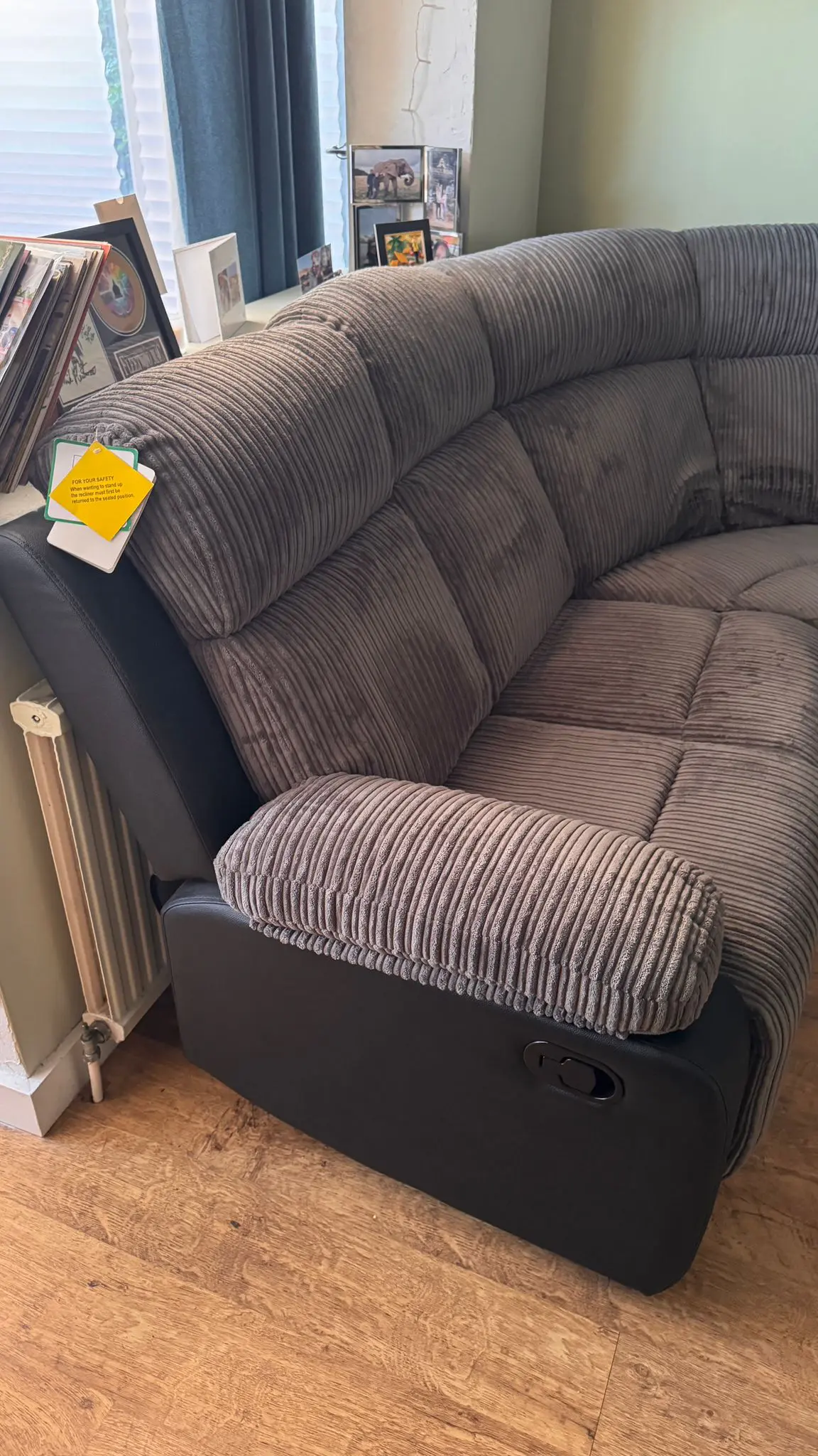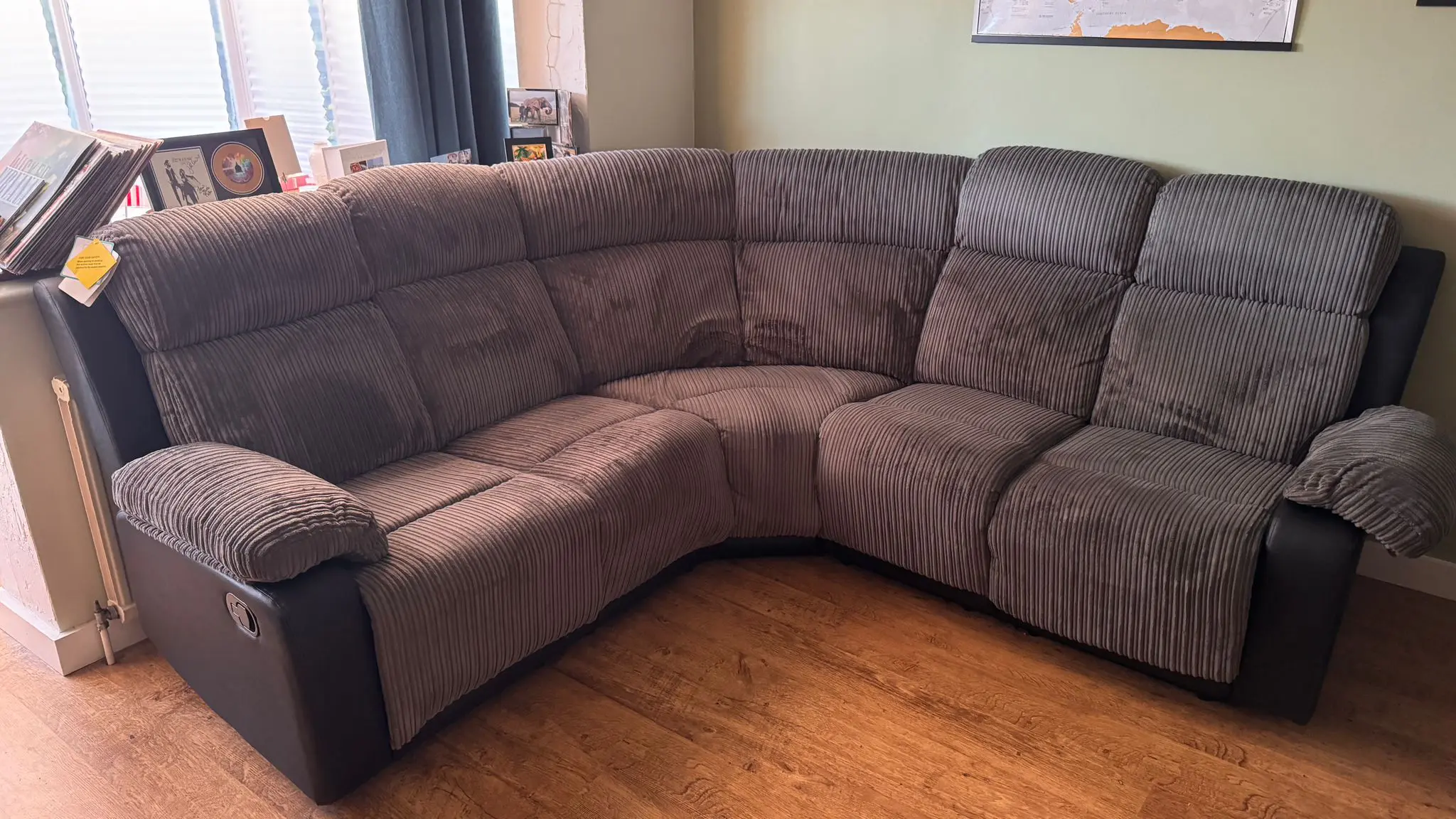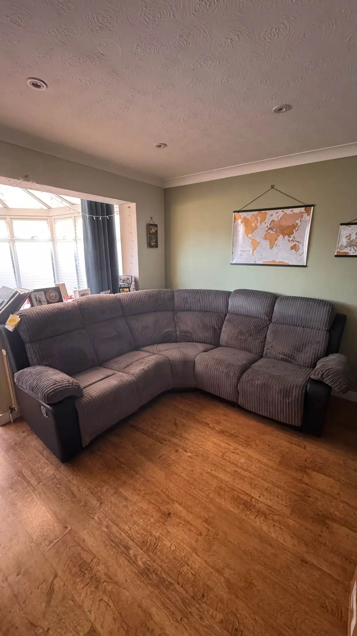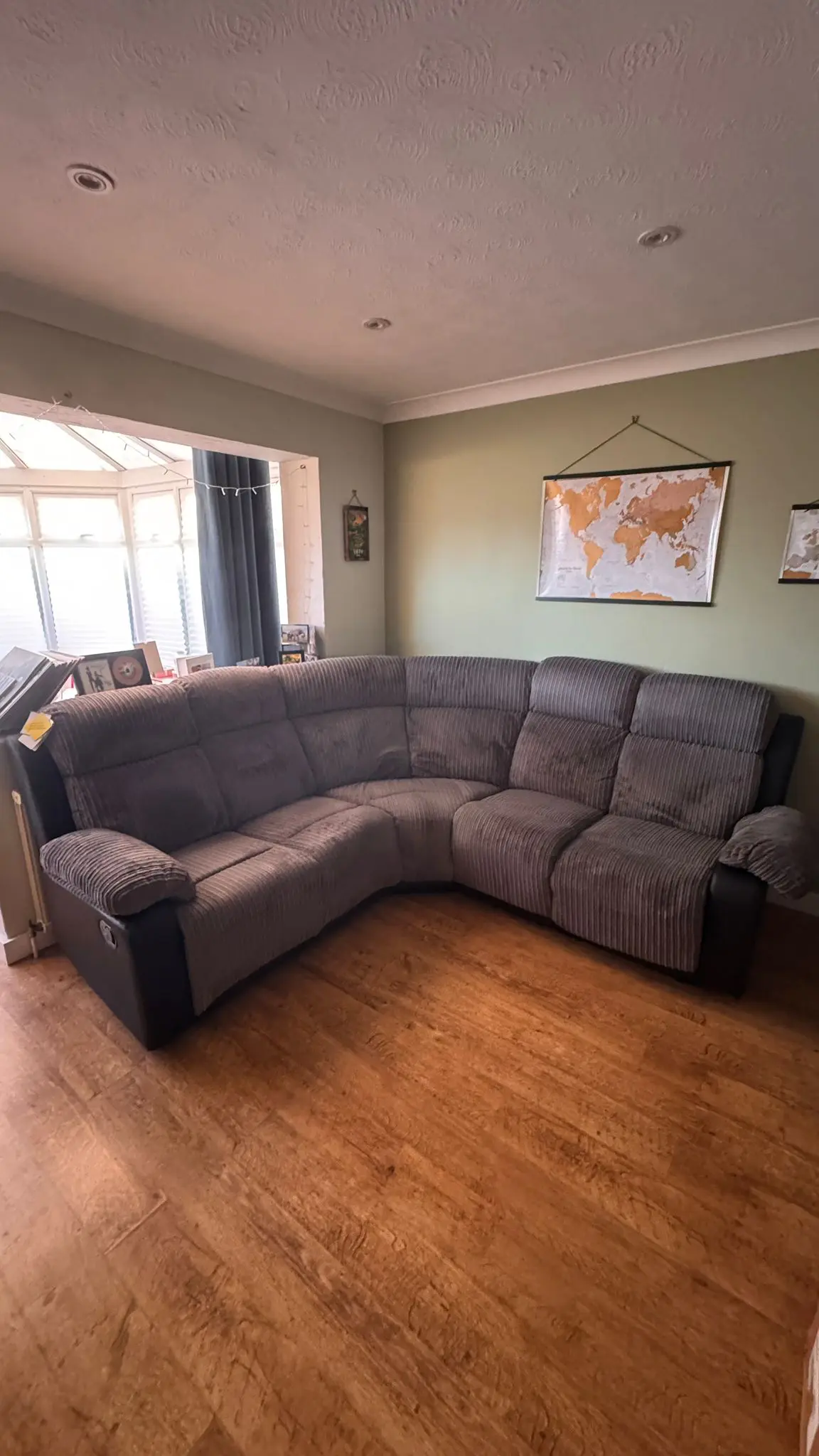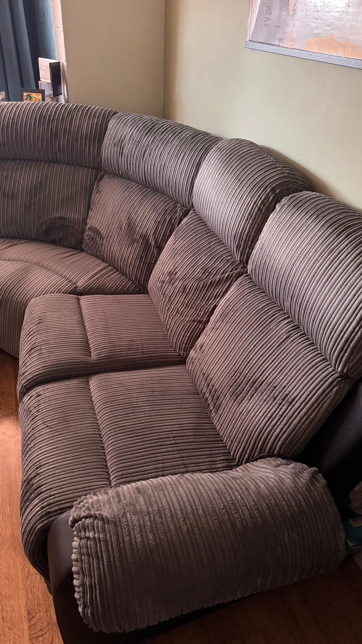 About 2-3 years old. From a pet and smoke free home. Easily sits 5 people. Reclines on each end so has 2 reclining seats. This sofa is super comfortable. I’m only selling as I am moving abroad.