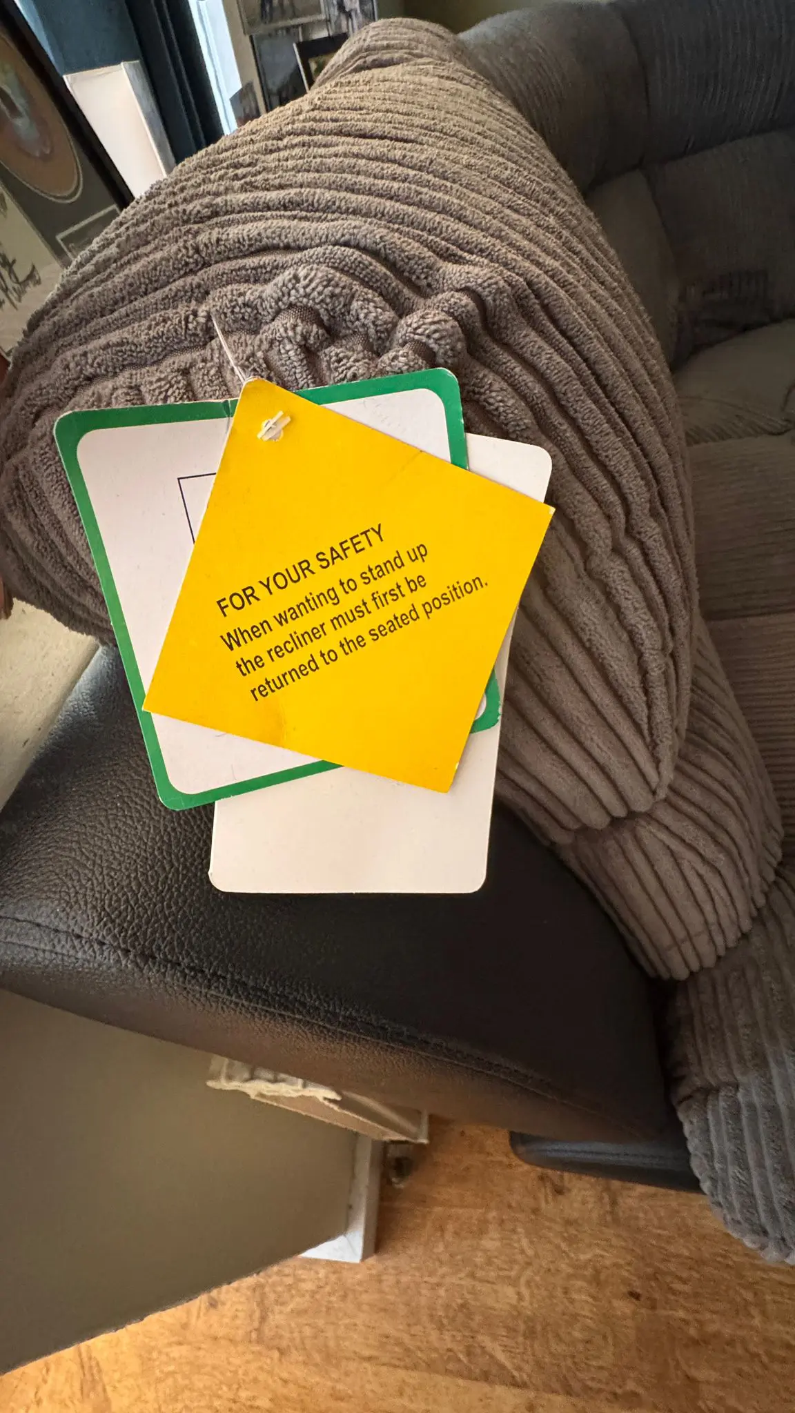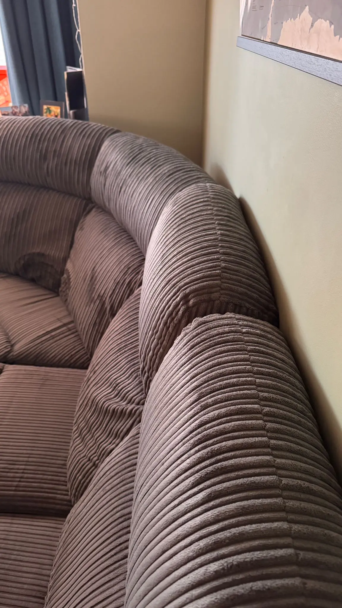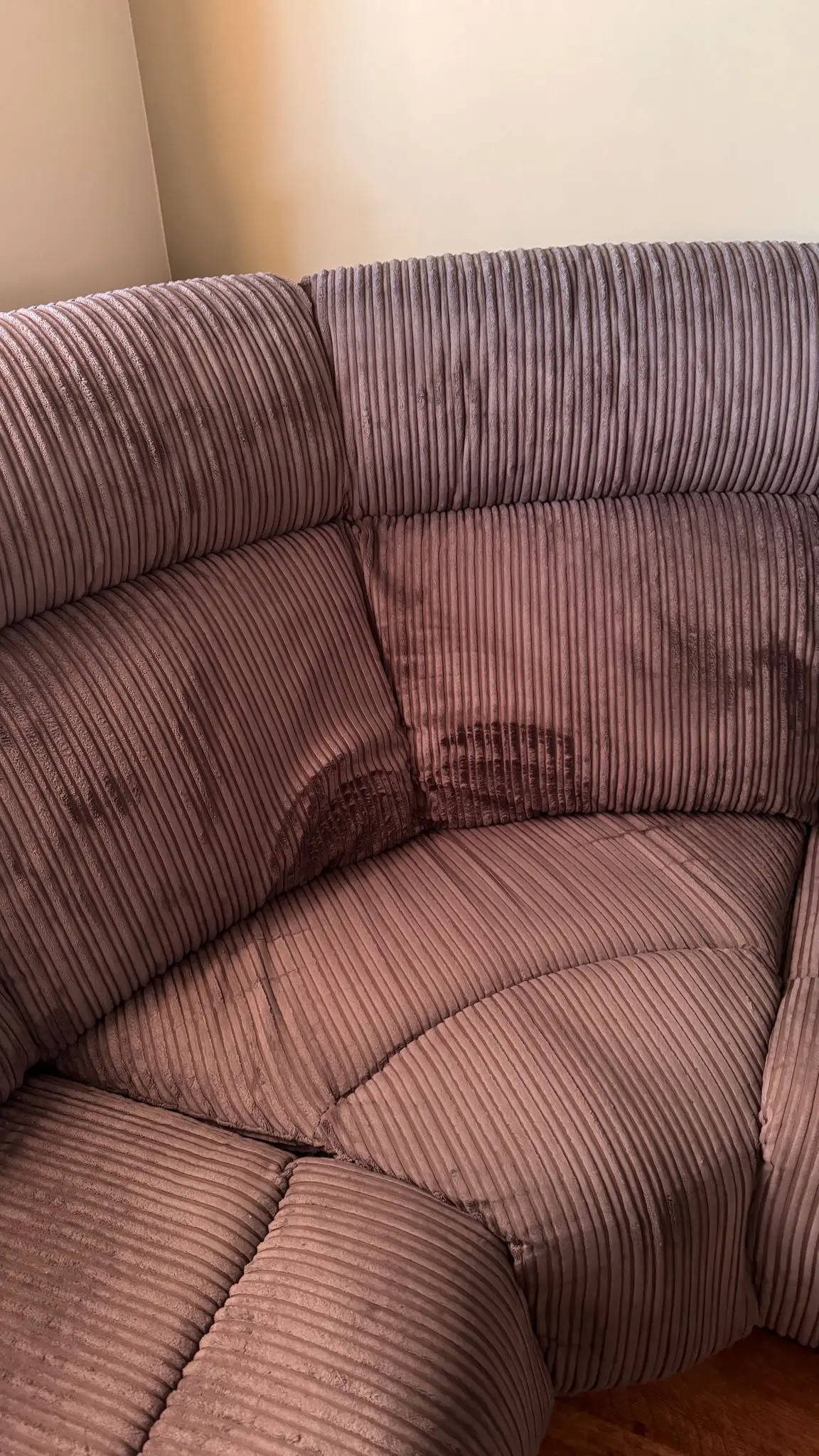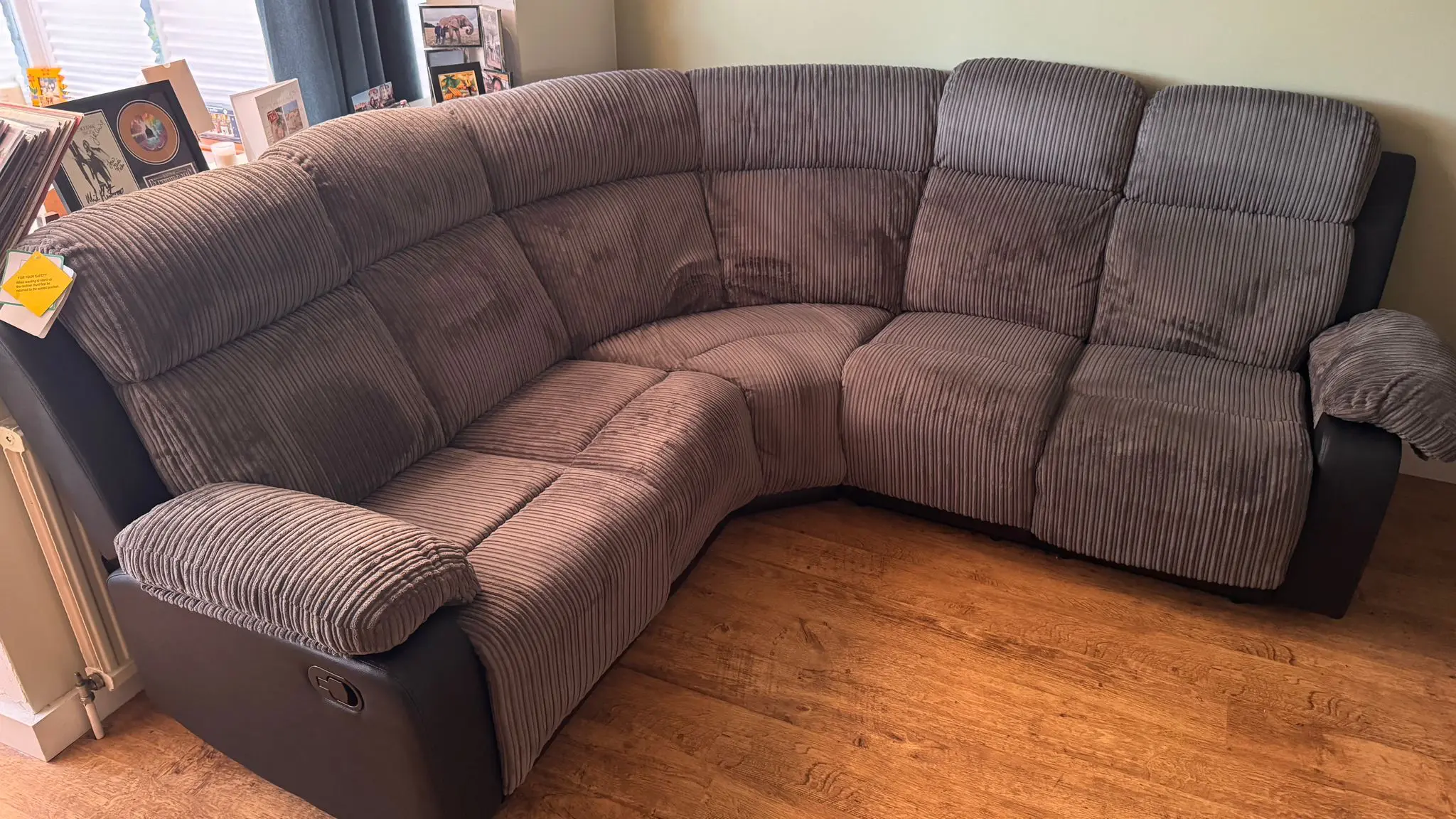 About 2-3 years old. From a pet and smoke free home. Easily sits 5 people. Reclines on each end so has 2 reclining seats. This sofa is super comfortable. I’m only selling as I am moving abroad.