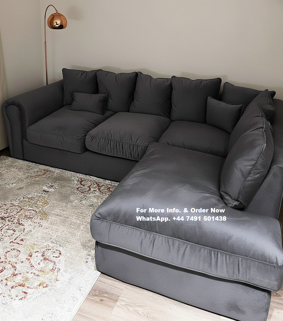 A fantastic Dfs corner sofa from THEIR ‘Baron’ range. This sofa has been upholstered in a light Grey Kronos Fabric The set has foam seat cushions and fibre filled back and side cushions.