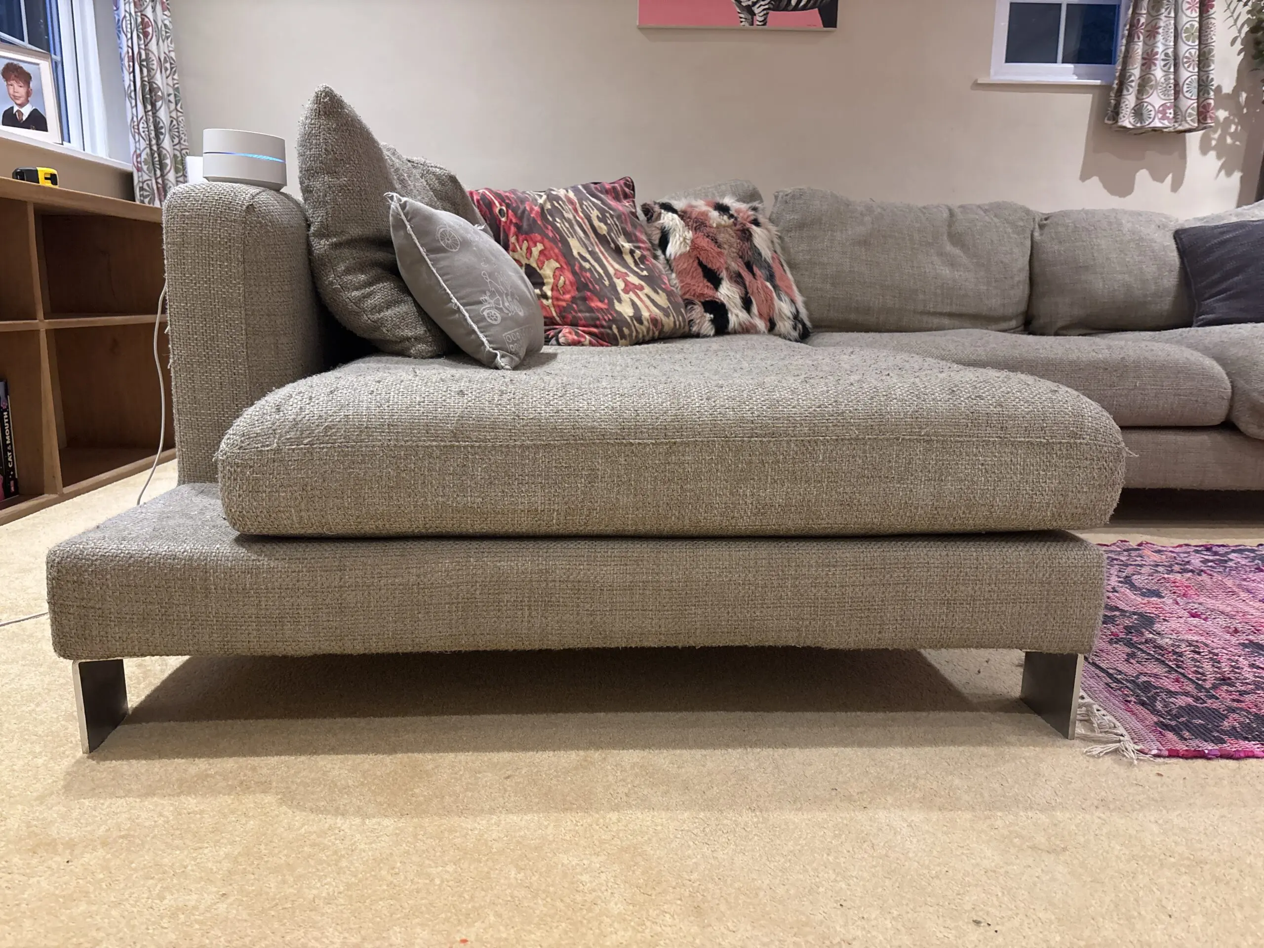 Modern corner sofa, large seat cushions, perfect for a TV room. Can comfortable sit 5 people.