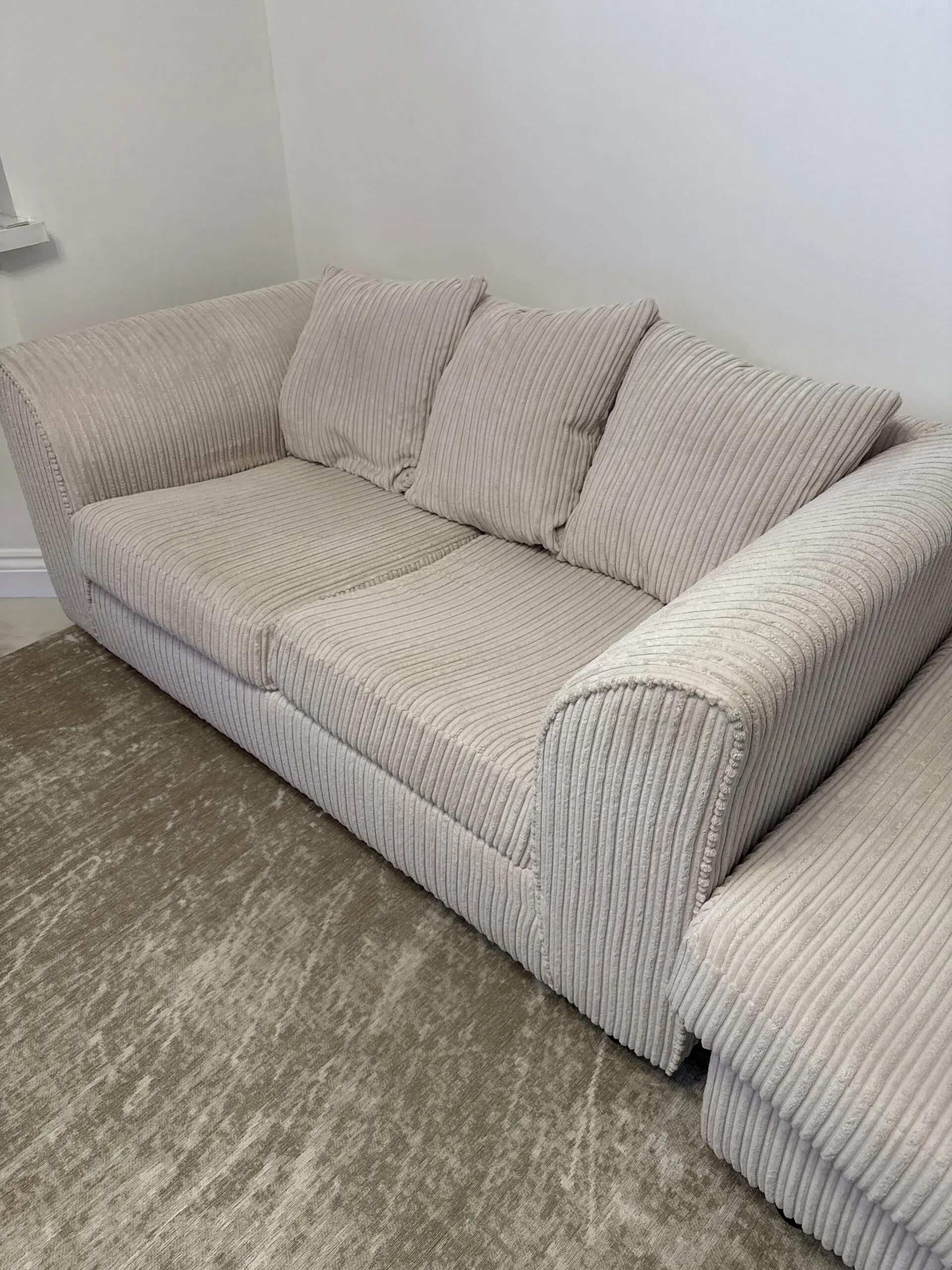 A corner sofa and a matching 2 seater sofa with all cushions included. Only had for 2 years with very little use. The covers for cushions are all zipped so easy to remove and wash.