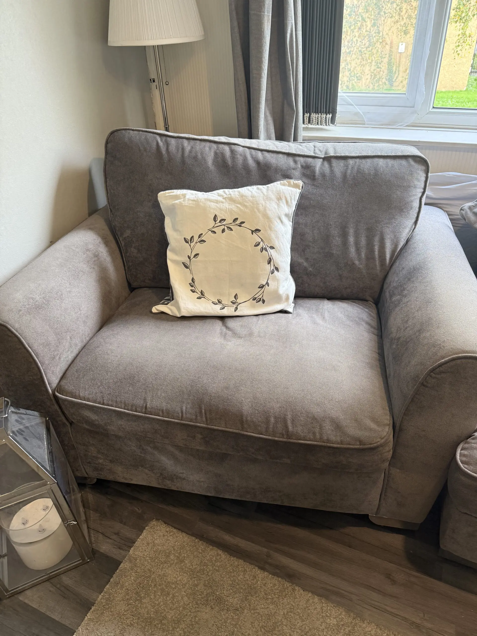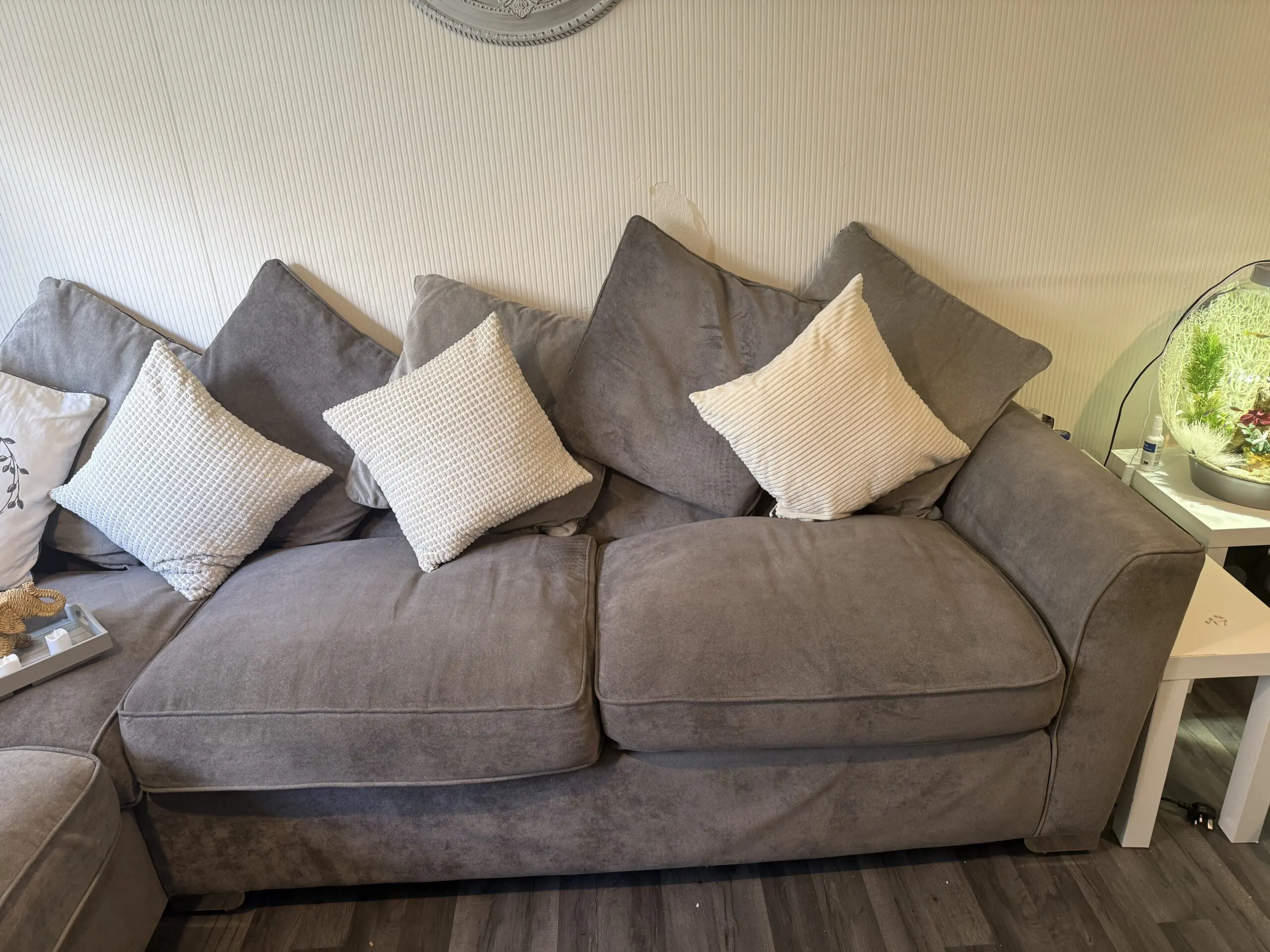 Here is my grey 4 seater large corner sofa with reversible scatter cushions, with a large 2 seater chair and large pouffe.
