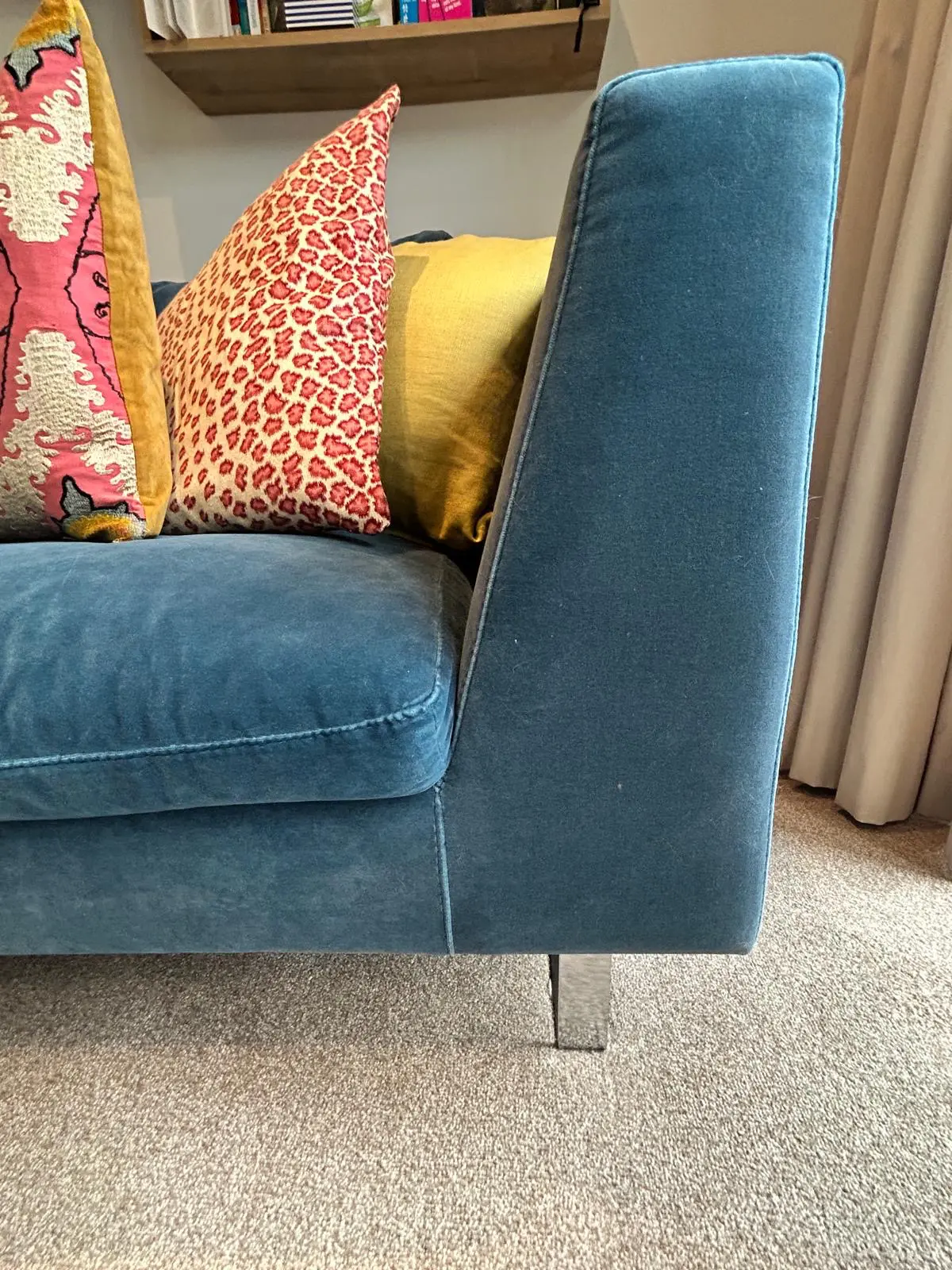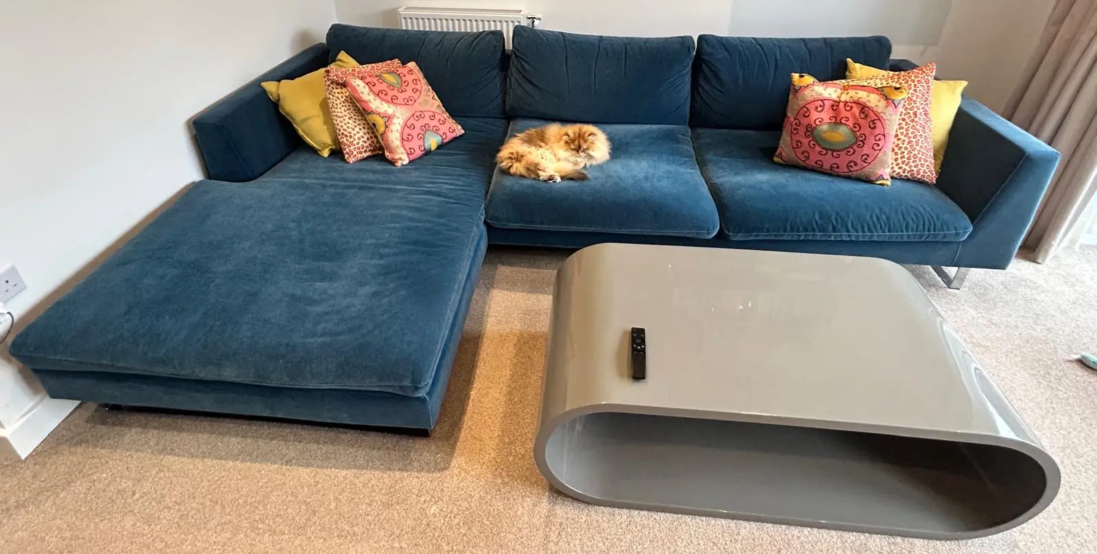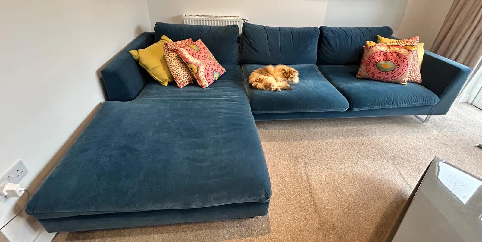 Love Your Home Jasper Corner Sofa in Velvet Blue. Excellent Condition. Being sold at a significant discount. Cushions included. Cat not included!!