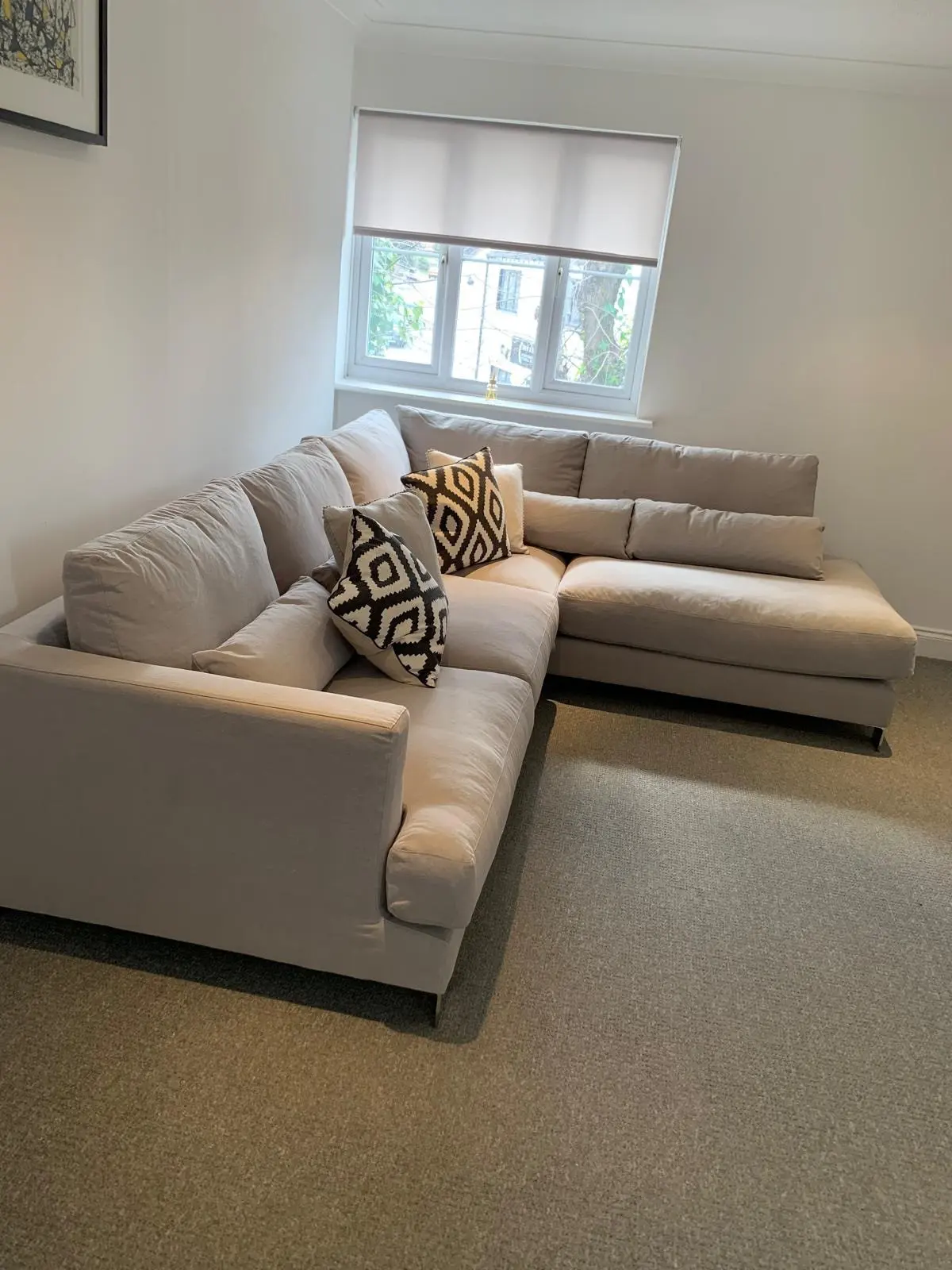 Luxury, generously sized corner sofa comprising a 3-seater and right-side divan. Purchased for £4,000 three years ago and in almost new condition. The sofa has been wrapped and stored in a secure storage unit due to a house move, ready for immediate collection. Finished with sleek silver metal feet, it offers exceptional comfort and makes a stunning focal point for any modern living space.
