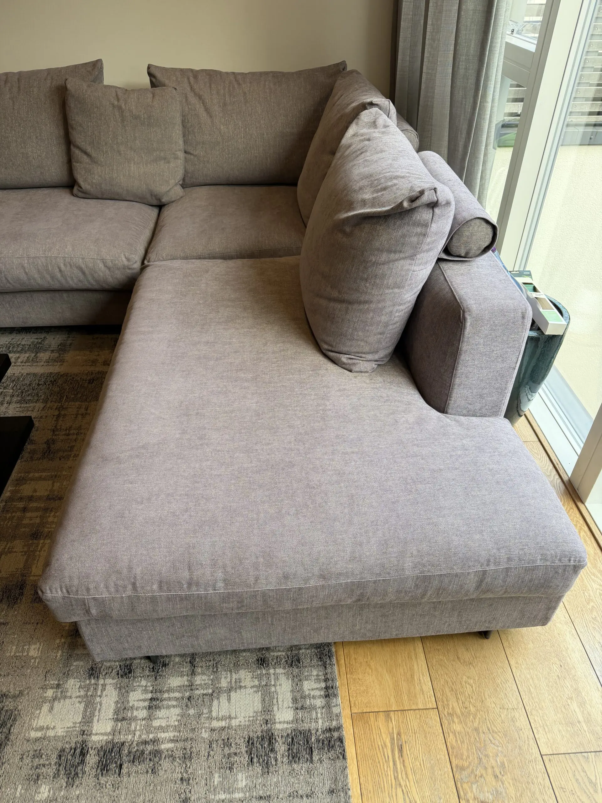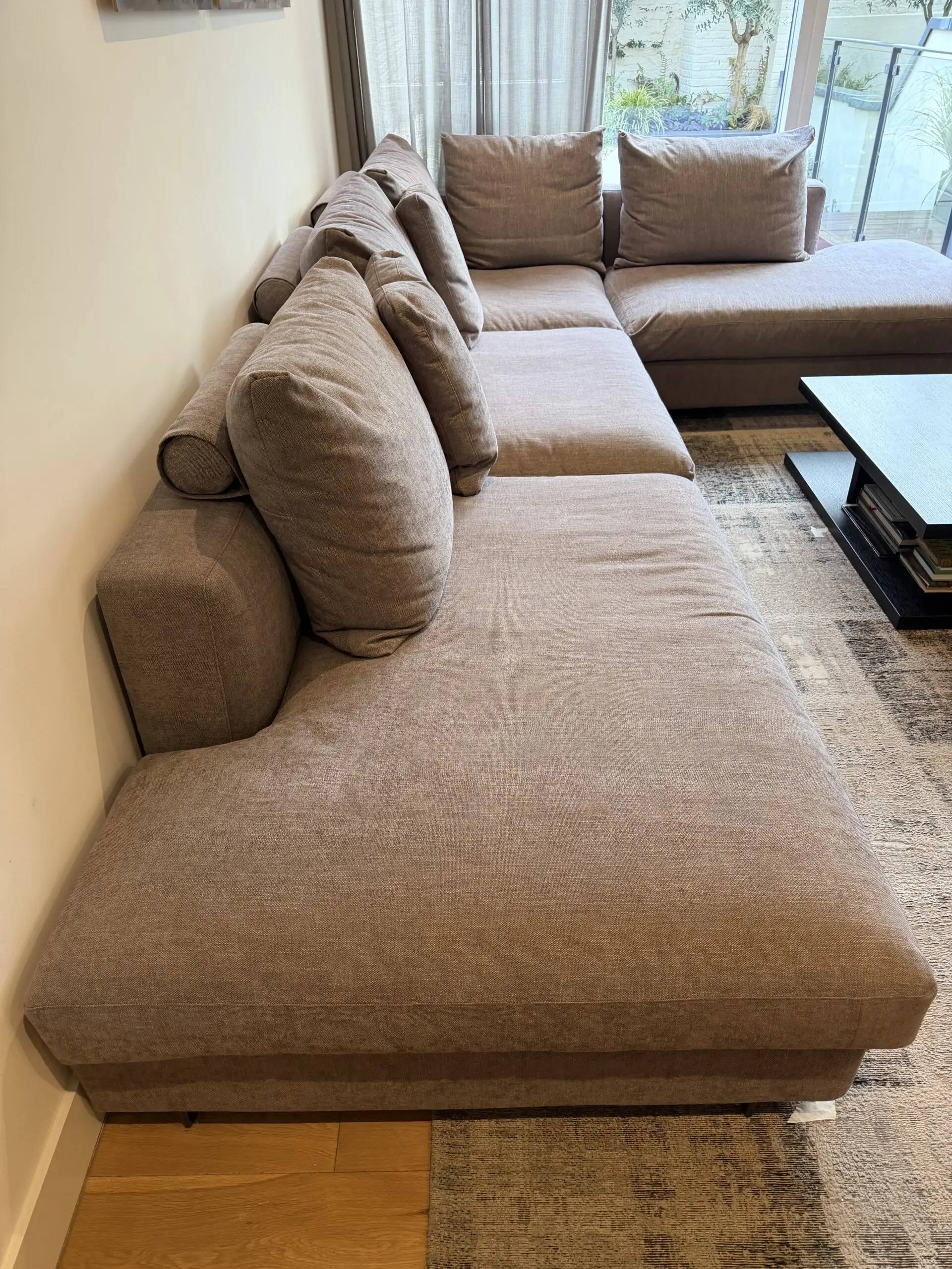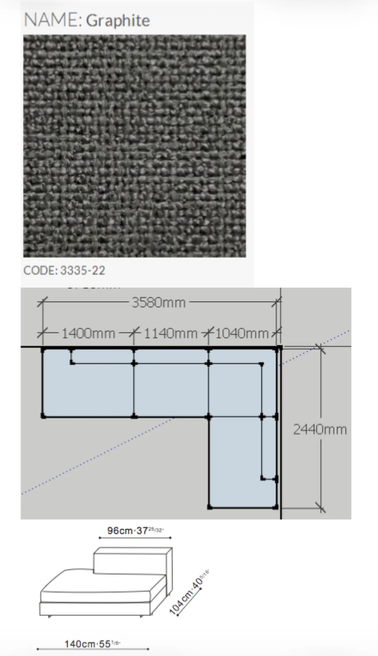 Measurements below: all sections’ seats are 104cm deep. When configured in L shape like below it measures 358cm wide and 244cm long.