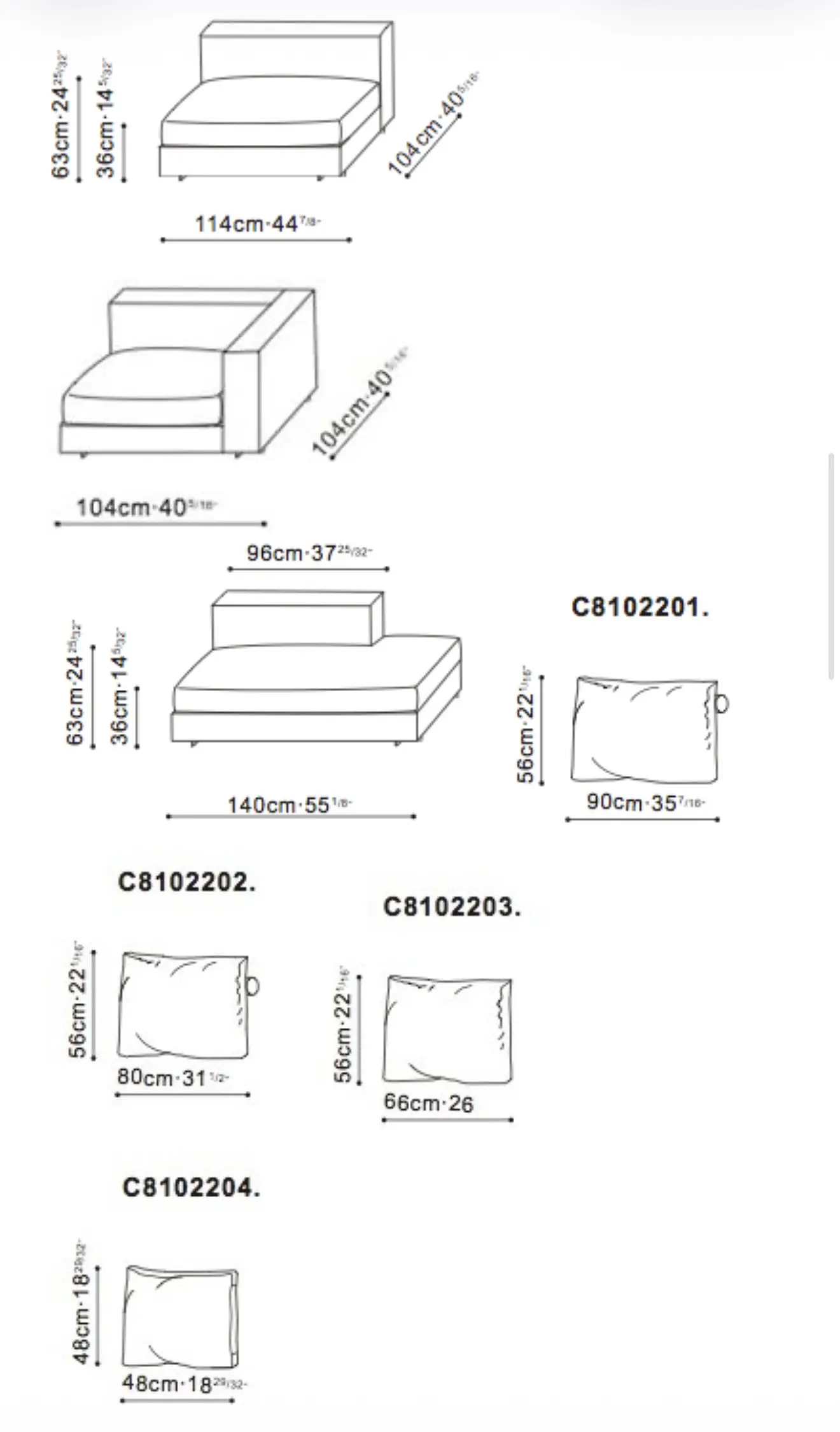 Includes Clouds Small Narrow Sofa Section Right, Large Narrow Armless Section, Narrow Chaise Ottoman Right, Narrow Chaise Ottoman Left, 3 Medium Back Cushions with Bolster, 1 Large Back Cushion with Bolster, 1 Small Back Cushion with Bolster, 2 Scatter Cushions