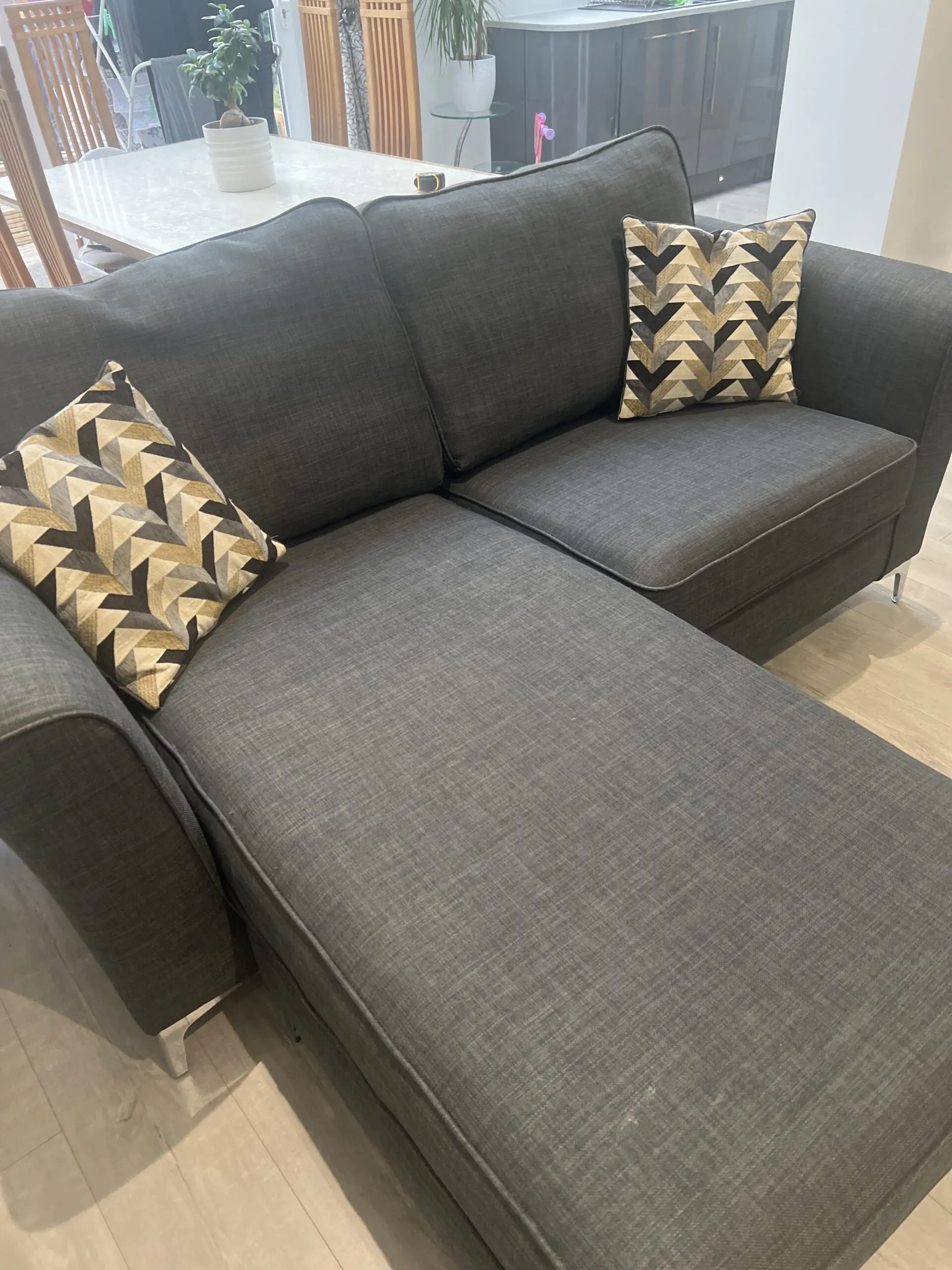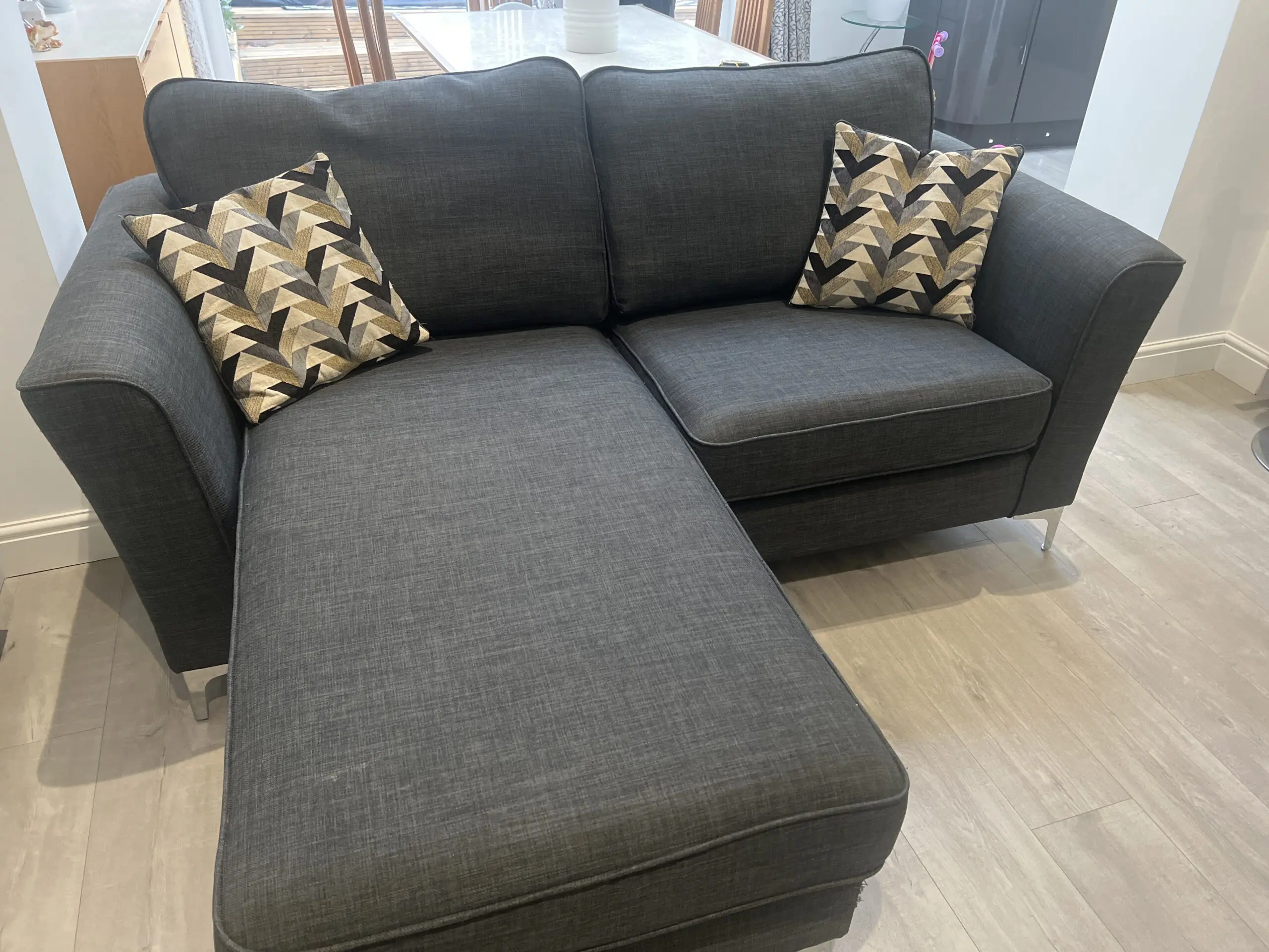 Small sofolgy corner sofa. 3 seater. Around five years old. 2 scatter cushions included. Chrome feet. Slightly worn on the back corners from cat scratching.