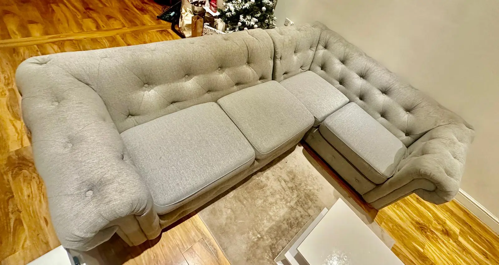 Modern L-shaped corner sofa in a light grey fabric. Comfortable and spacious with deep seats and a classic button-tufted back and arms. Ideal for living rooms or open-plan spaces.