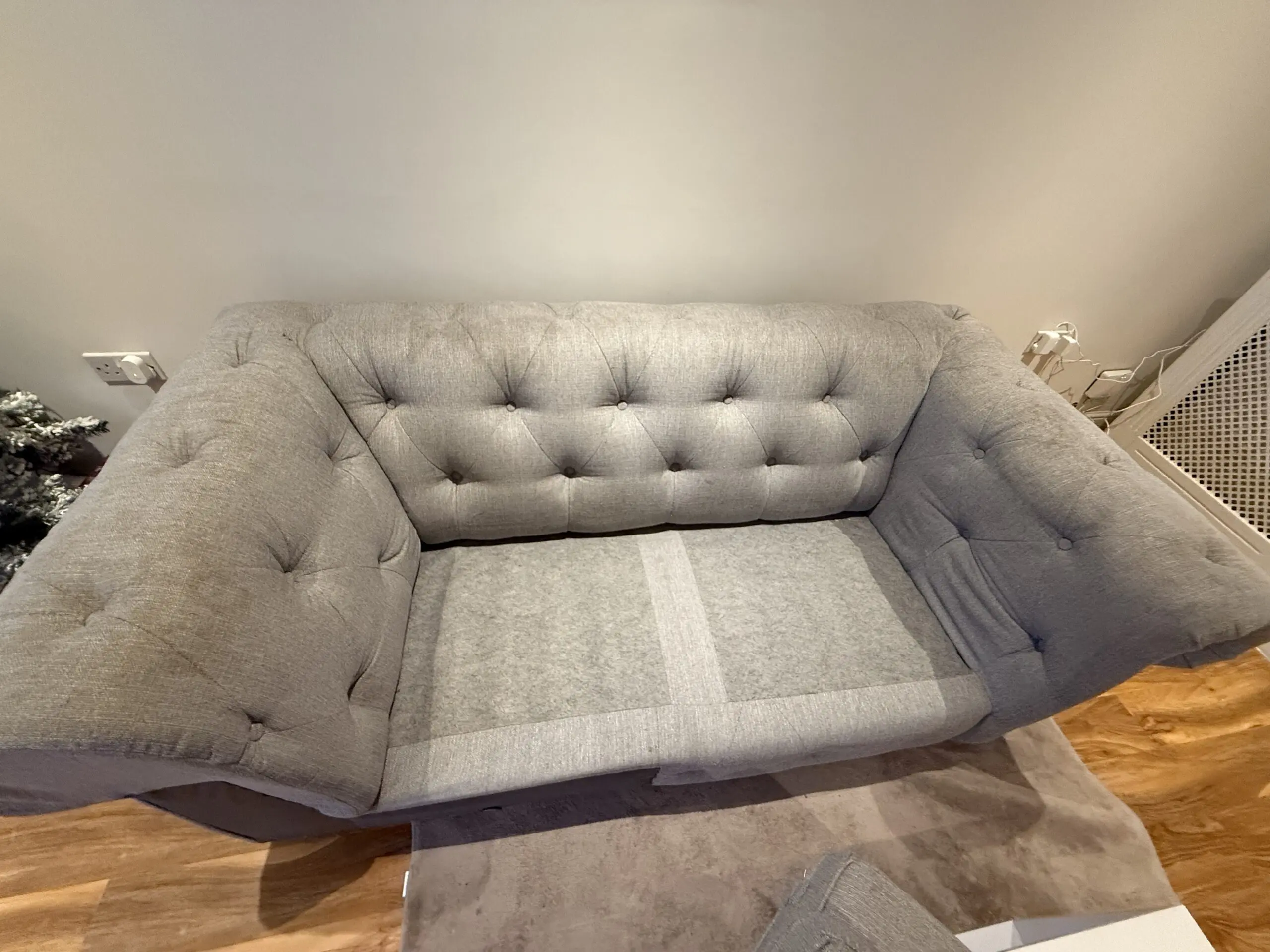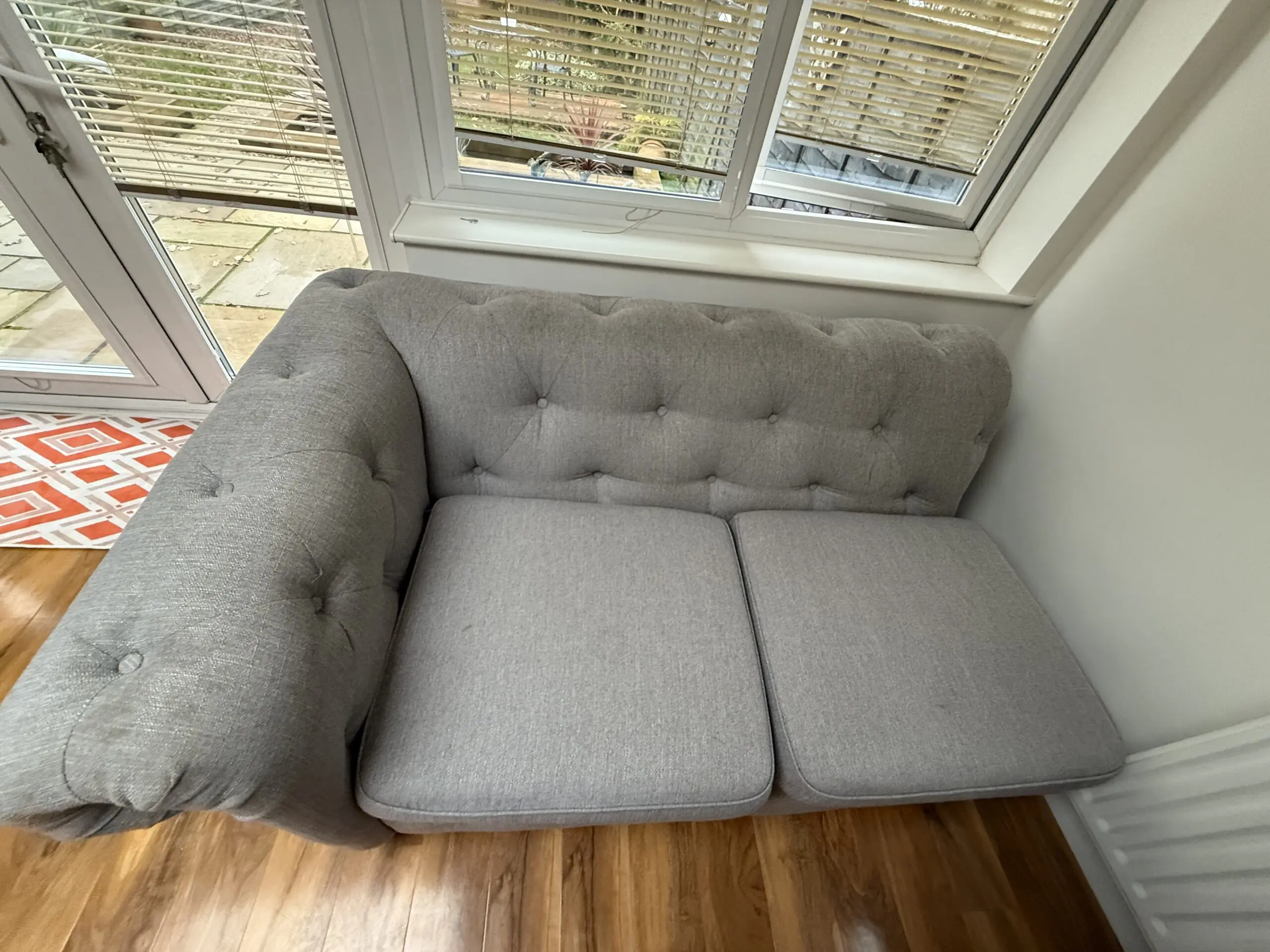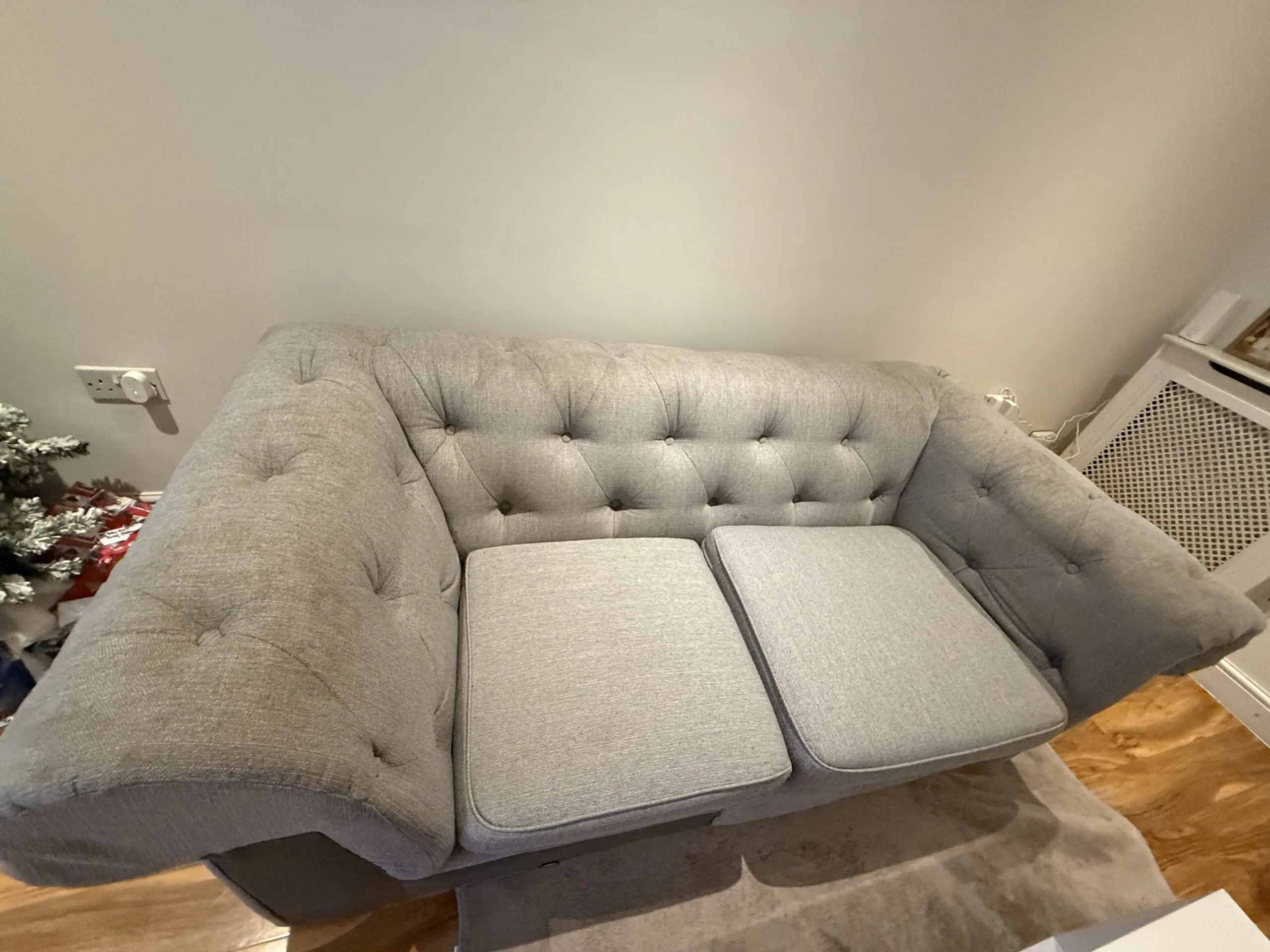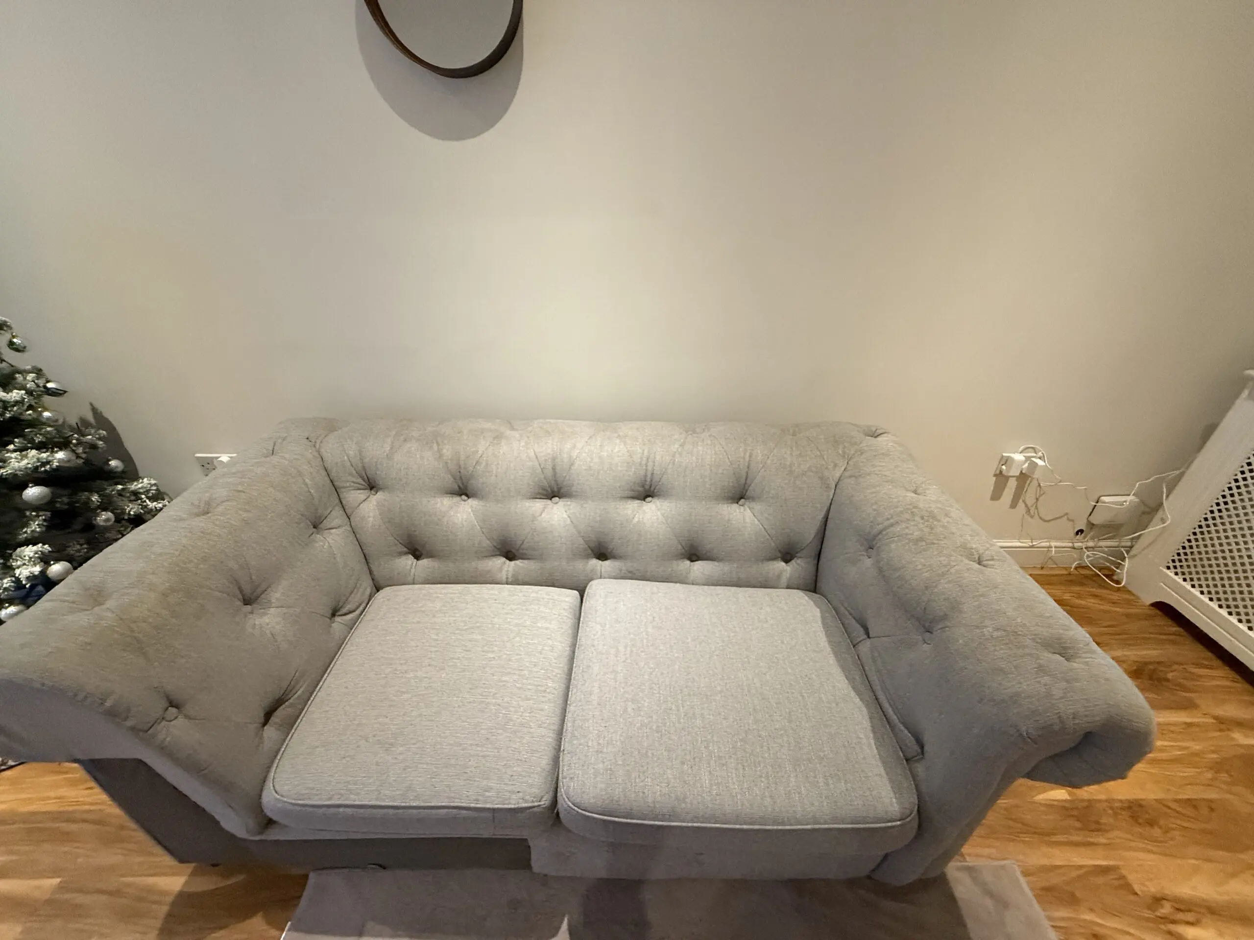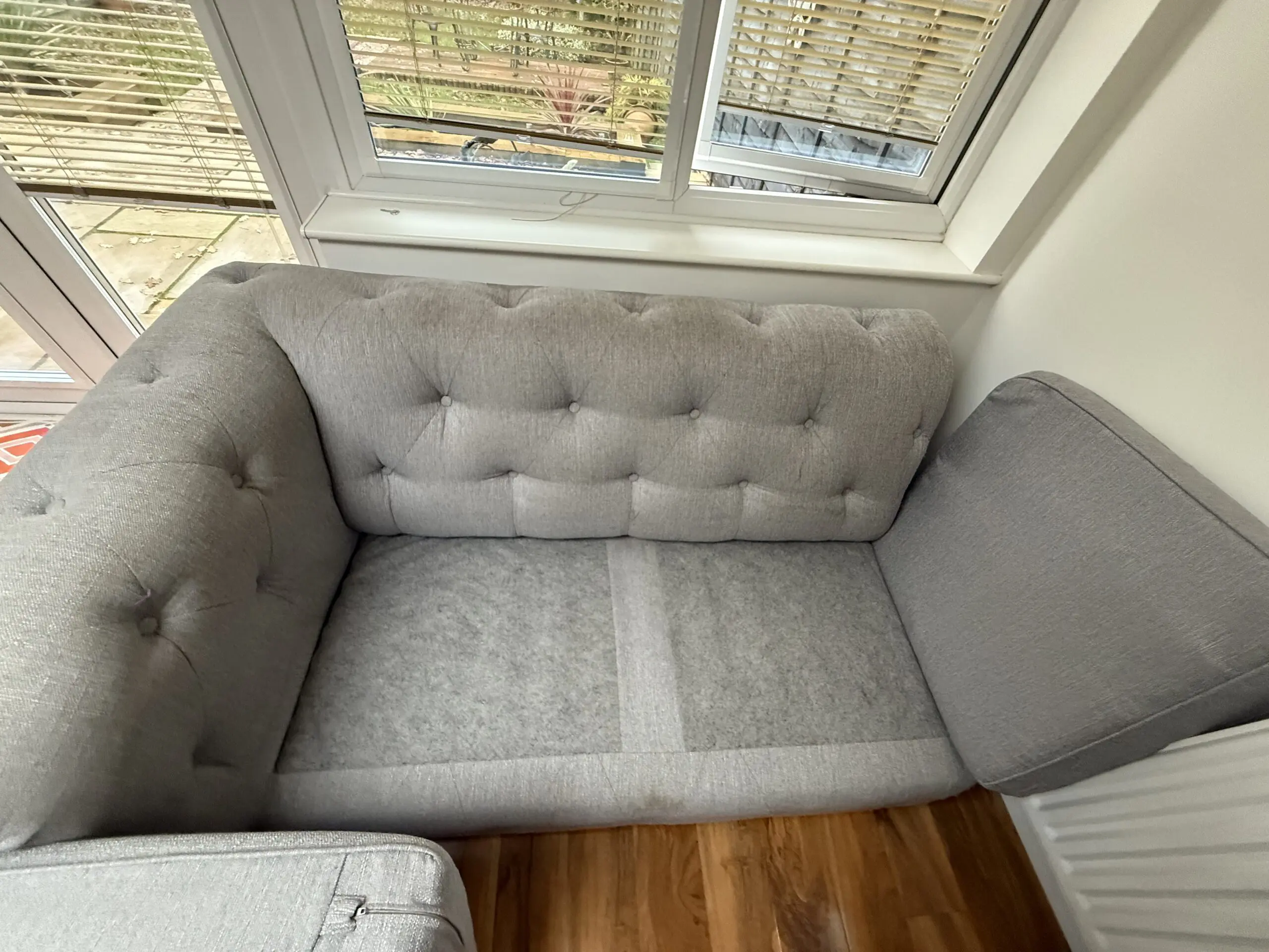 The sofa is around 1 year old and in good overall condition. There are some light stains/marks from normal use, but these are surface-level and can be easily cleaned. No structural damage.