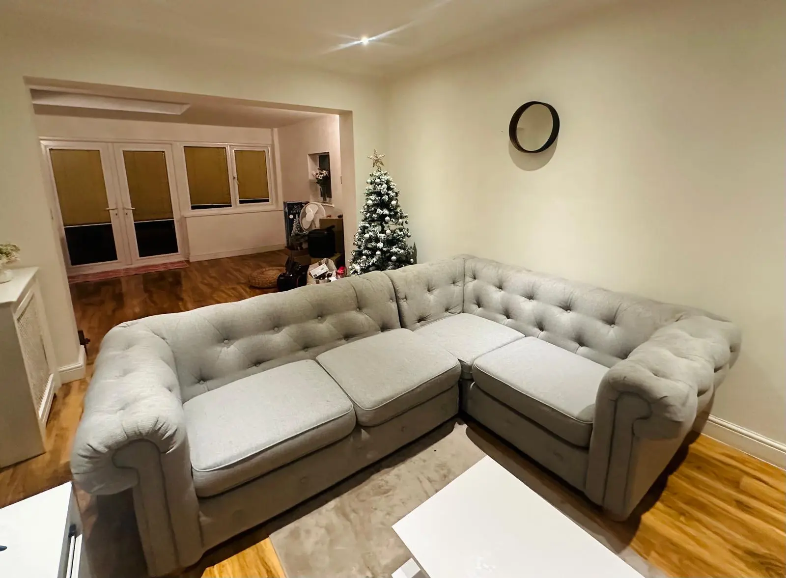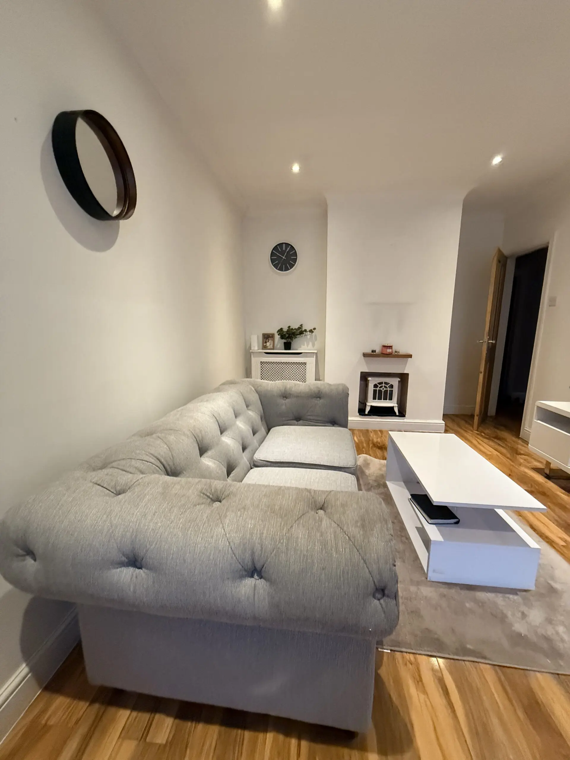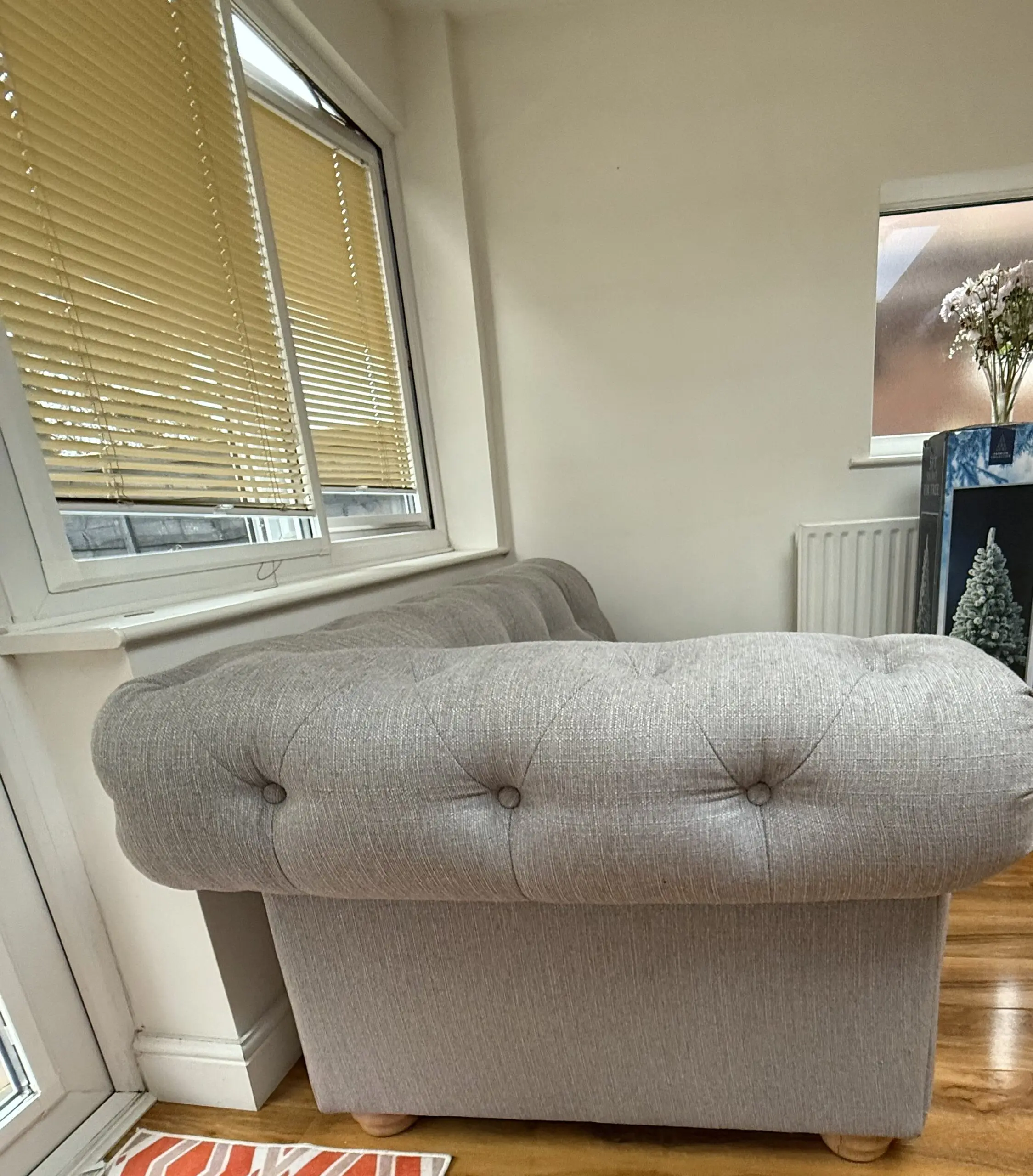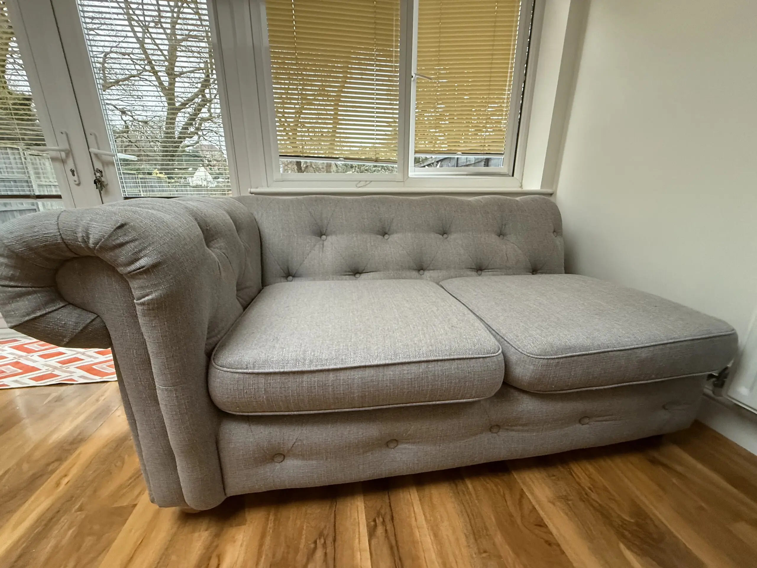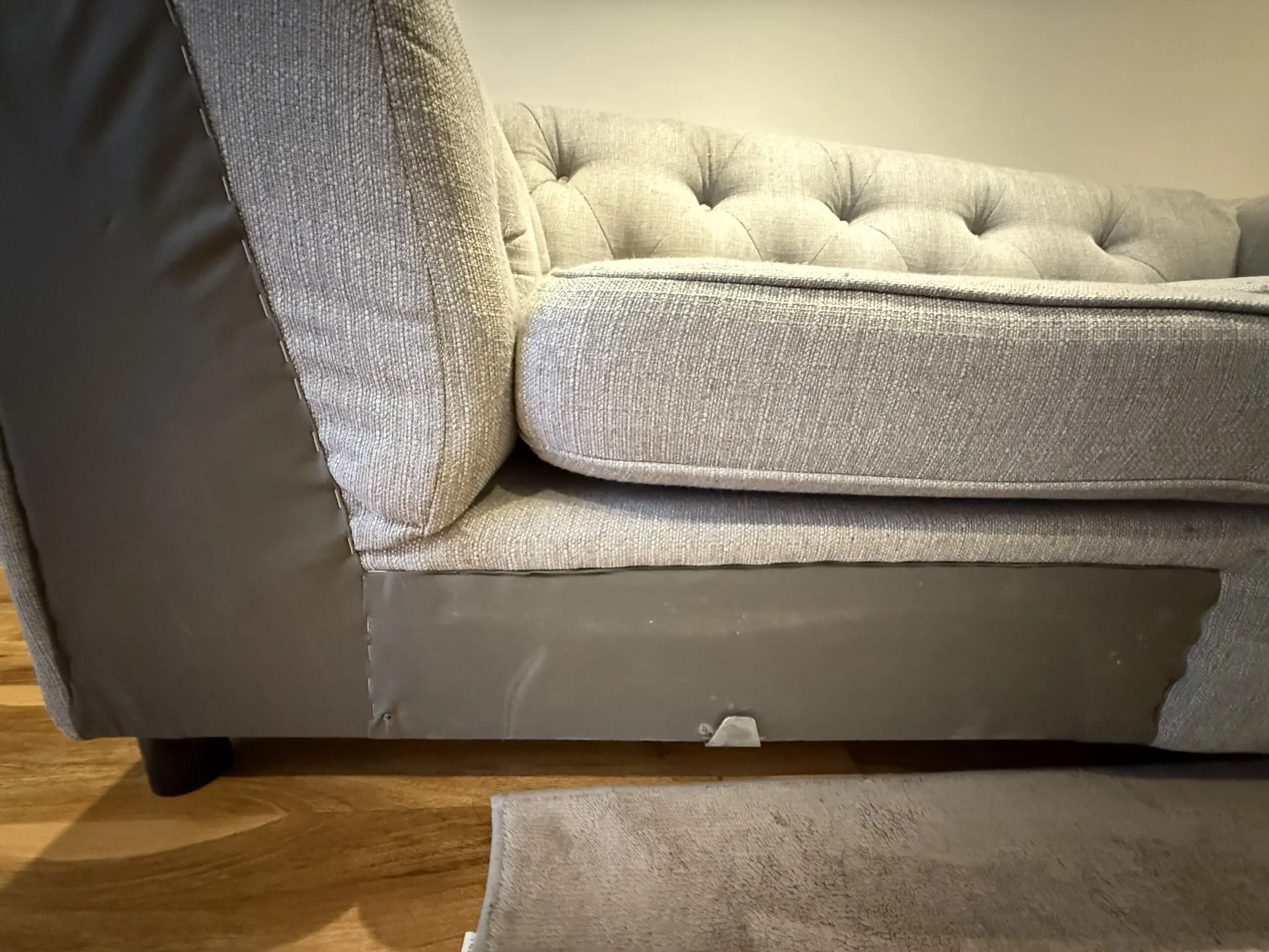 The sofa is around 1 year old and in good overall condition. There are some light stains/marks from normal use, but these are surface-level and can be easily cleaned. No structural damage.