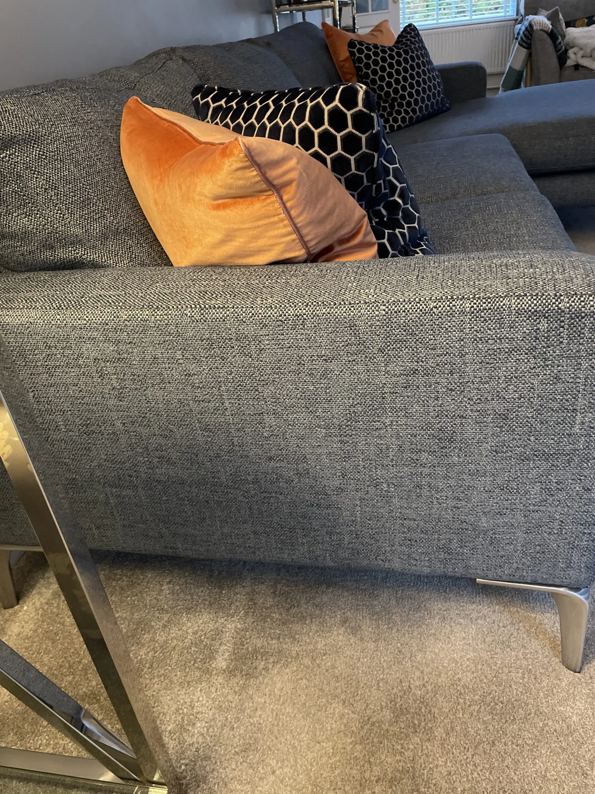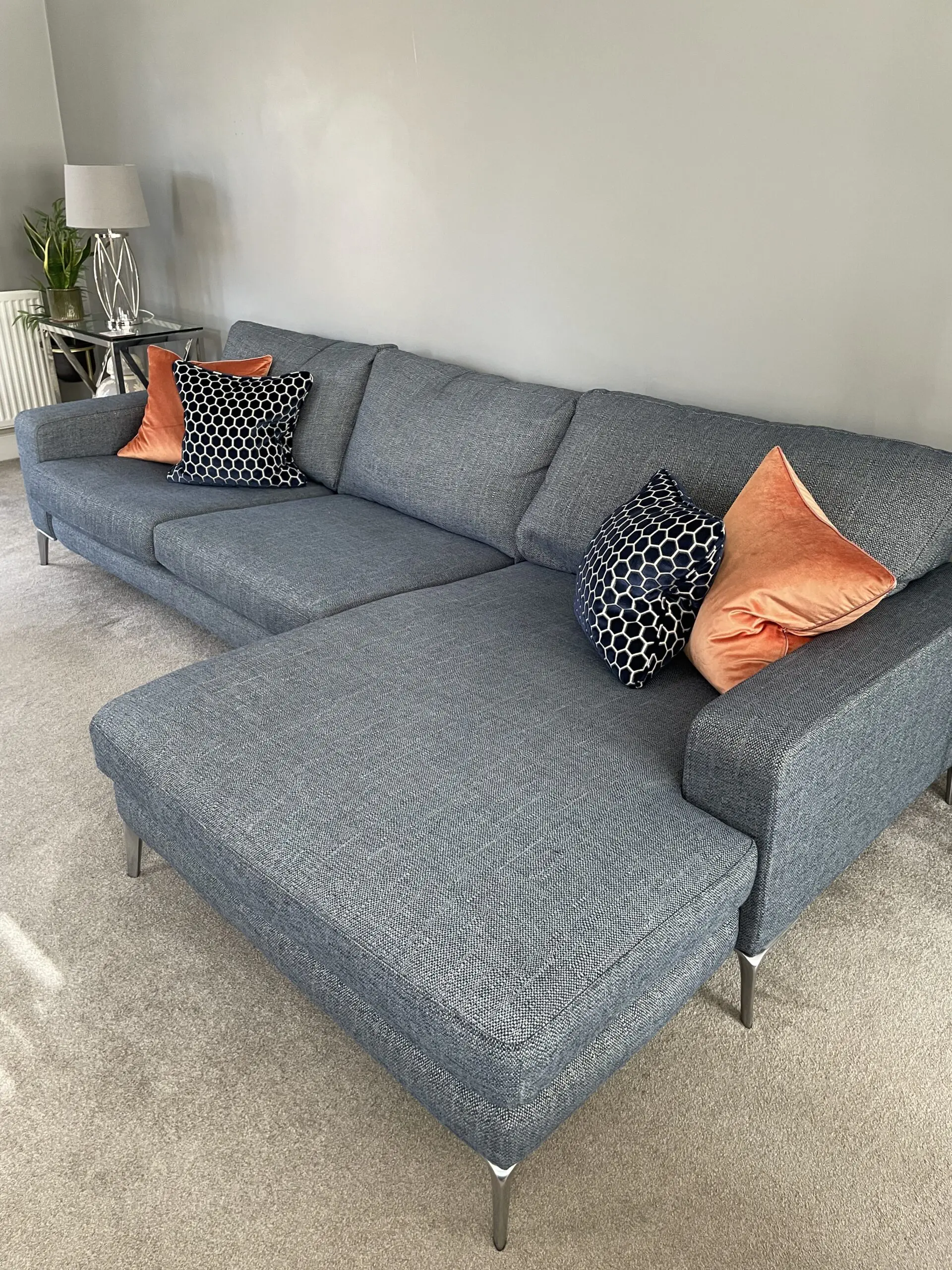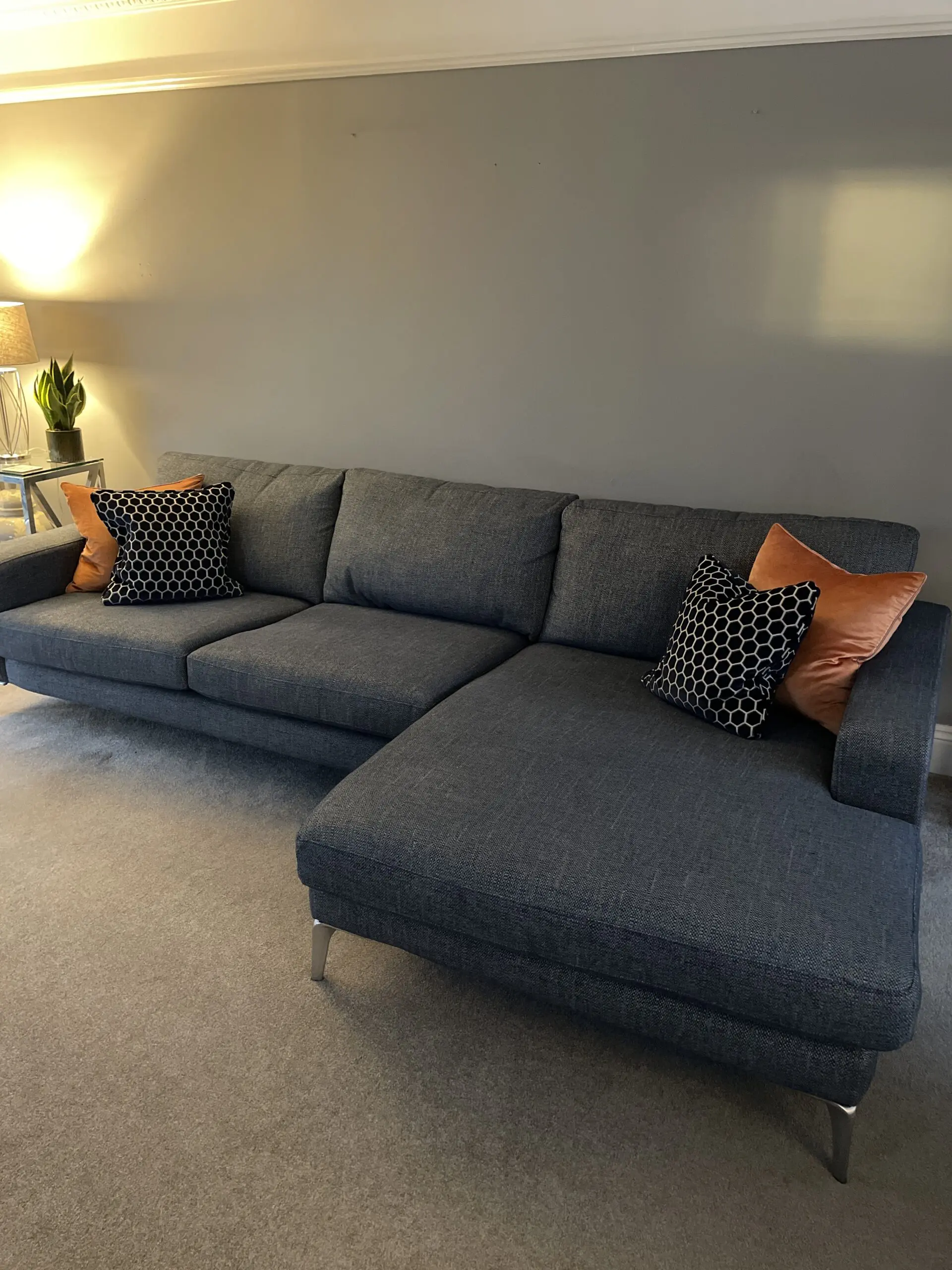Absolutely perfect condition , just 3 years old. Stainguarded with active warranty till 6.9.27. Depth is 1m but with chaise it’s 1650cm. Splits into 2 for transportation. Original cost £2795. Selling as moved and want a change.