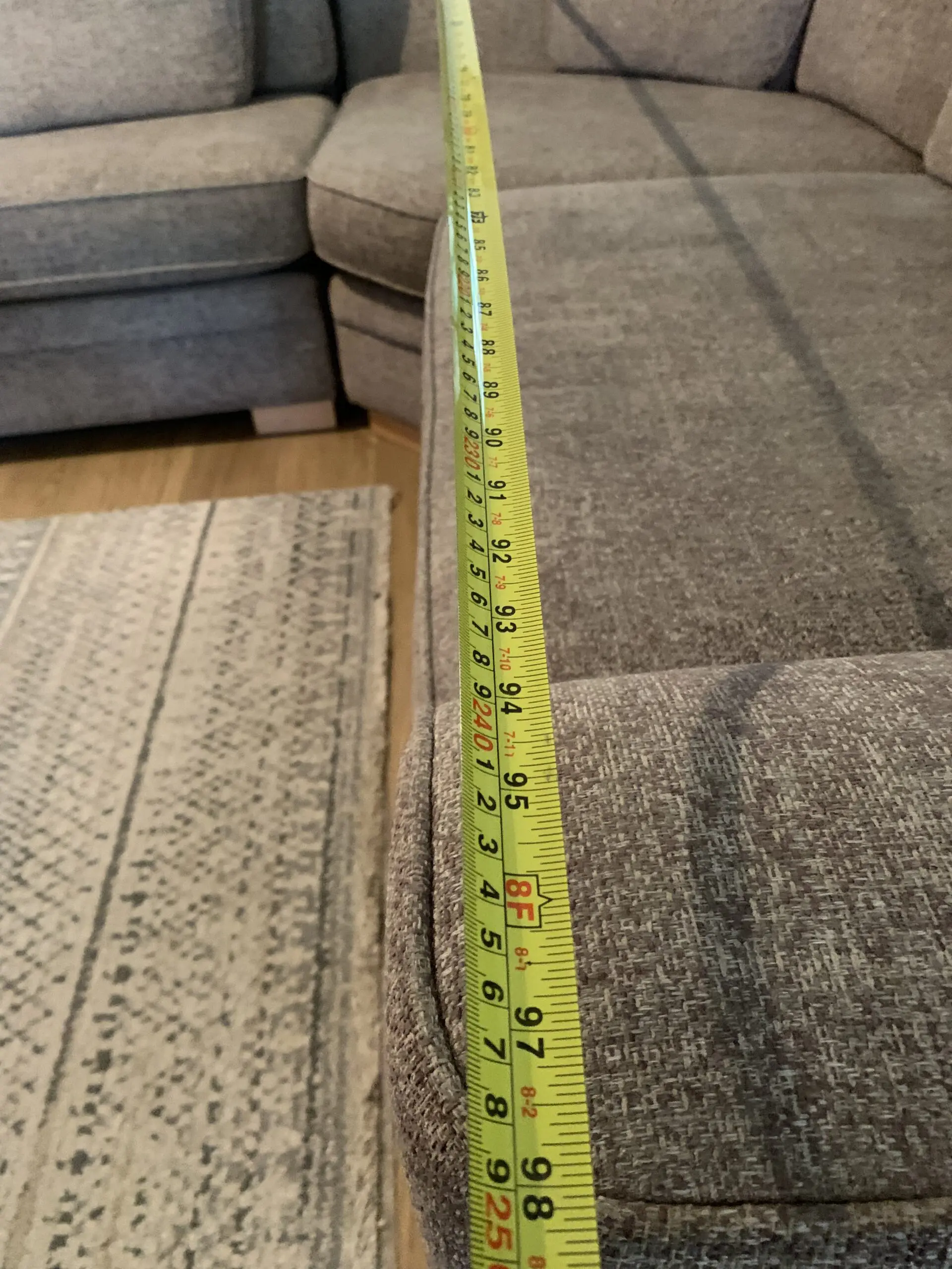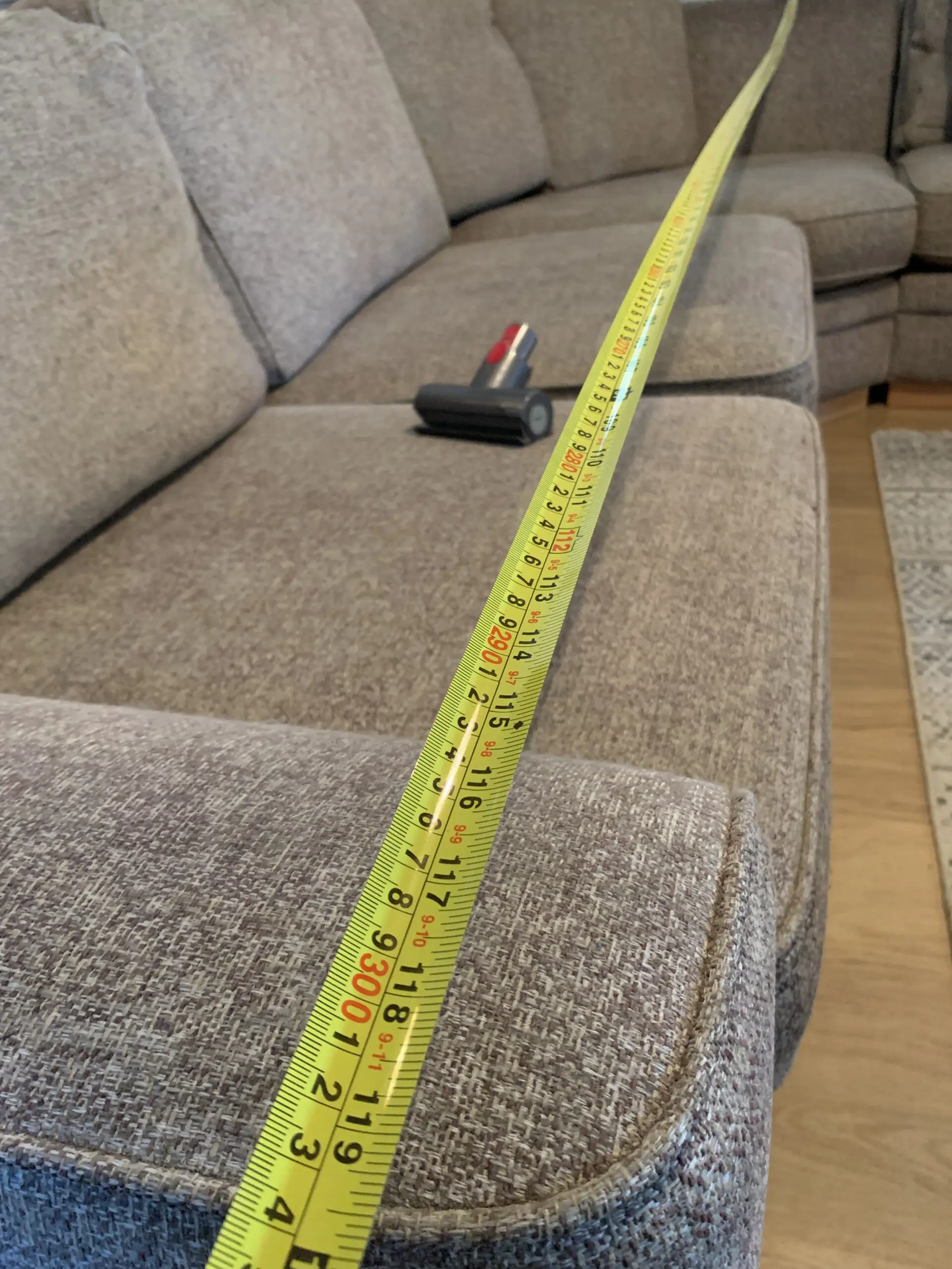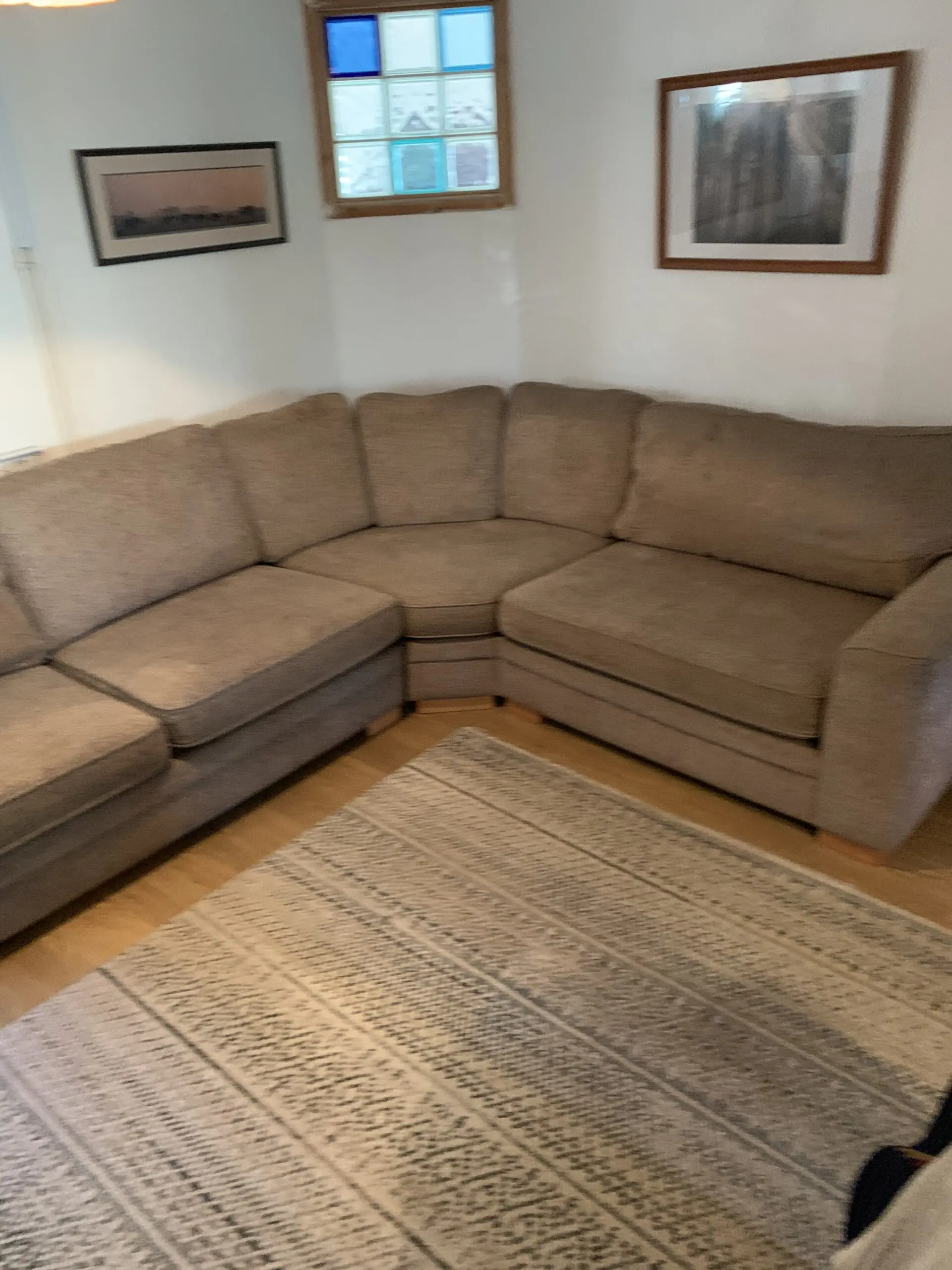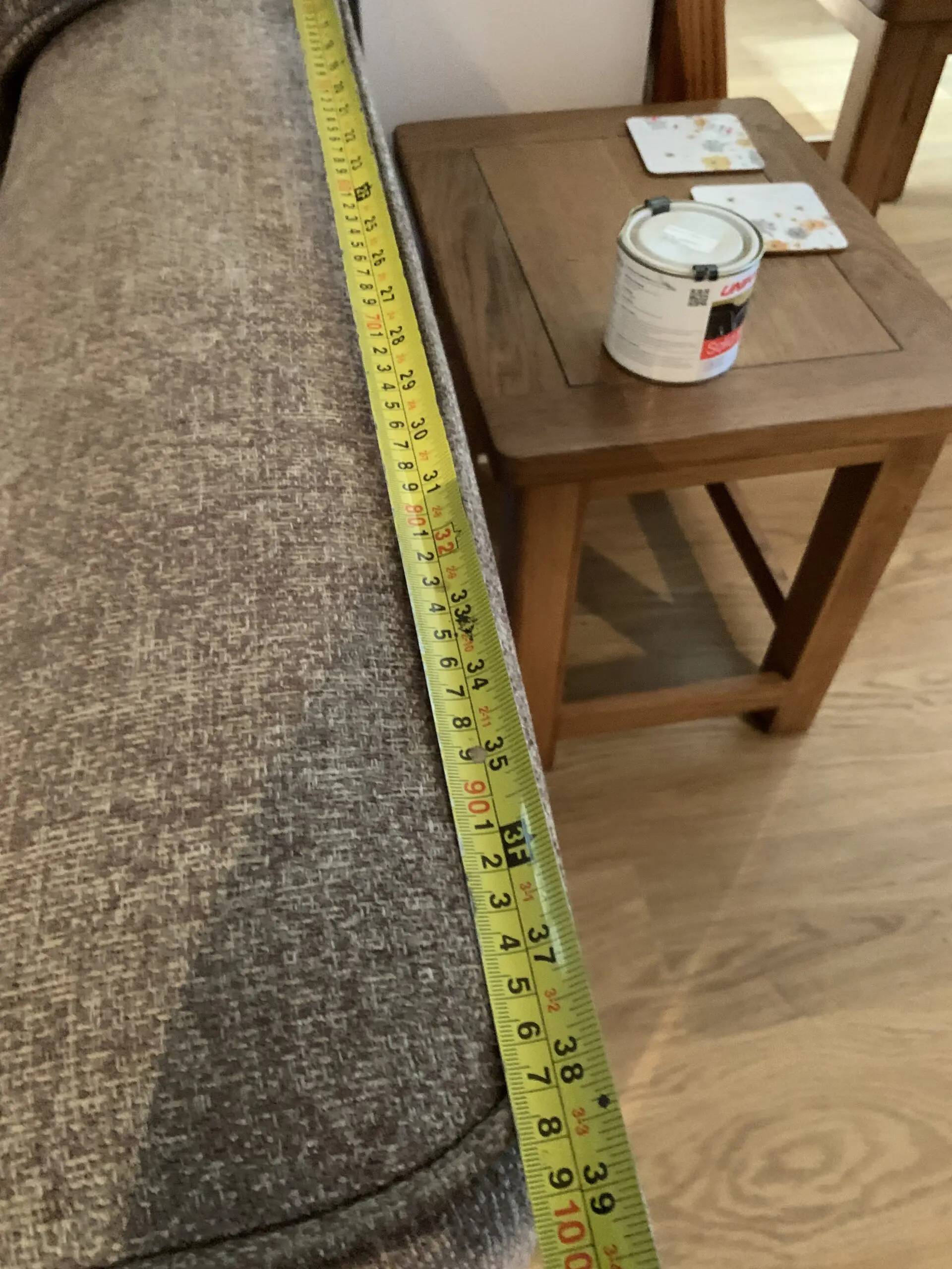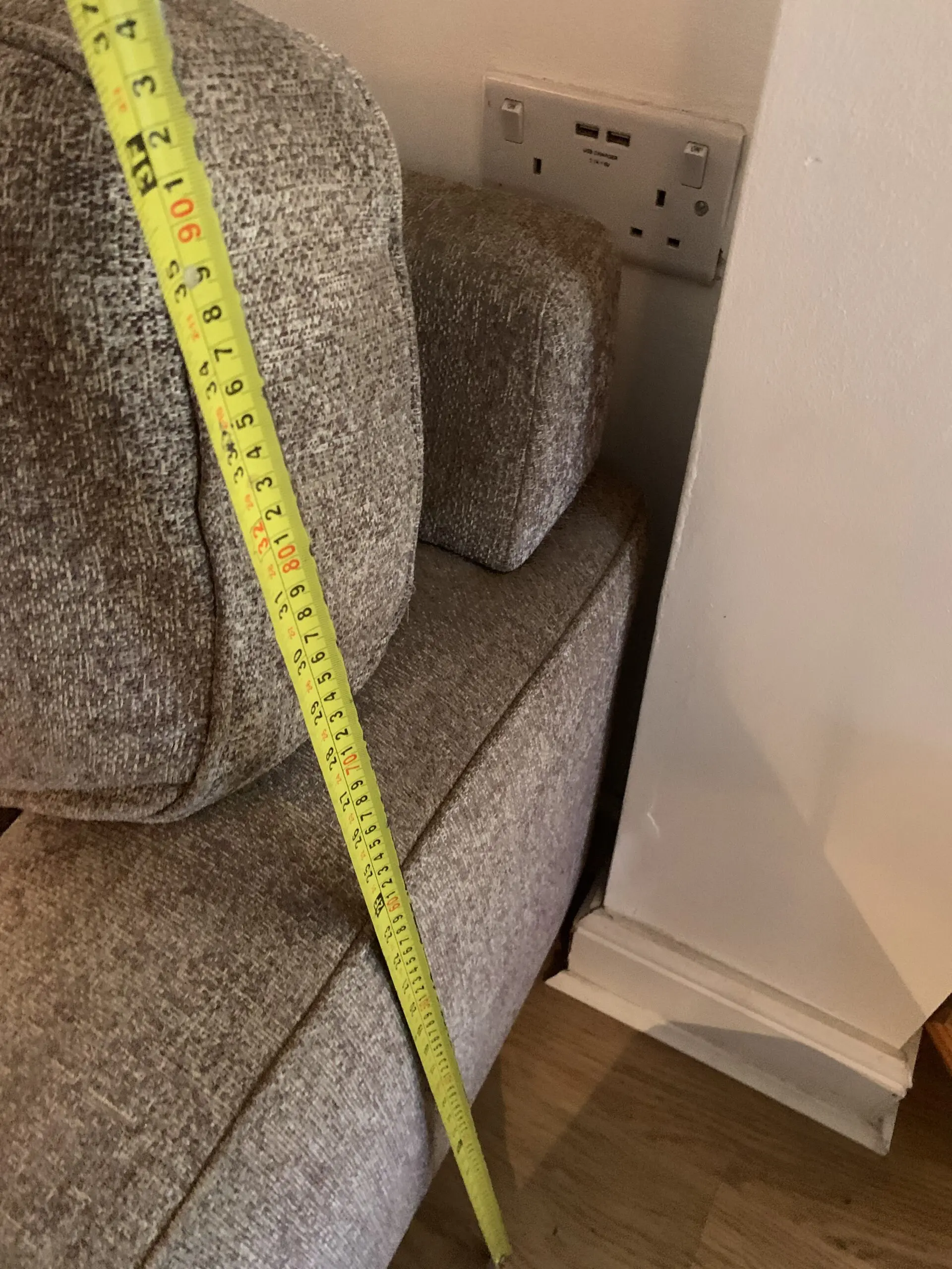 The sofa was bought from Collingwood Batchelor as new. It is a corner unit and the three pieces clip together. The rhs (as you sit on it) of the sofa is larger than the lhs. The corner unit curves and has room for a user’s legs. The length measurements are from arm rest to wall.