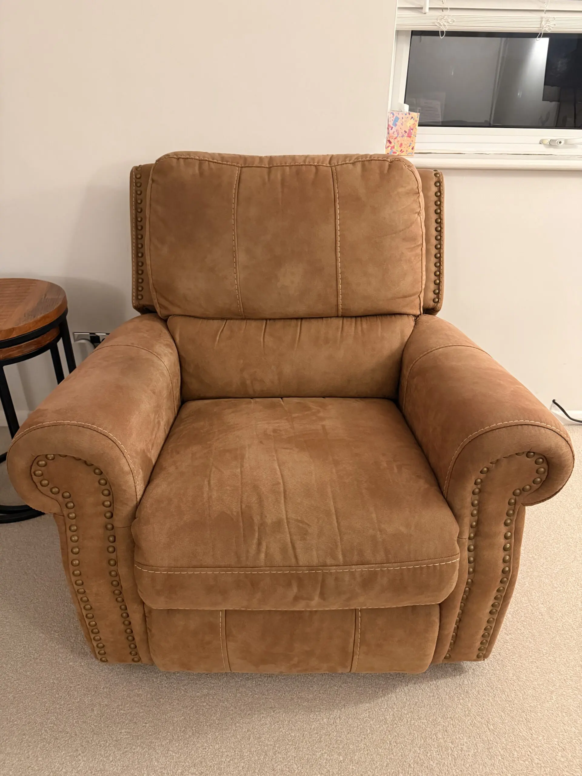 Comfortable 1-seater electric recliner armchair from Oak Furniture Land in a warm tan/biscuit microfiber-style fabric, perfect for creating a cosy reading or TV corner. Generously padded seat, back and armrests provide excellent support, with a high back for added neck and shoulder comfort.