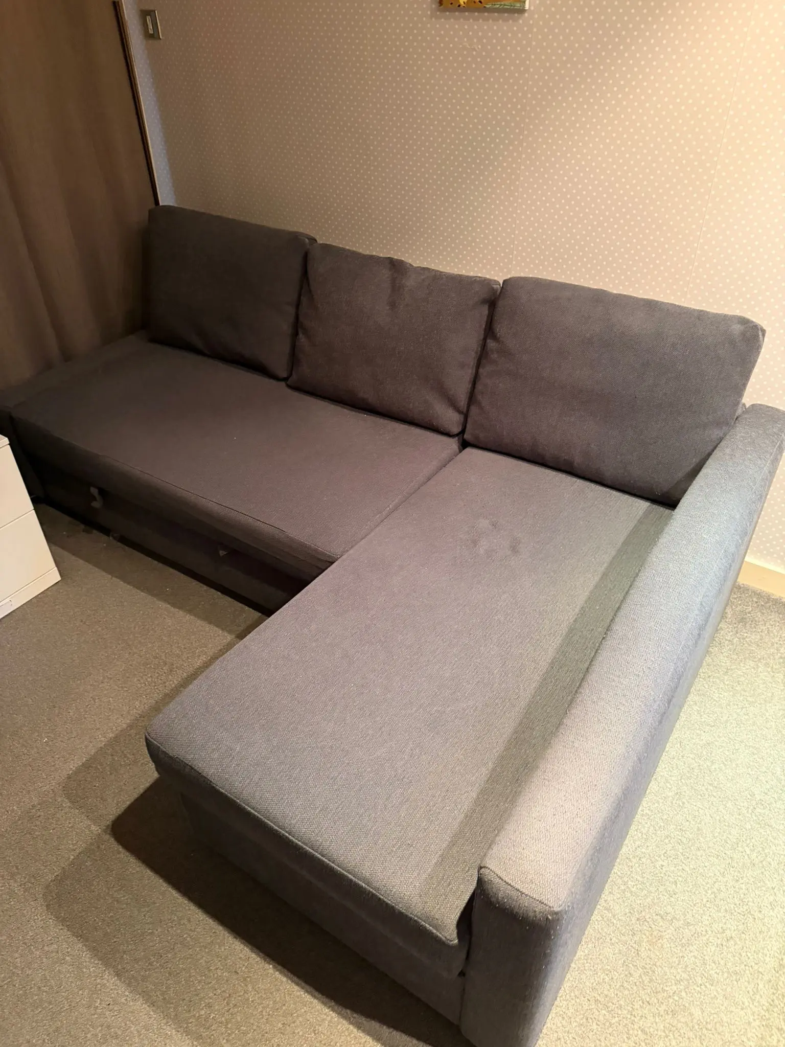 IKEA FRIHETEN corner sofa-bed with storage (Skiftebo dark grey). Overall in very good used condition: fabric is clean and presentable, with only minor signs of use (small light marks/patches in a couple of areas as shown in photos). No rips or tears. All cushions included. Sofa-bed mechanism and storage compartment work as they should.