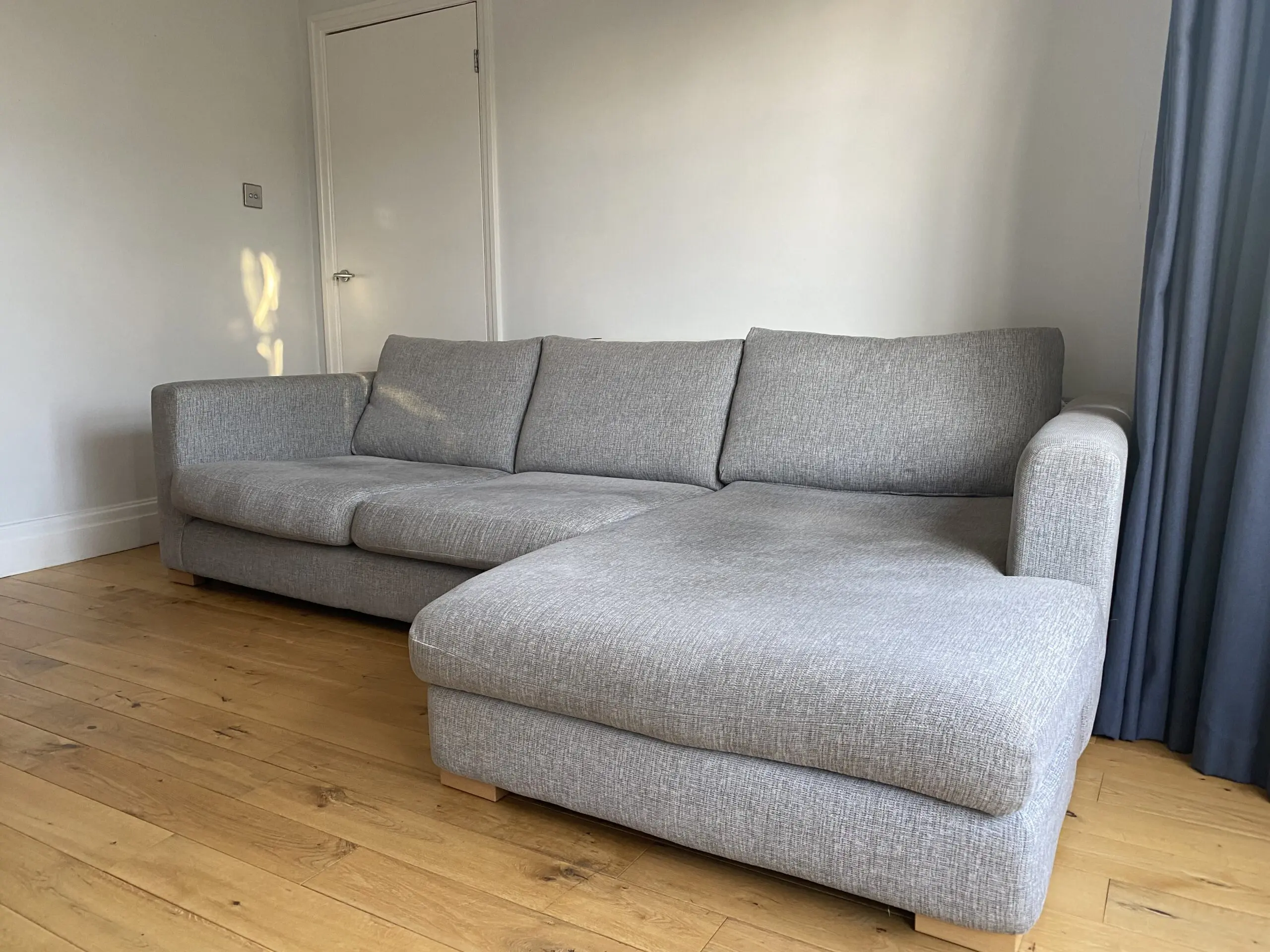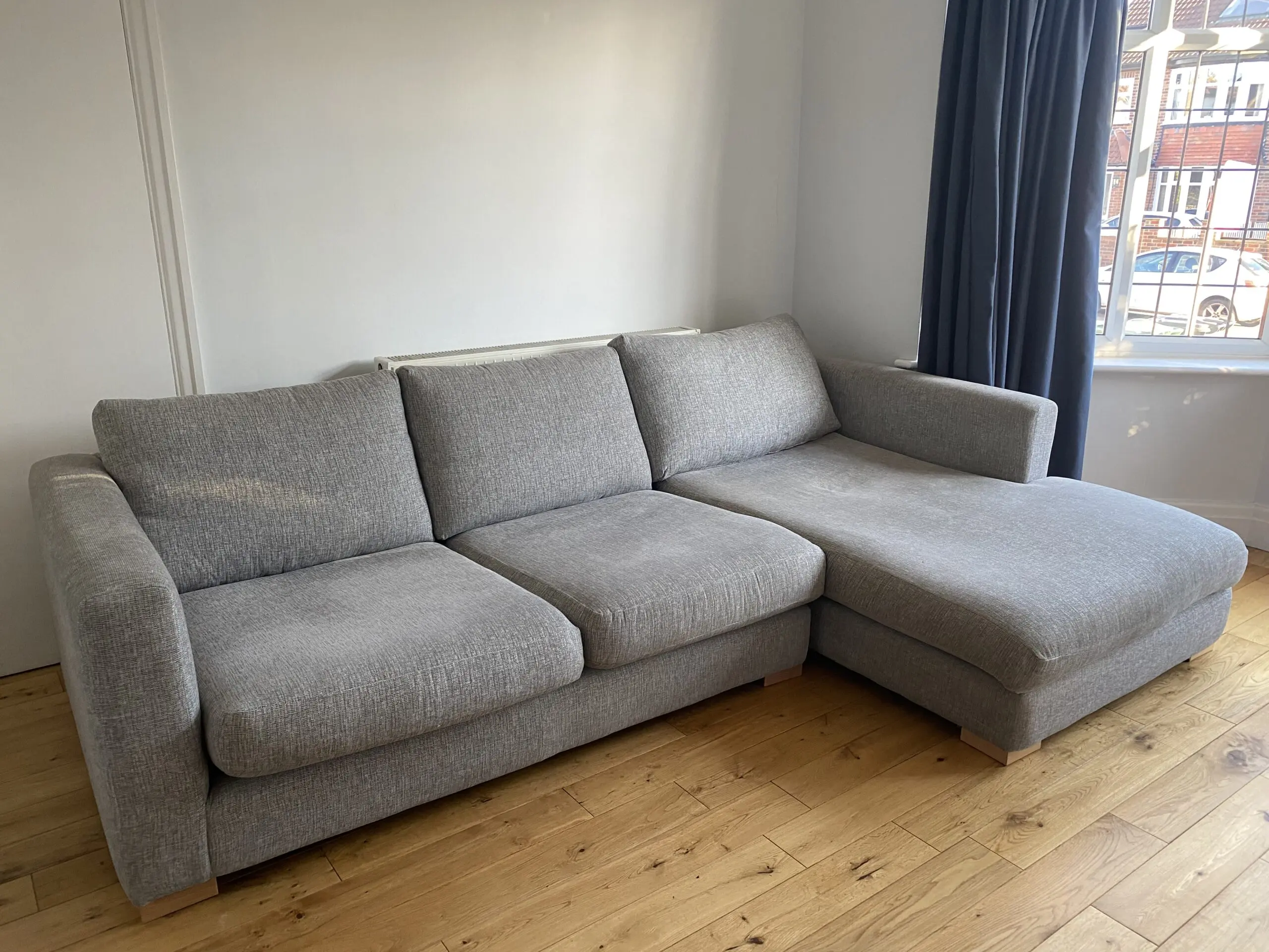 Stylish Barker and Stonehouse right hand chaise corner sofa in light grey, used but in excellent condition. Super comfortable, modern design.
