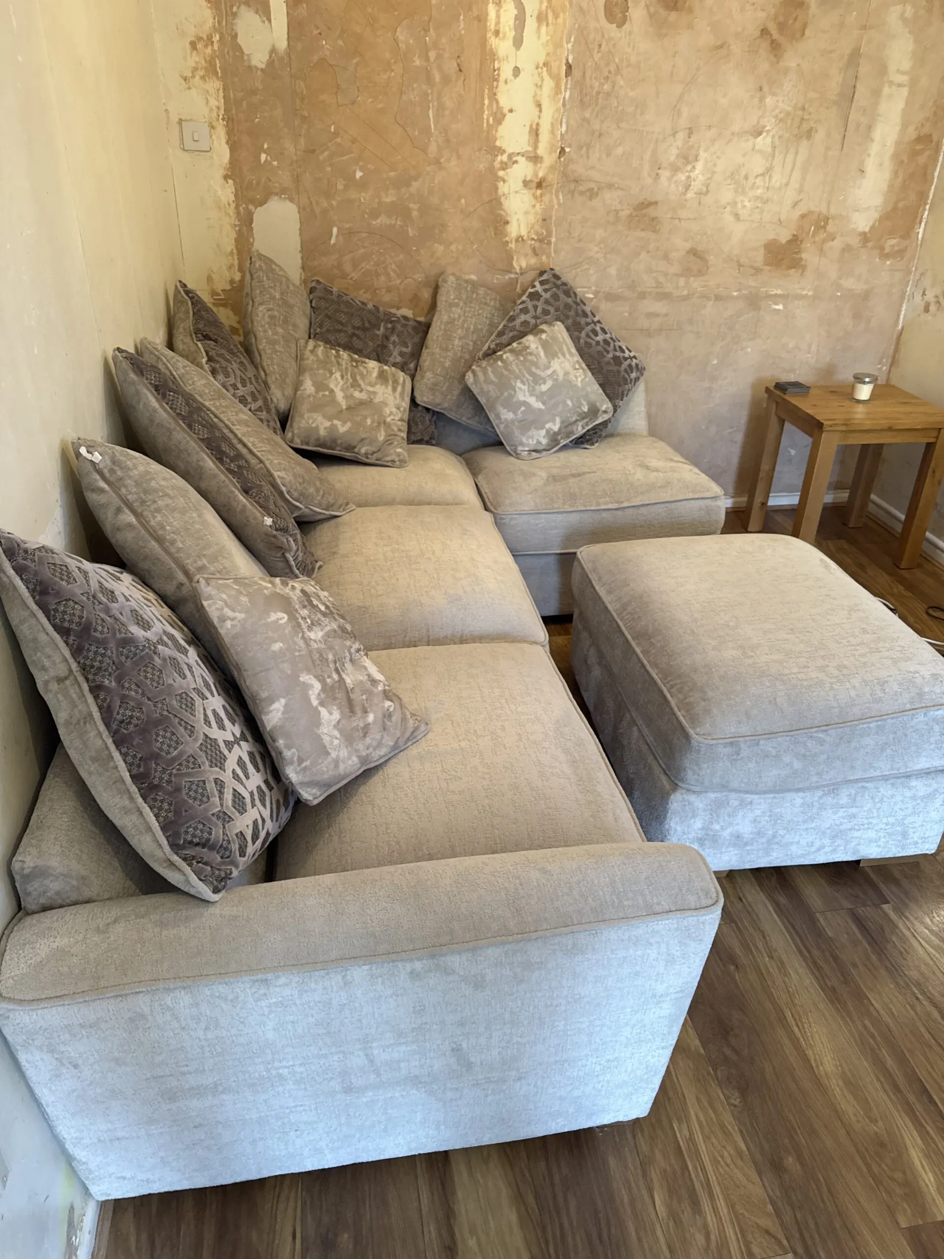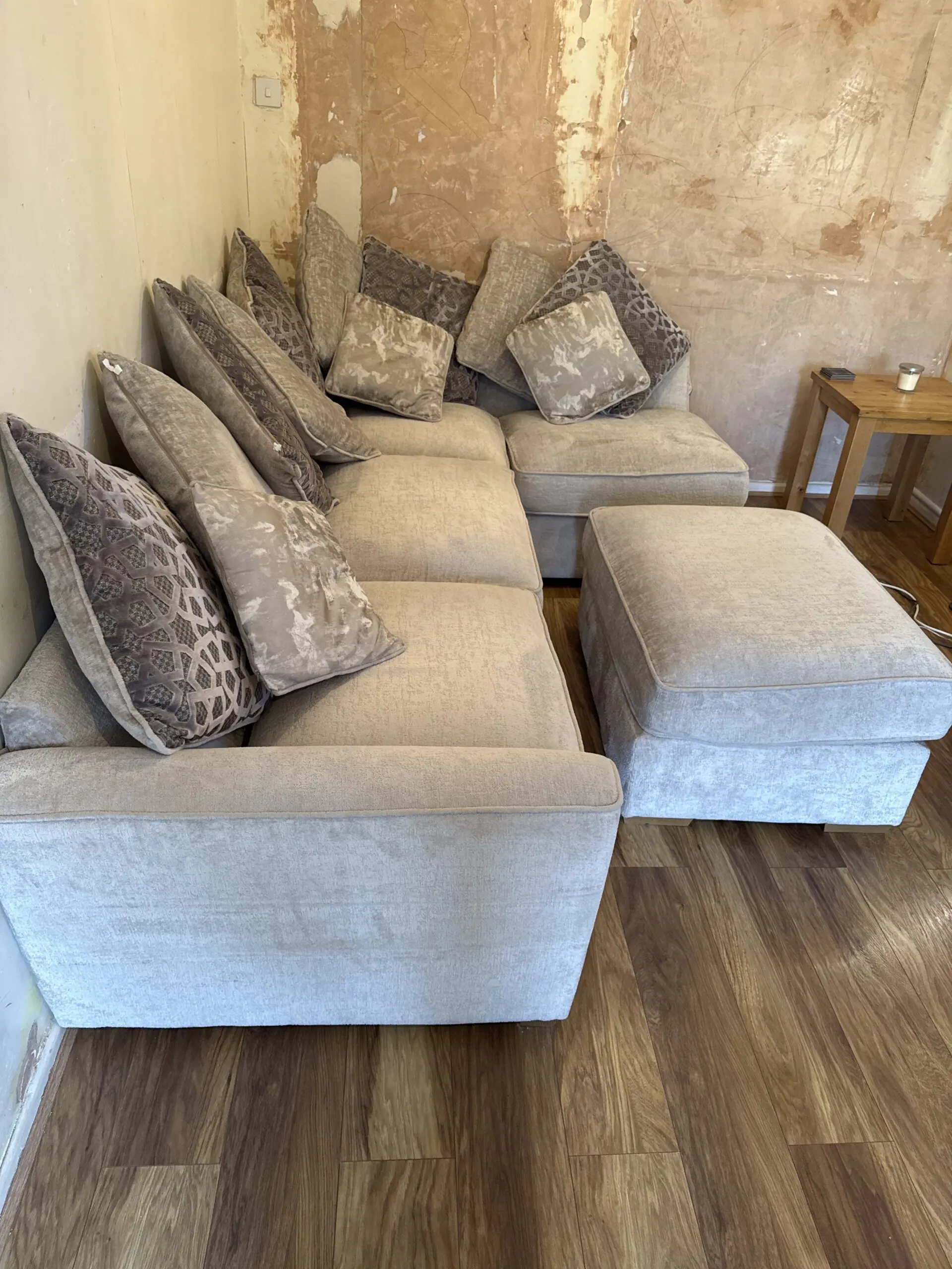 This spacious corner sofa offers excellent seating for the whole family with its generous proportions and comfortable design. The L-shaped configuration maximises your living space whilst providing ample room for relaxation. Complete with matching footstool and an array of coordinating scatter cushions in complementary patterns and textures. Perfect for modern living rooms, this versatile piece combines style and comfort for everyday use.