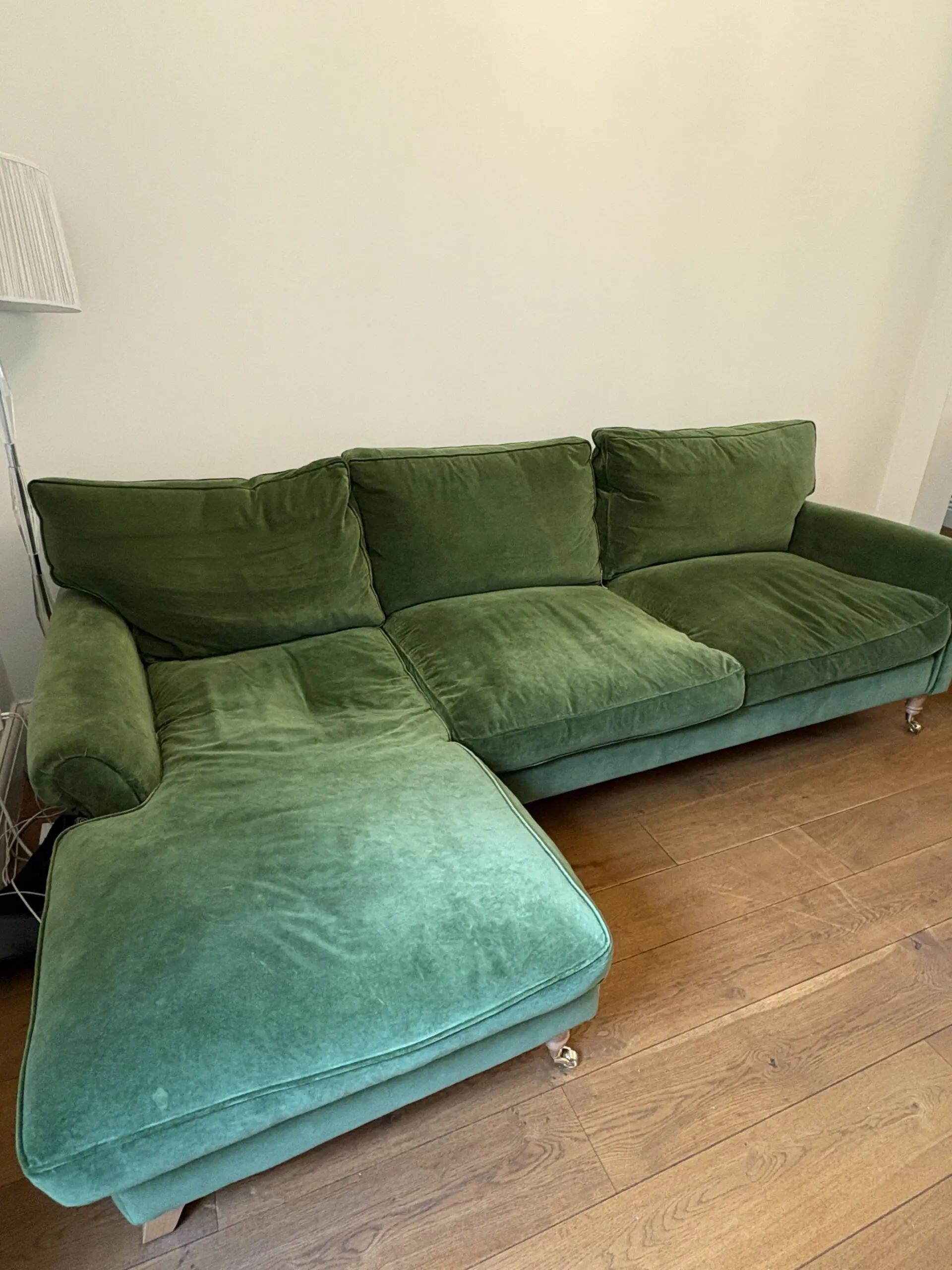 A left hand corner sofa from Cotswold company. Beautiful green colour with wooden legs and golden wheel. Large and comfortable, in good condition.