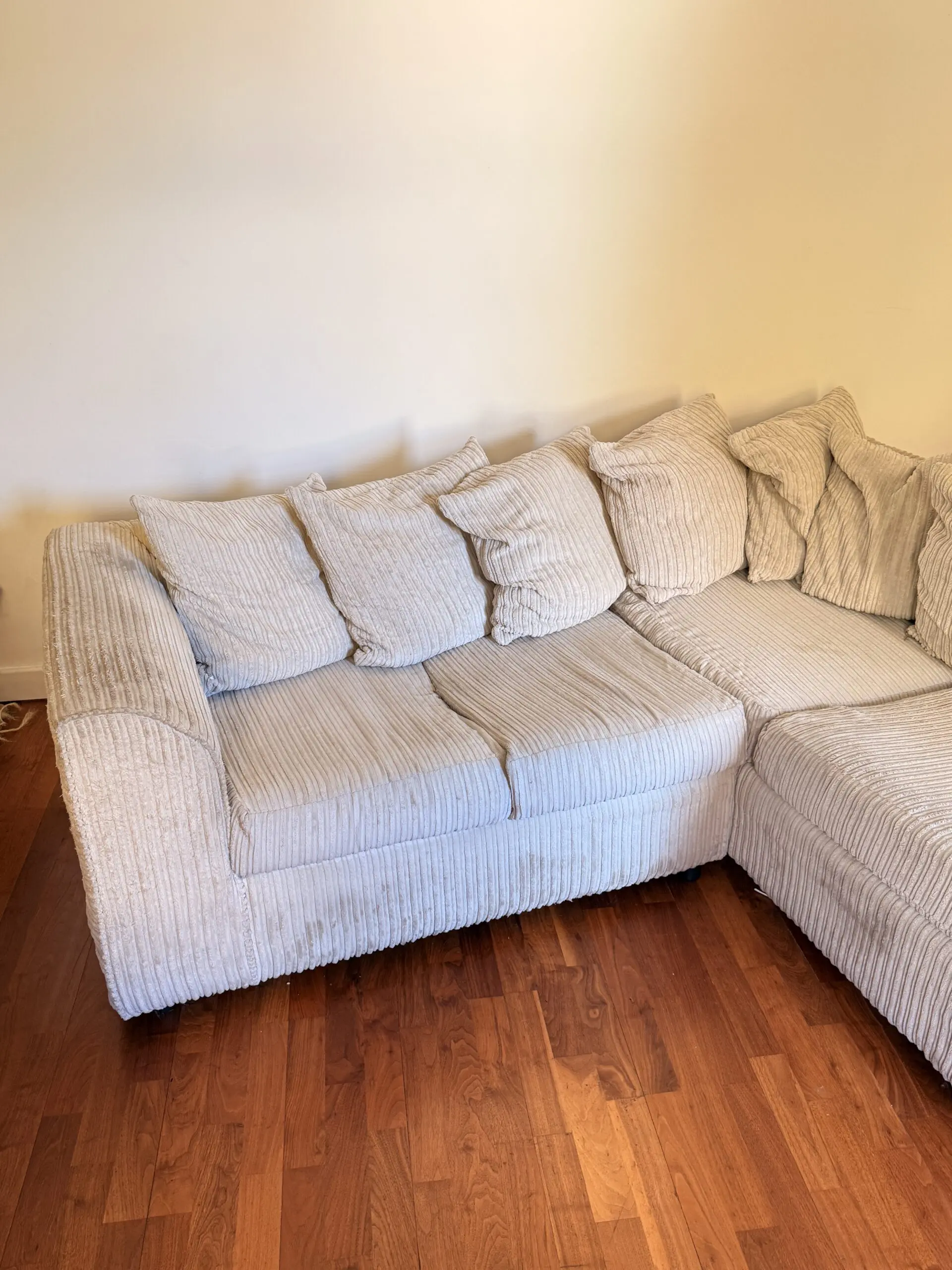 Freshly washed, all cushion covers easily removable. Cord Material in cream colour. No noticeable marks.