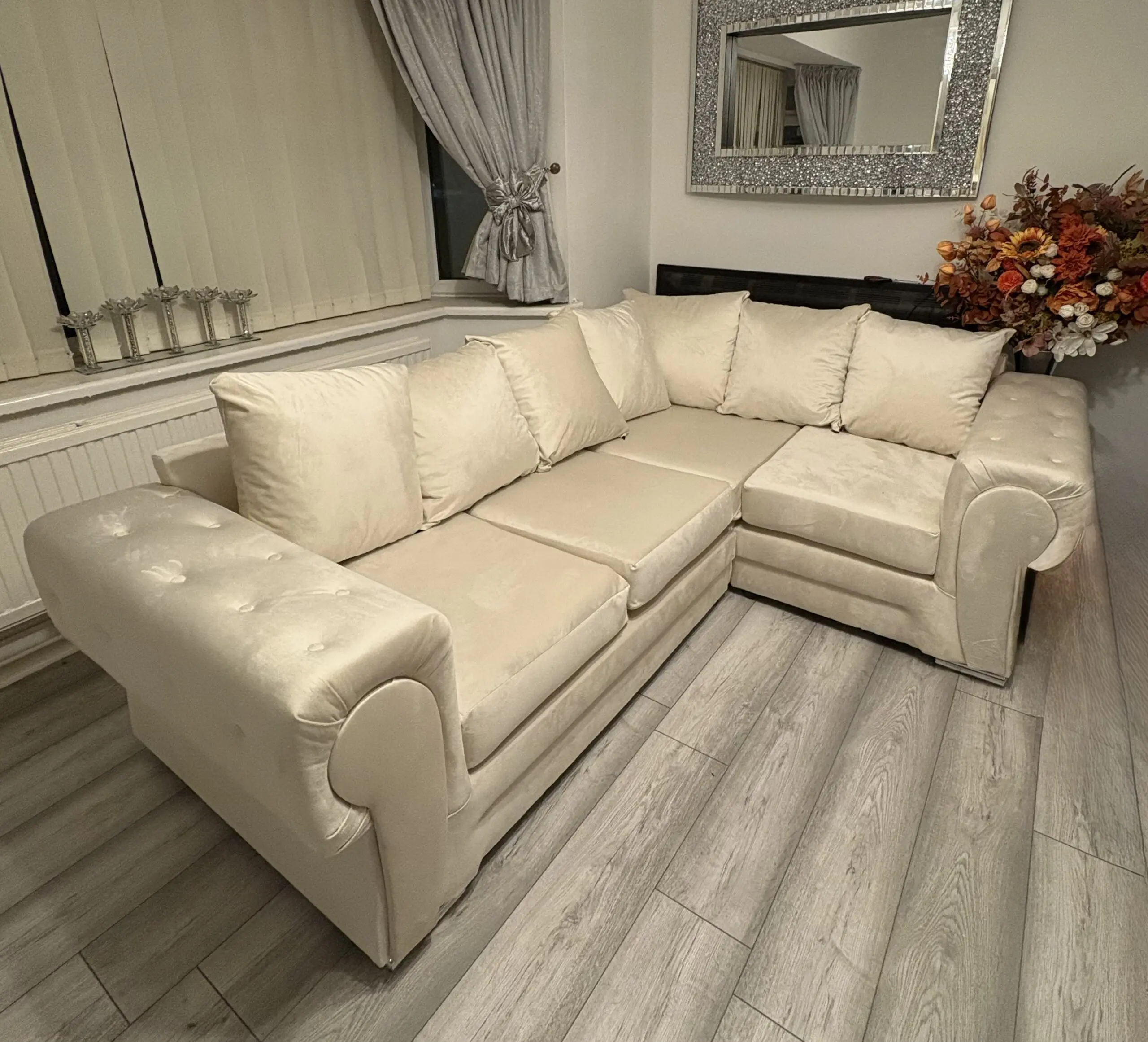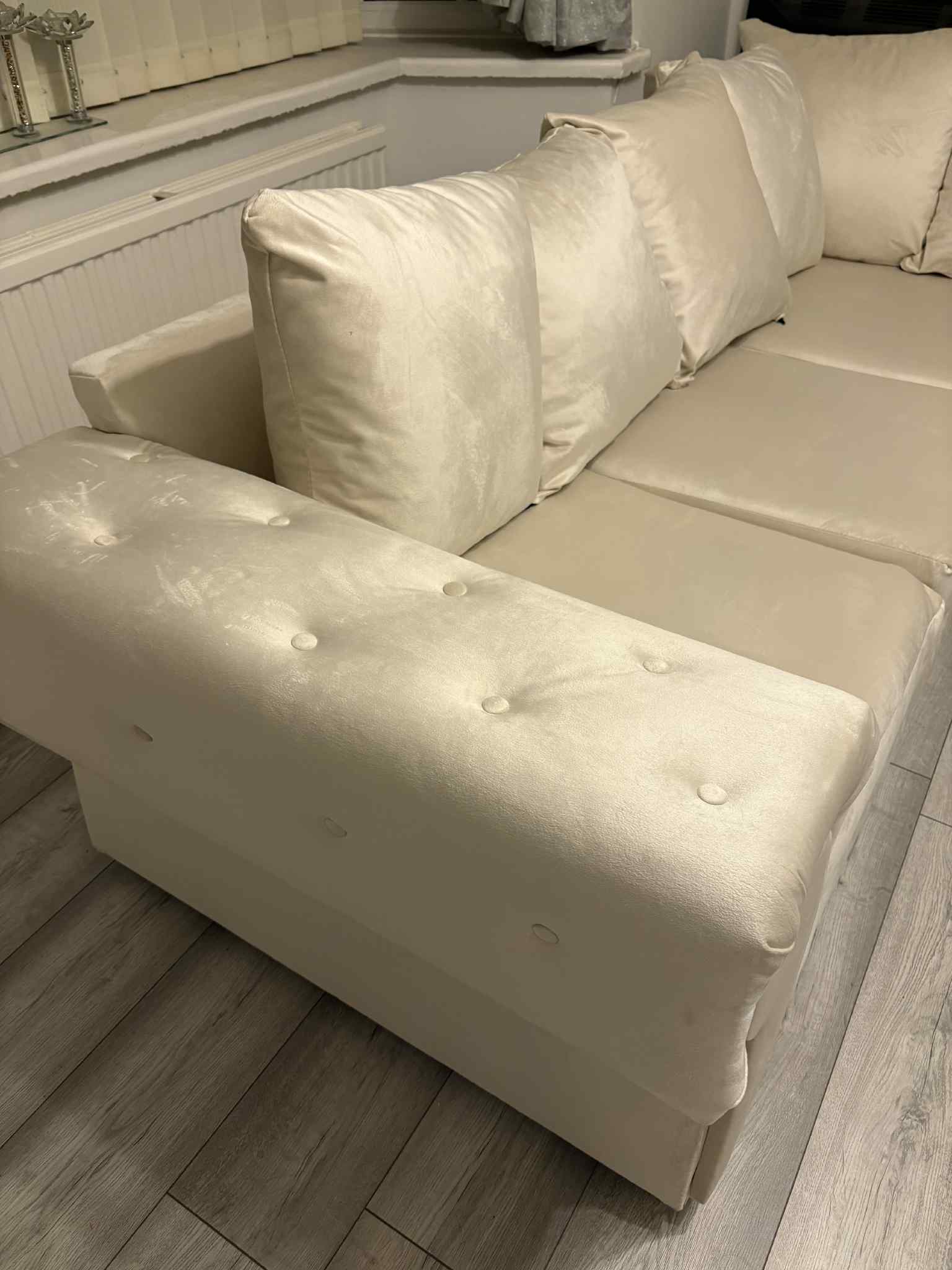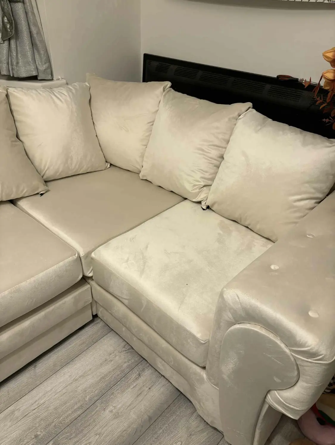 Only had a few days, cream corner sofa. Everything has been covered up. Selling due to being the wrong sofa. And the company refusing a refund. I have pets in my home but they never go in my living room which is where the sofa is. Thanks.
