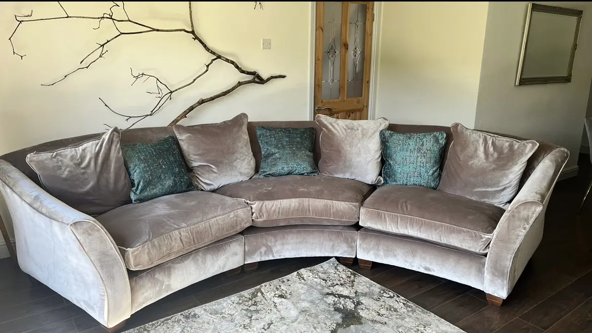 This is a curved plush sofa bought from Stollers. In great condition as kept with throws over for protection.