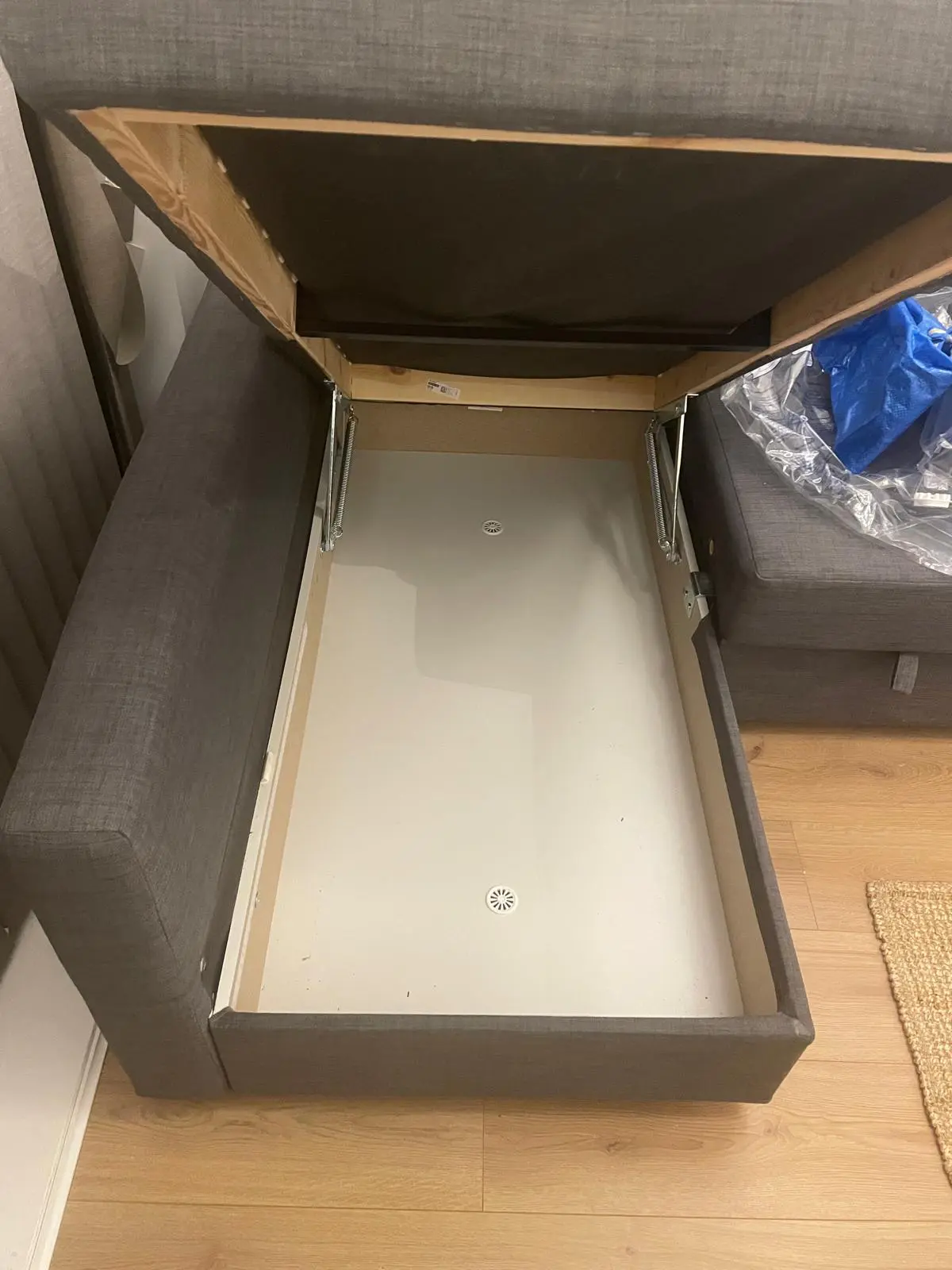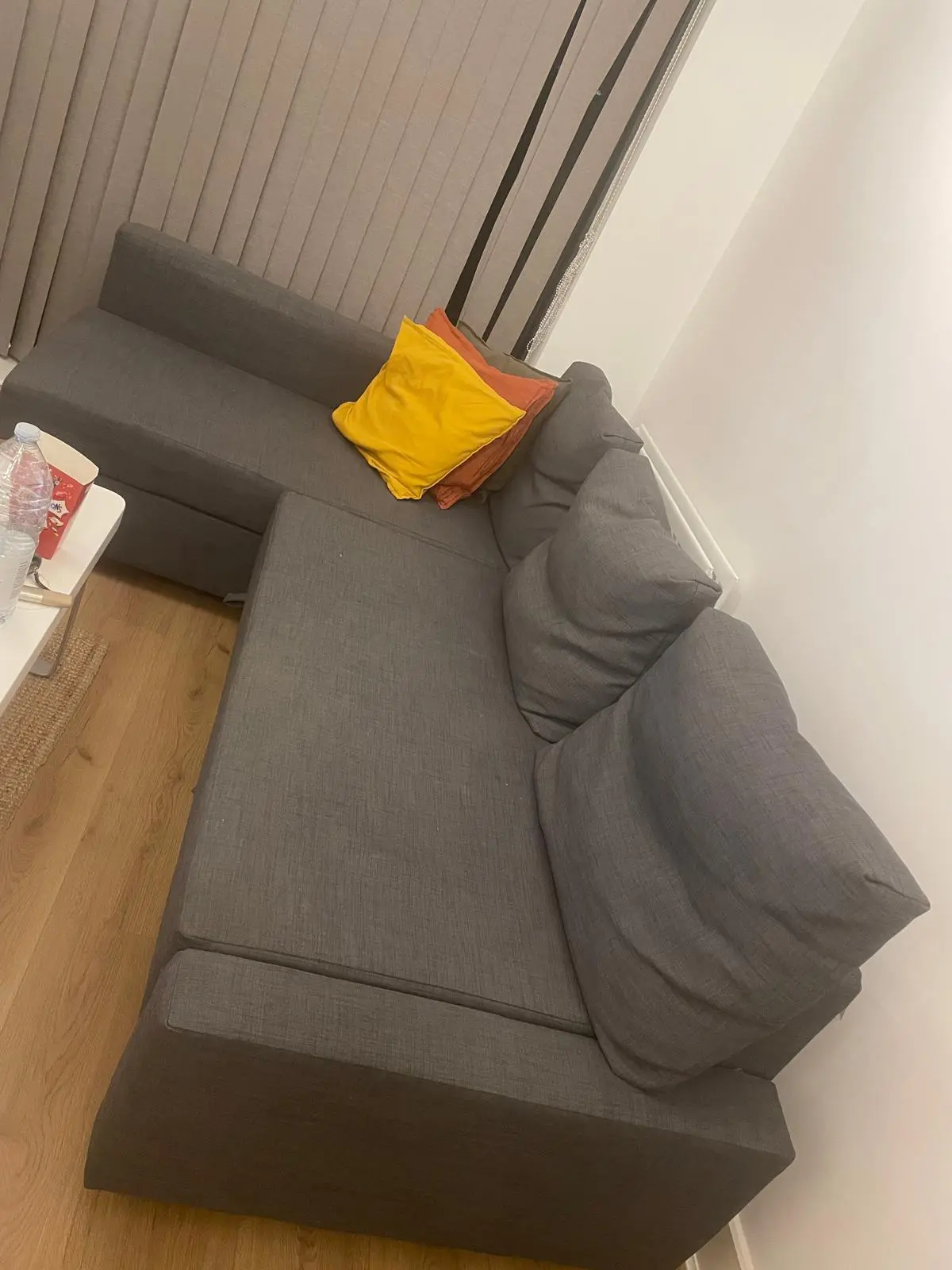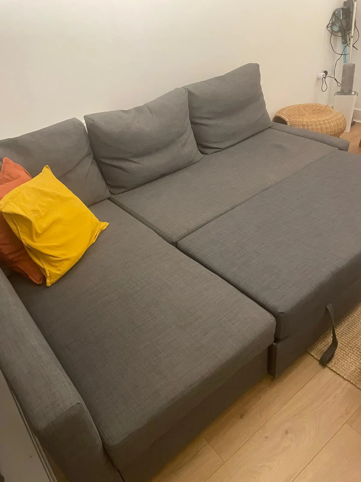 dark grey corner sofa bed, it has storage place under. 2 people can easily sleep when it turns to bed.