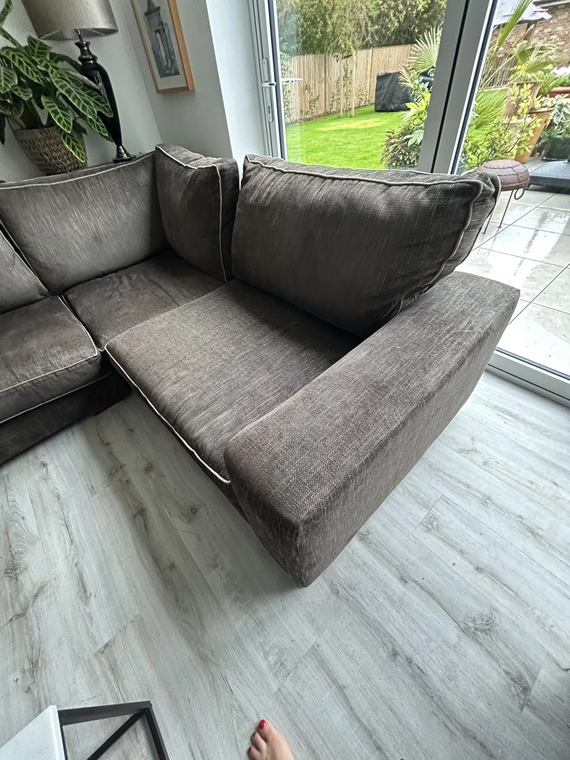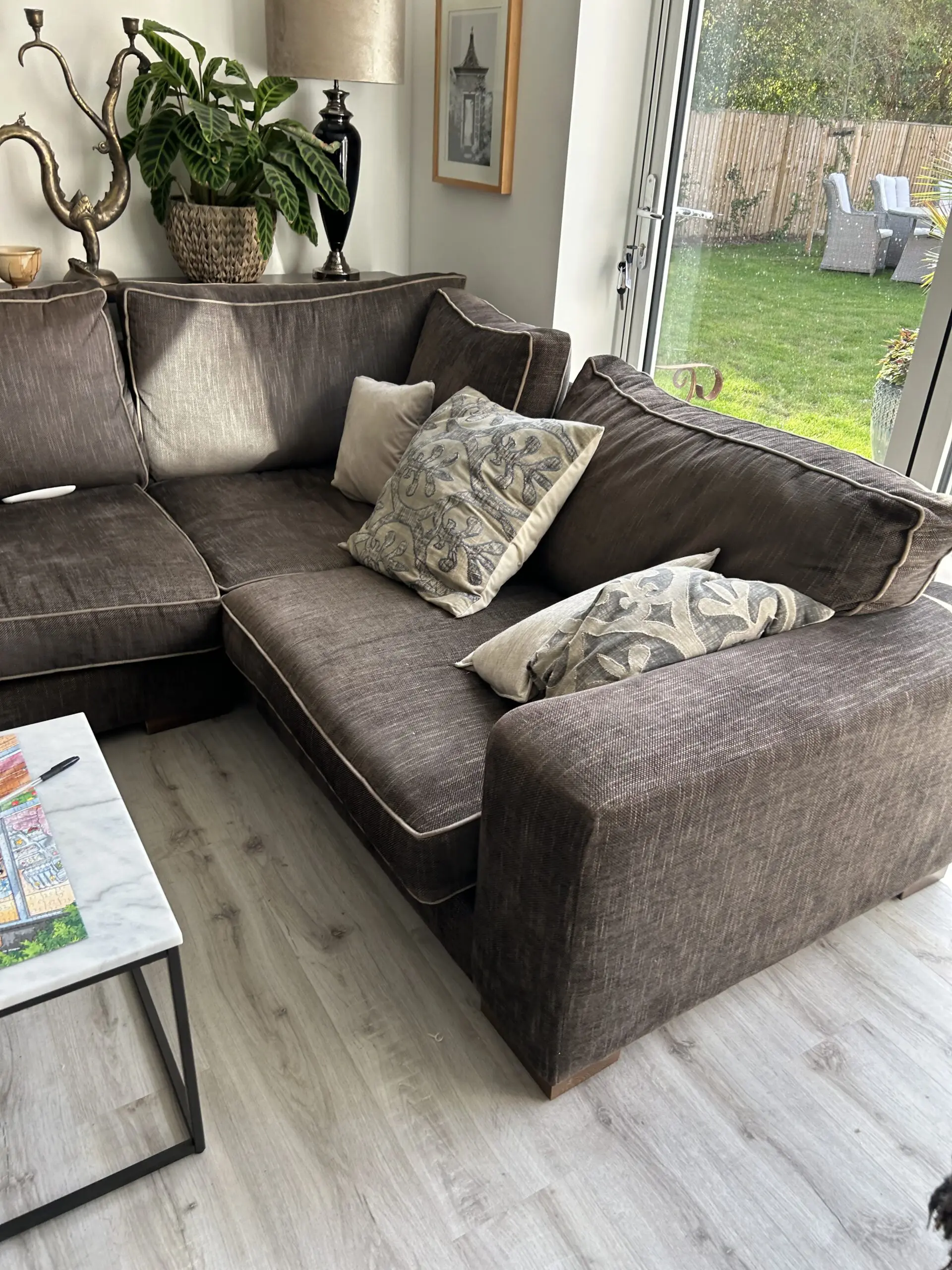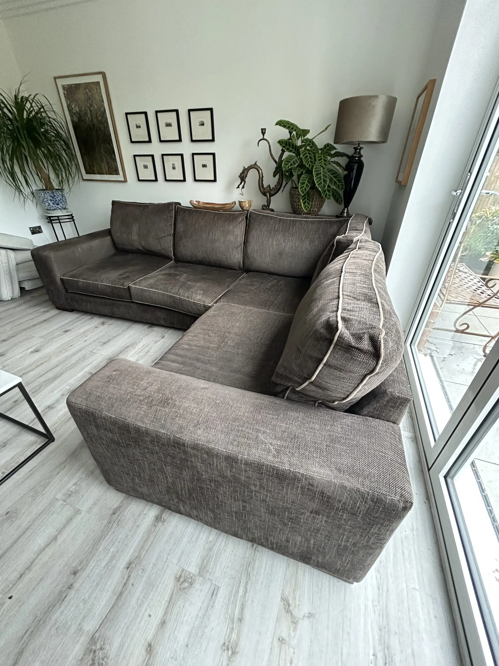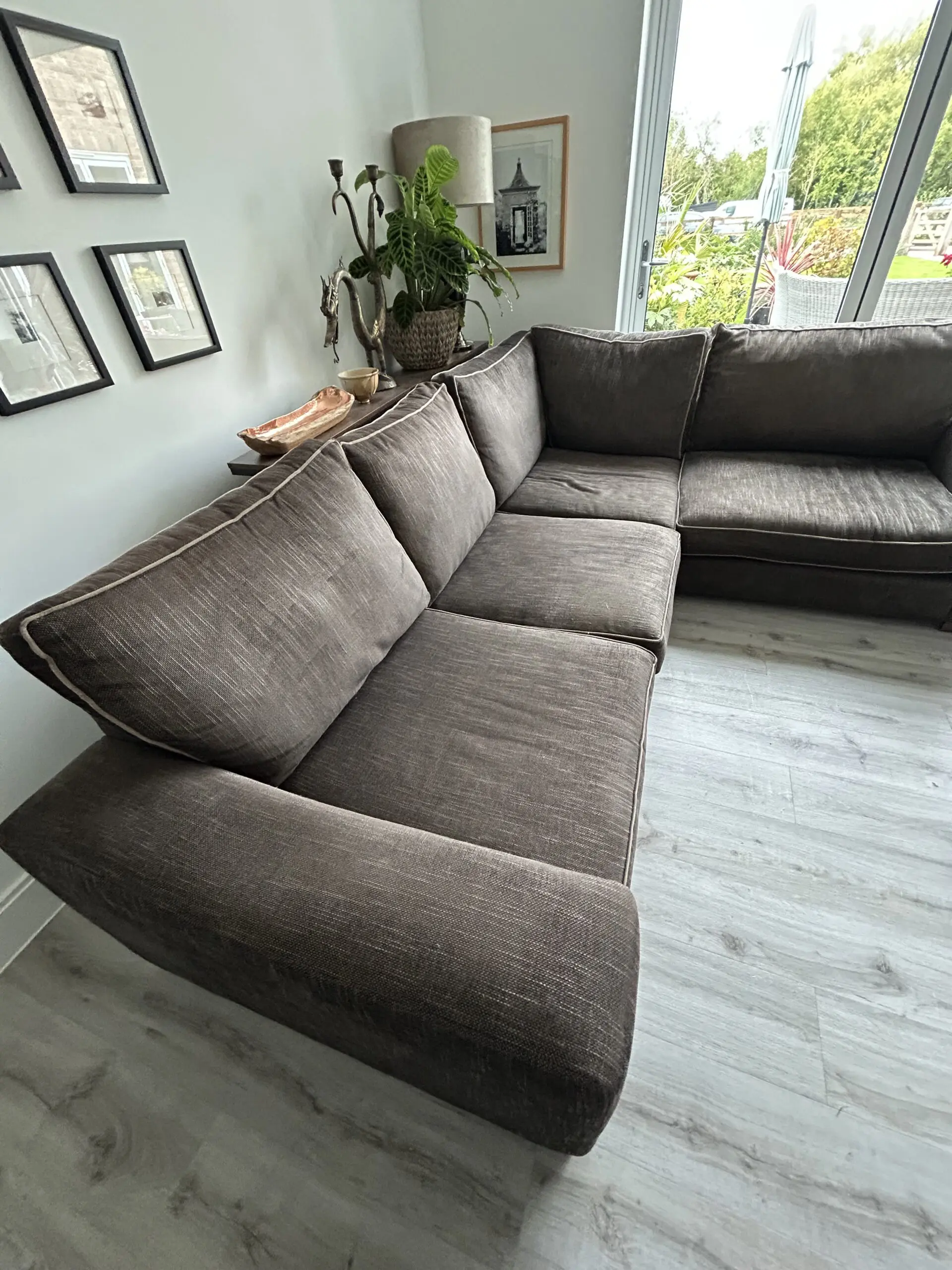 The Darlings of Chelsea Brown Corner Sofa is a stylish and contemporary piece of furniture perfect for any living room. With a modern square arm style and brown upholstery made from 100% cotton, this sofa exudes a contemporary feel. The sofa seats up to 5 adults comfortably. Crafted in the United Kingdom, this spacious sofa measures 280cm in length, 86cm in height, and 226cm in width, making it a perfect addition to any home looking to add a touch of sophistication. Sight dip in arm as shown in photo. Approx 6 years old.