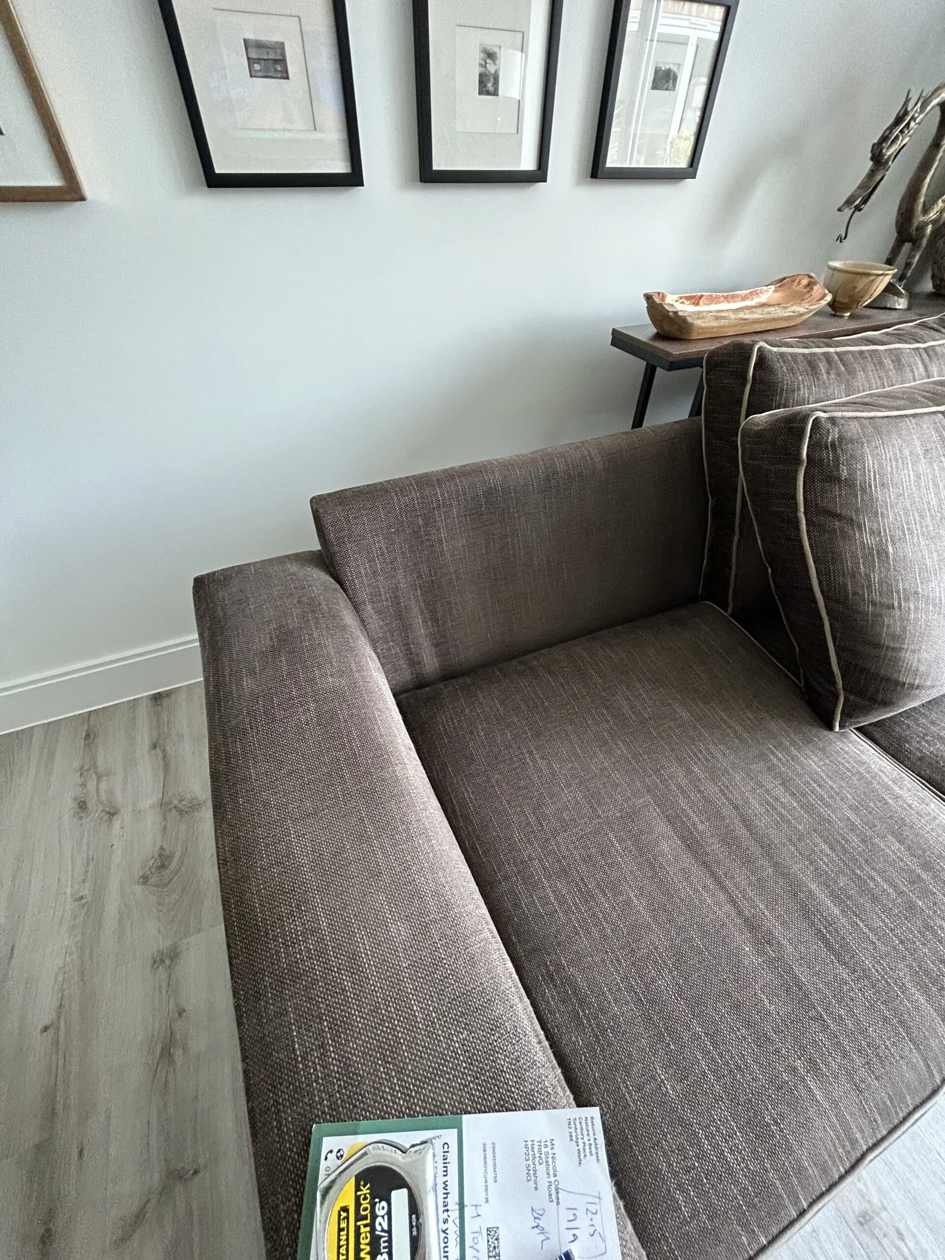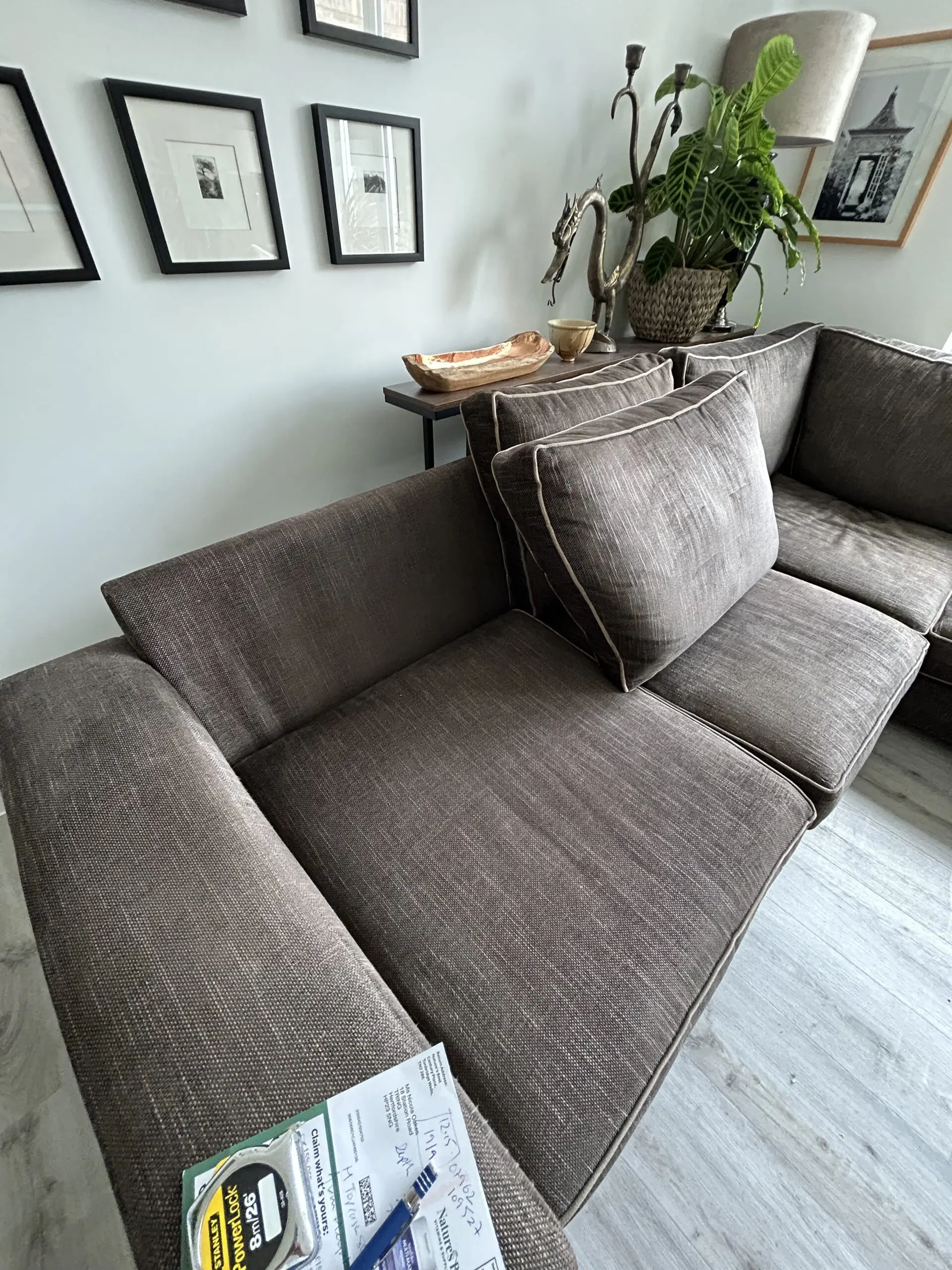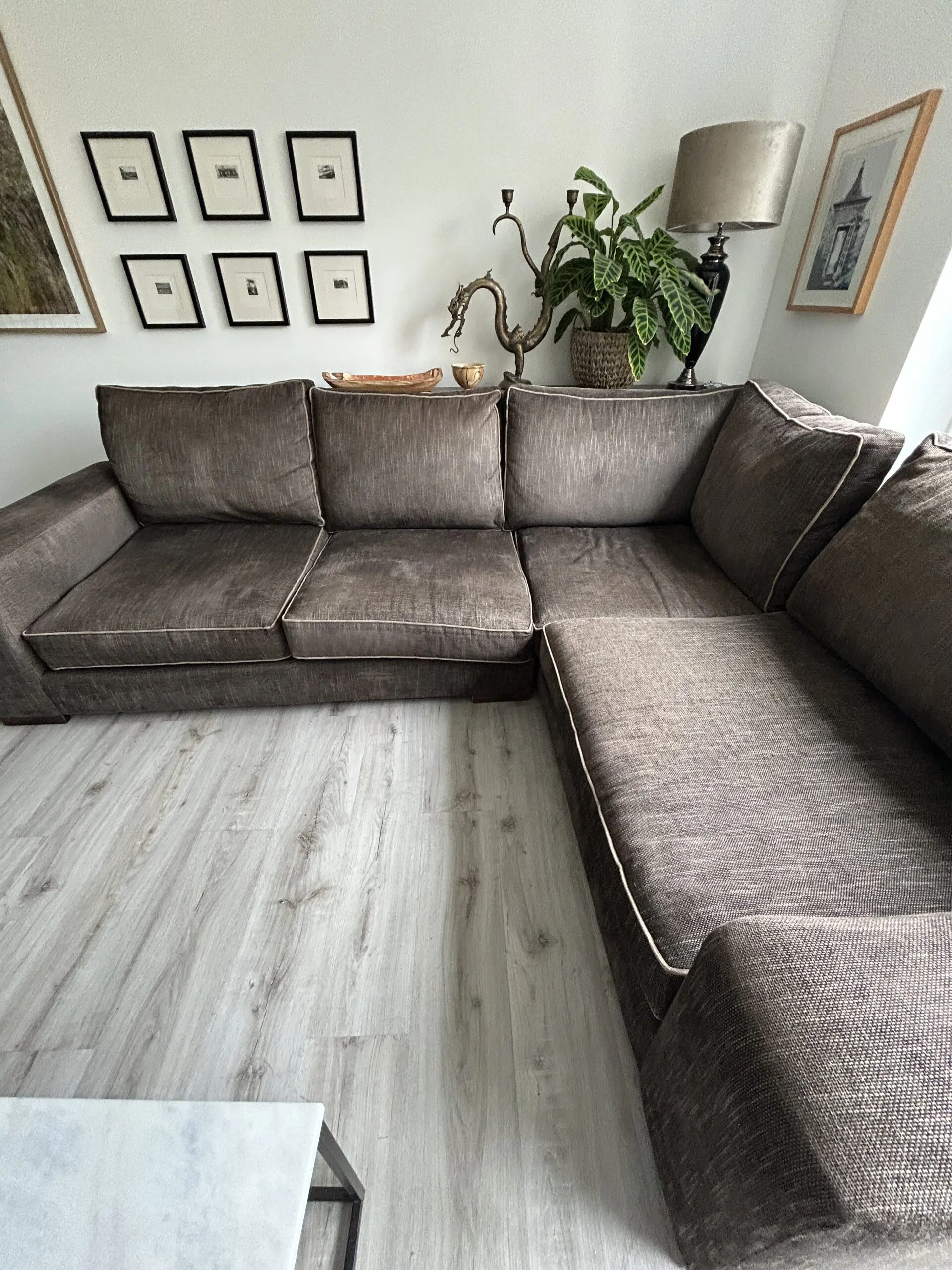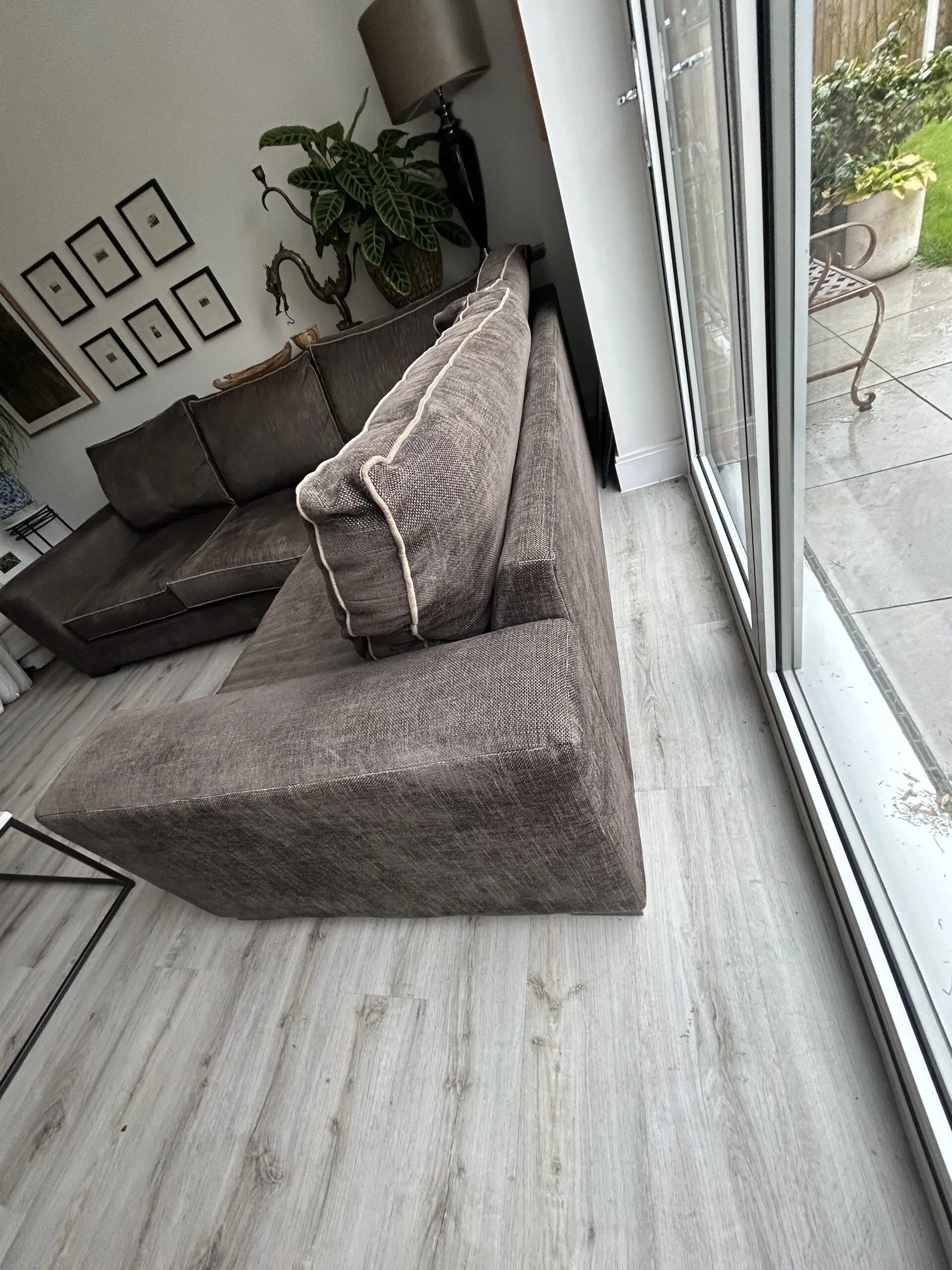 The Darlings of Chelsea Brown Corner Sofa is a stylish and contemporary piece of furniture perfect for any living room. With a modern square arm style and brown upholstery made from 100% cotton, this sofa exudes a contemporary feel. The sofa seats up to 5 adults comfortably. Crafted in the United Kingdom, this spacious sofa measures 280cm in length, 86cm in height, and 226cm in width, making it a perfect addition to any home looking to add a touch of sophistication. Sight dip in arm as shown in photo. Approx 6 years old.