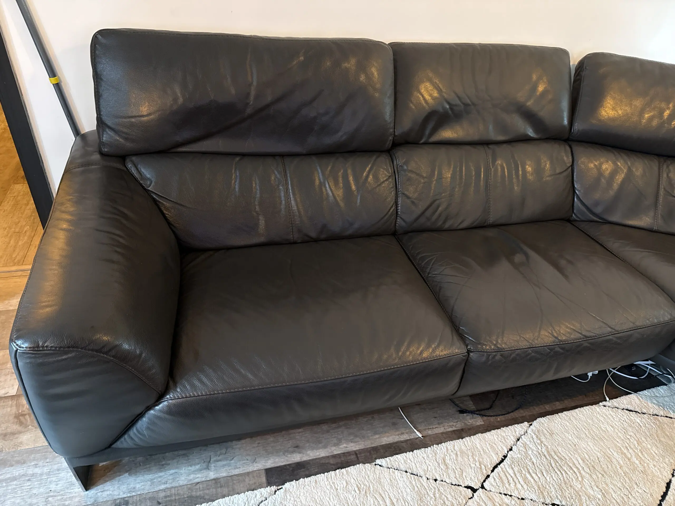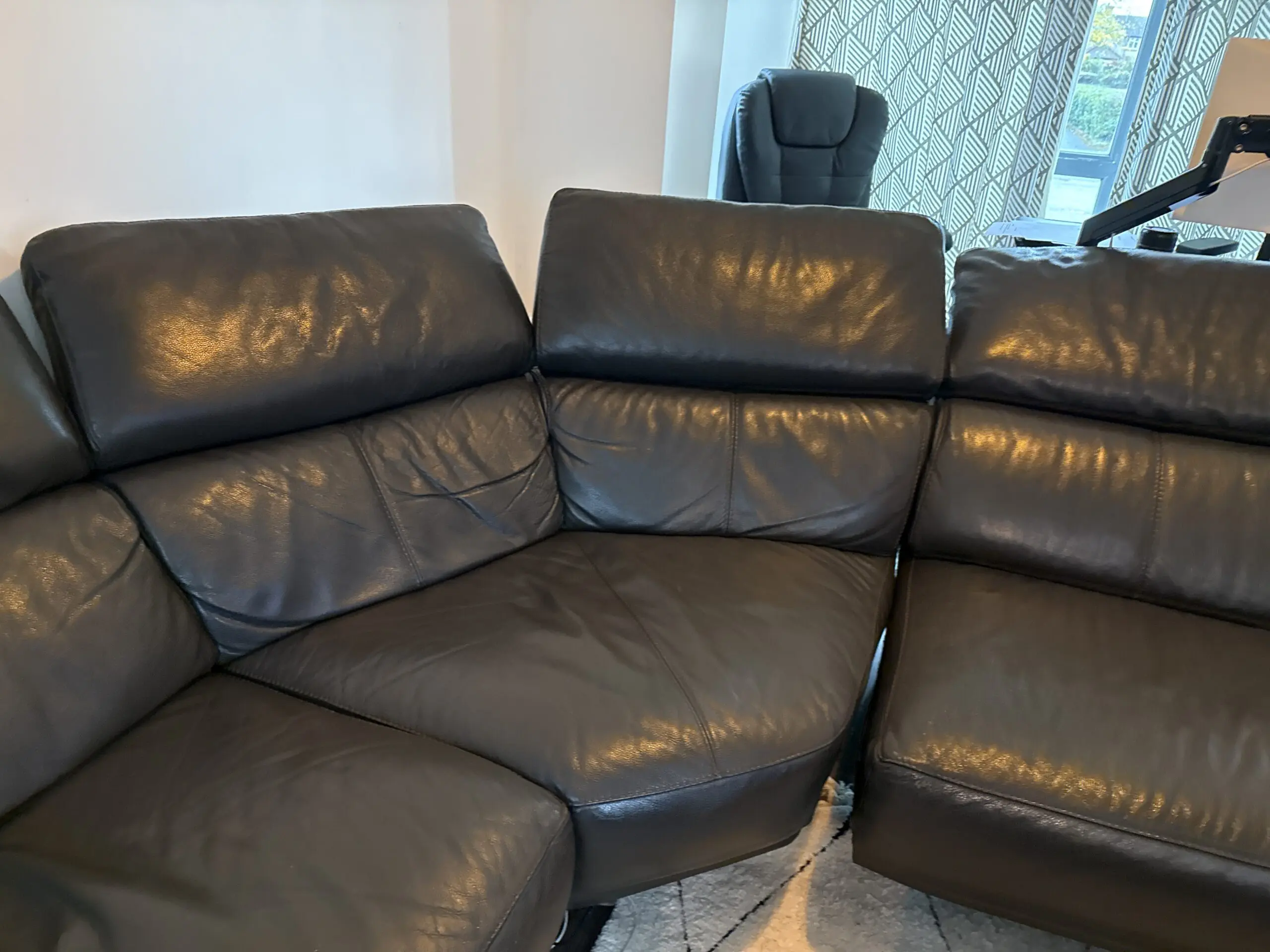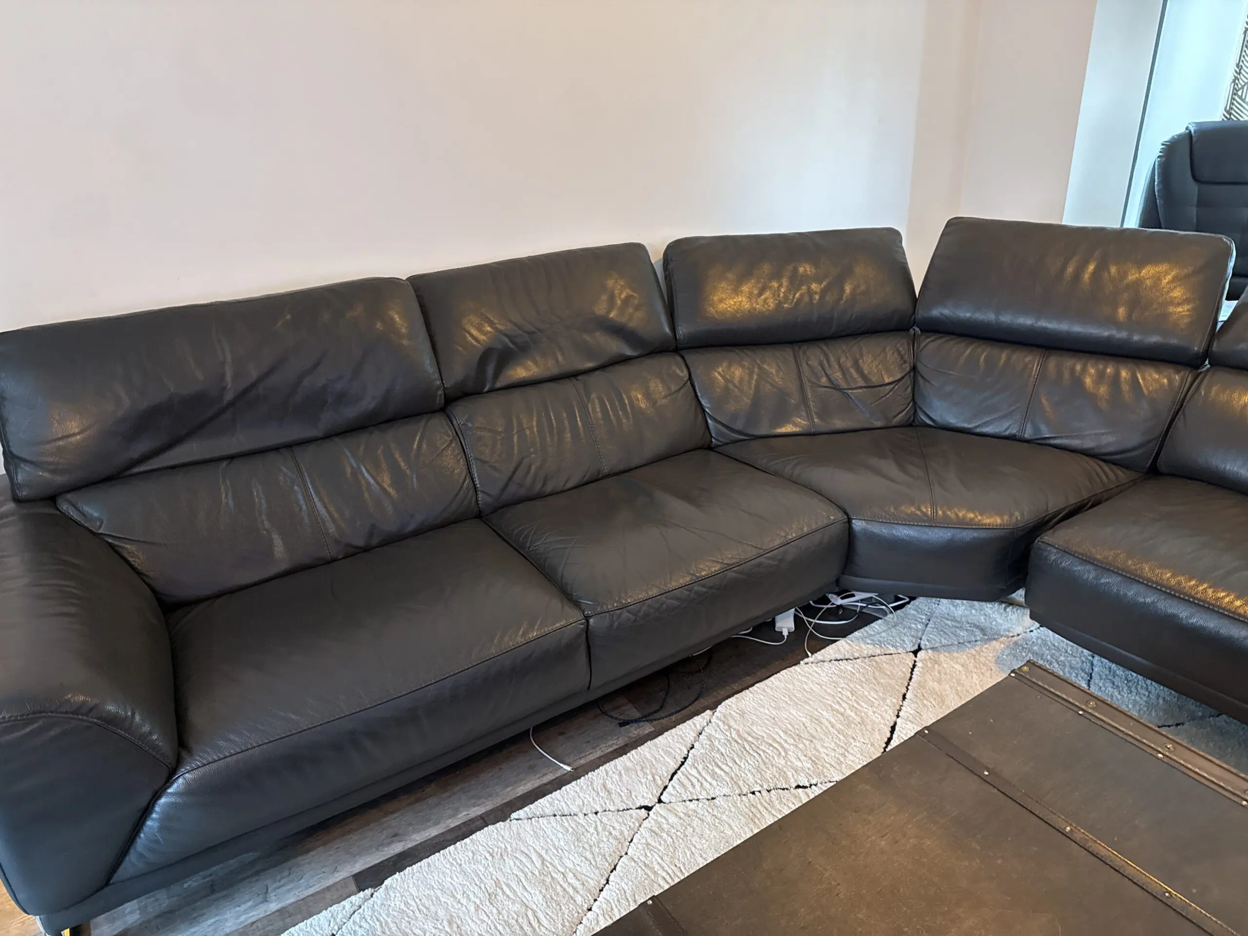 Large genuine leather Black corner sofa, good condition, no smokers, no pets. Easy to remove, disassemble in 3 parts