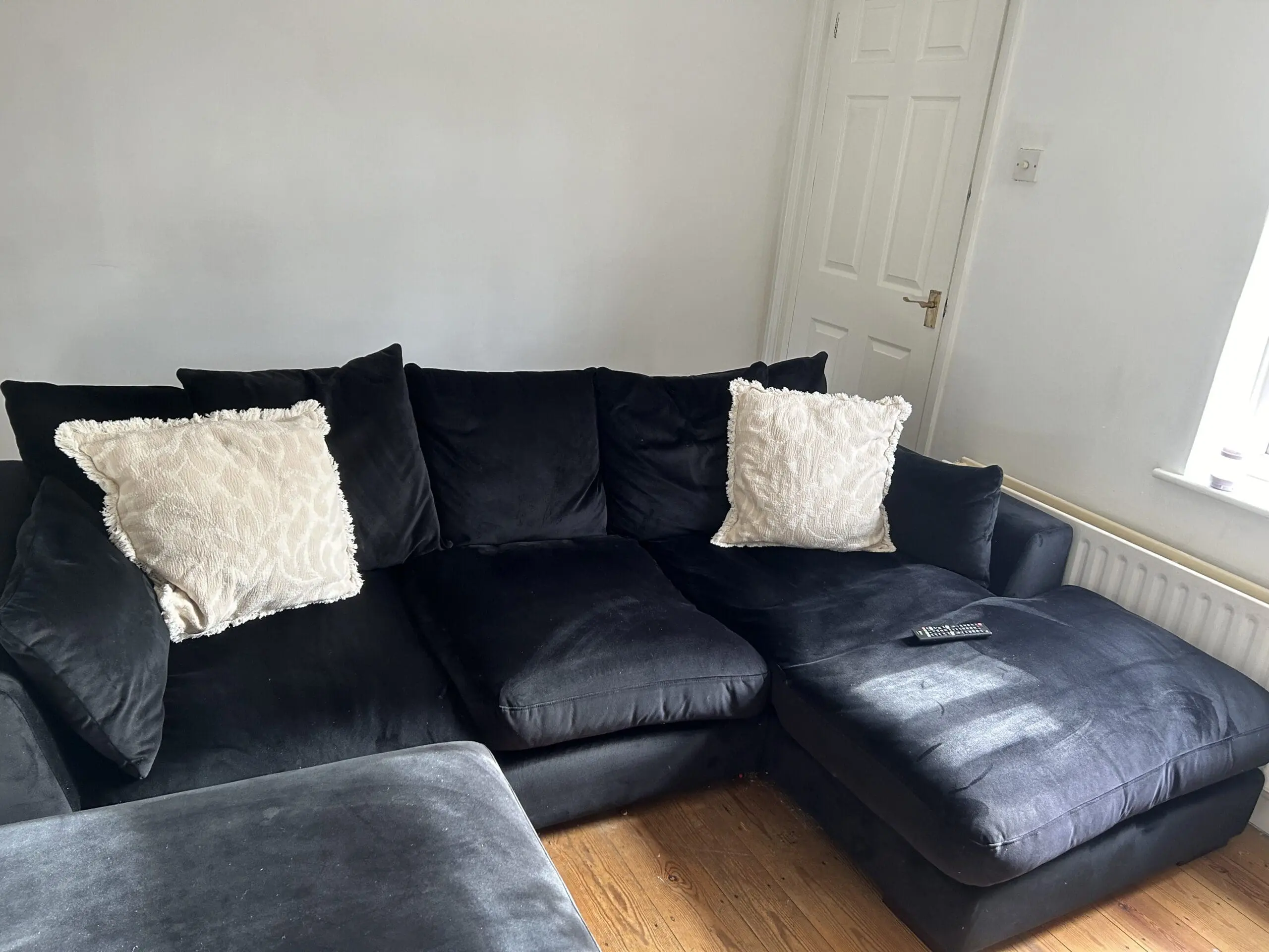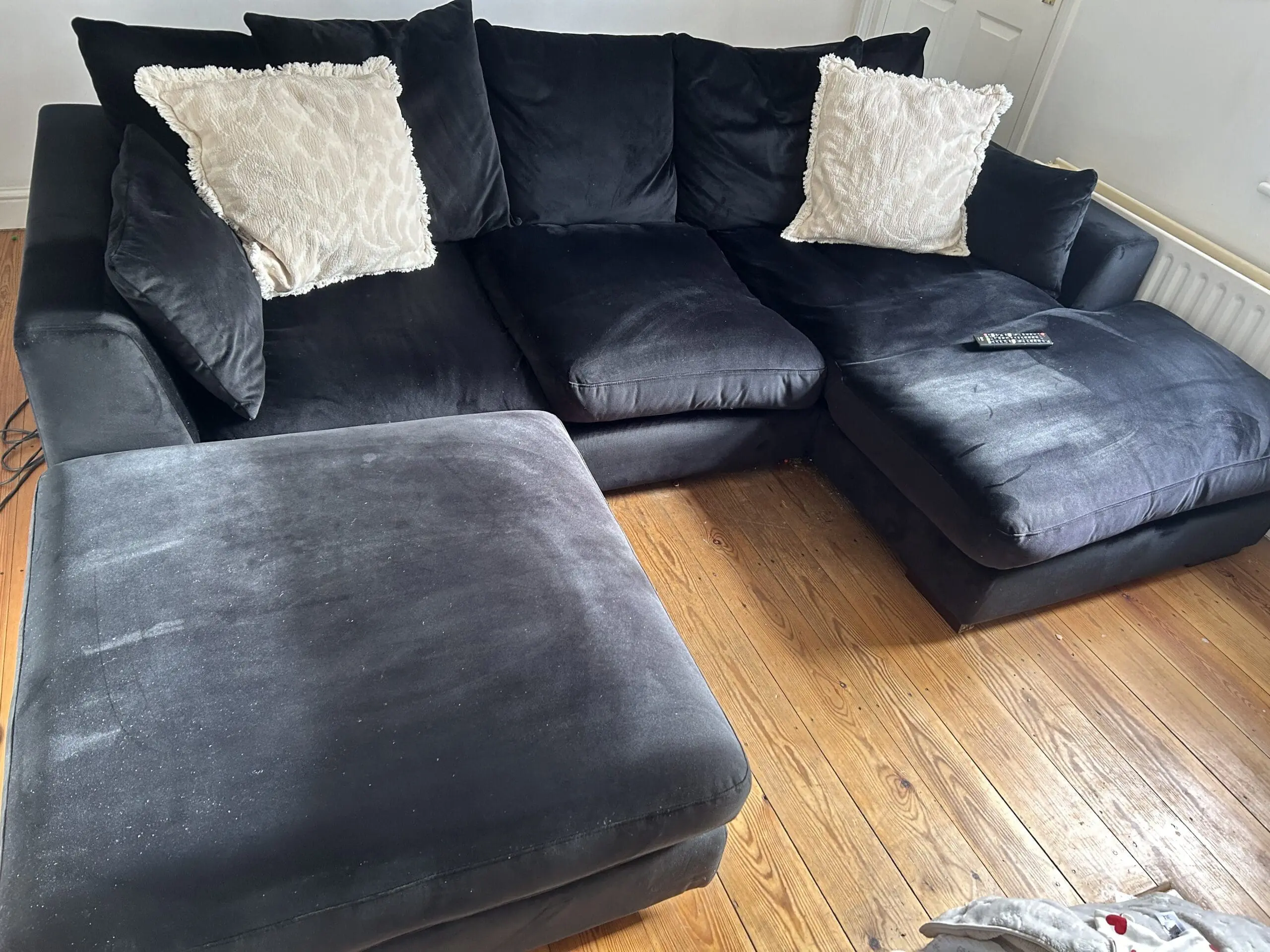 Only had for a couple of years, easy clean black velvet fabric. With footstool as well.