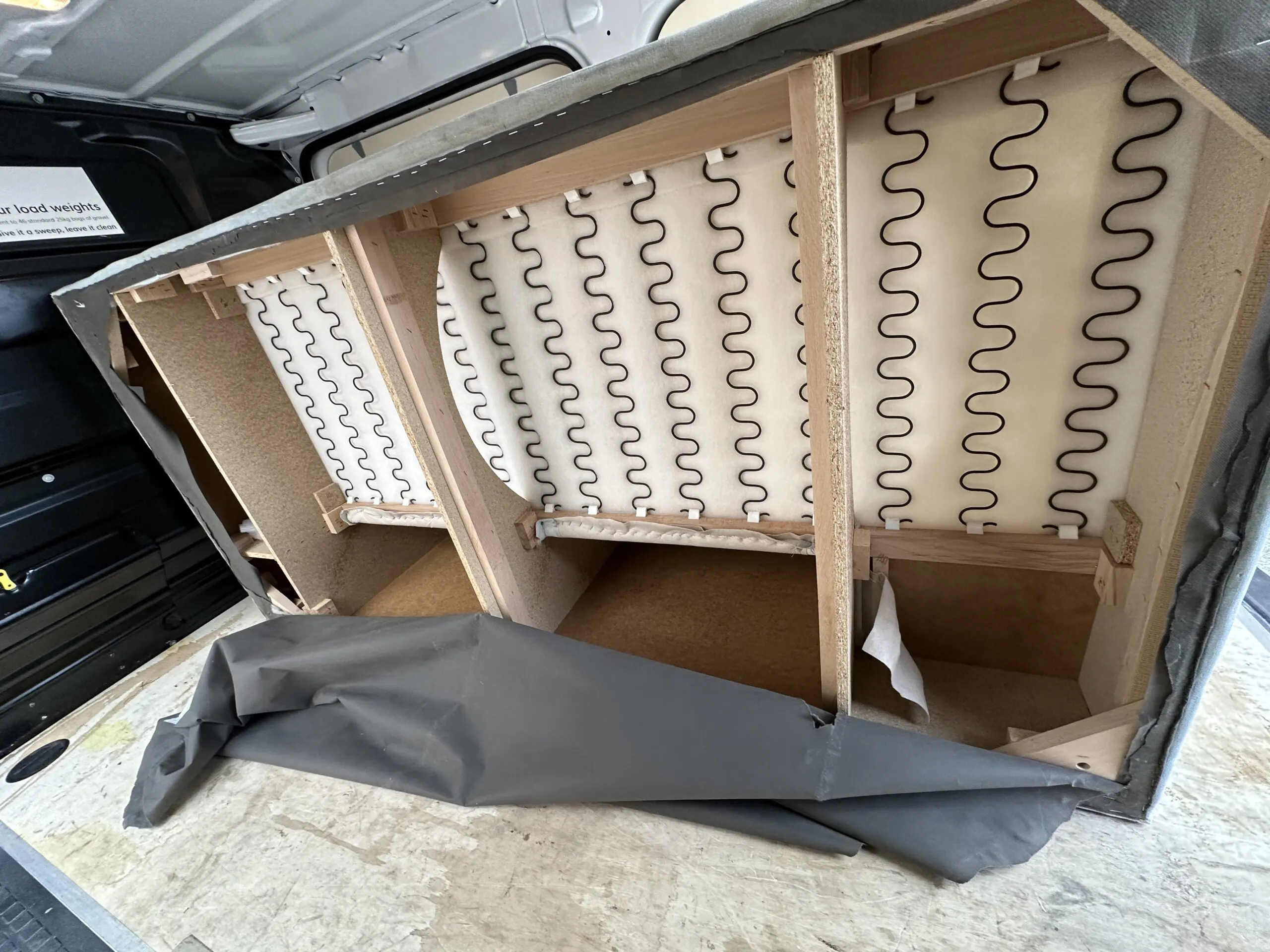 Blue orka sofa in solid condition. The fabric at the bottom is purposefully ripped to see structure, no other faults.