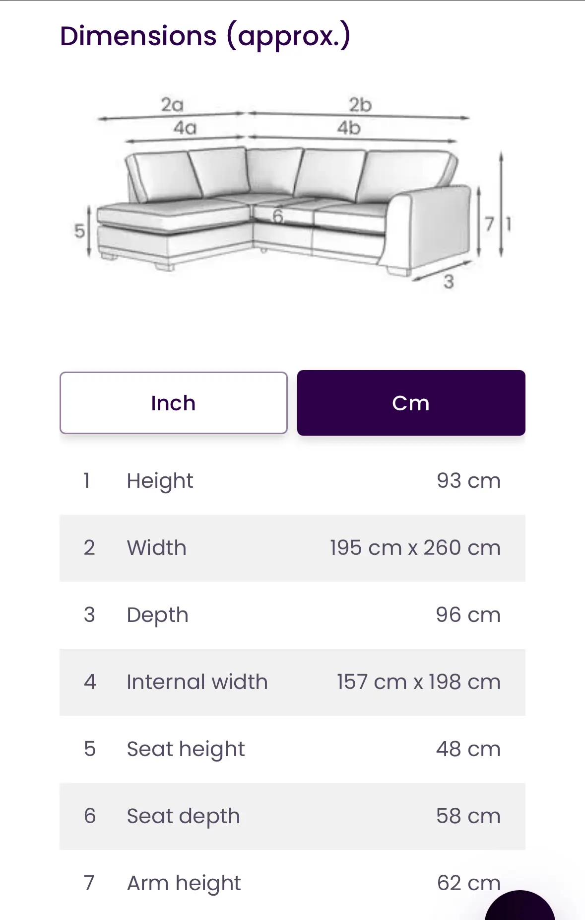 Right Hand Facing Arm Open End Corner Sofa With storage footstool. See all pictures for complete dimensions on the sofa.