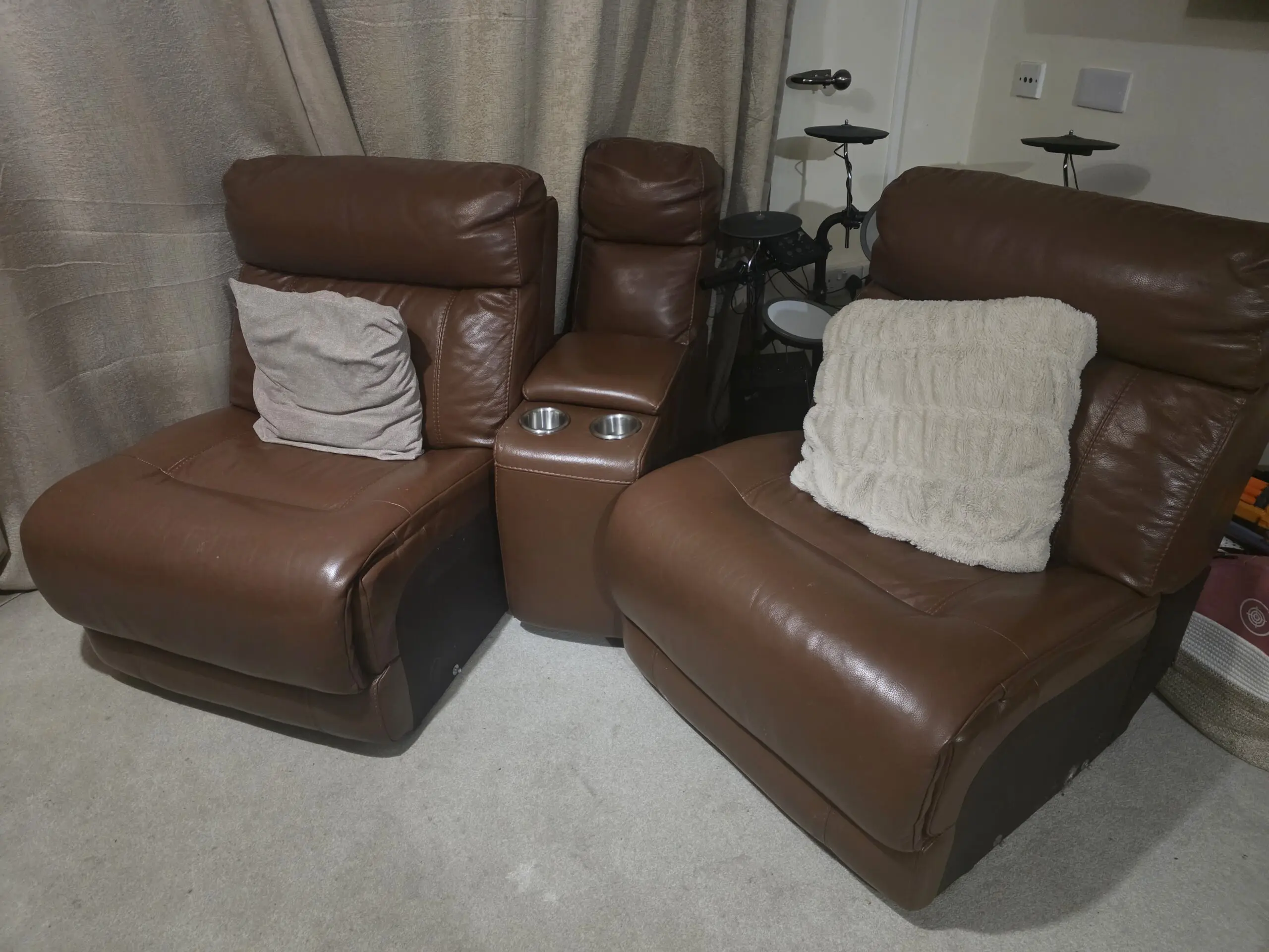 Sections all come apart so can configure how you please. Pics show not in full as I can’t put in full in new house. Biggest sections are the 2 x recliner sections which are 97cm by 97cm the whole sofa all together with console unit is probably about 223cm by 330cm.